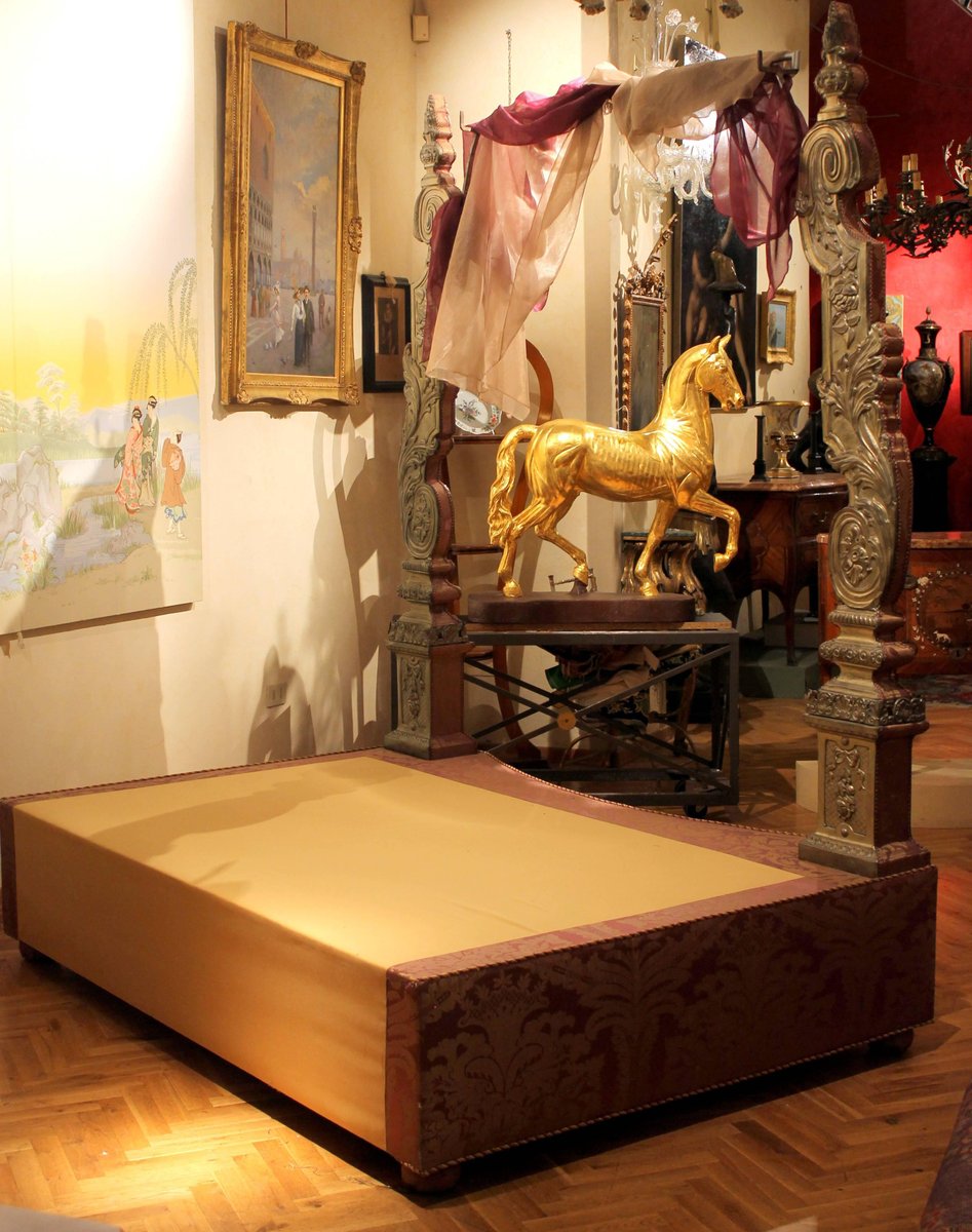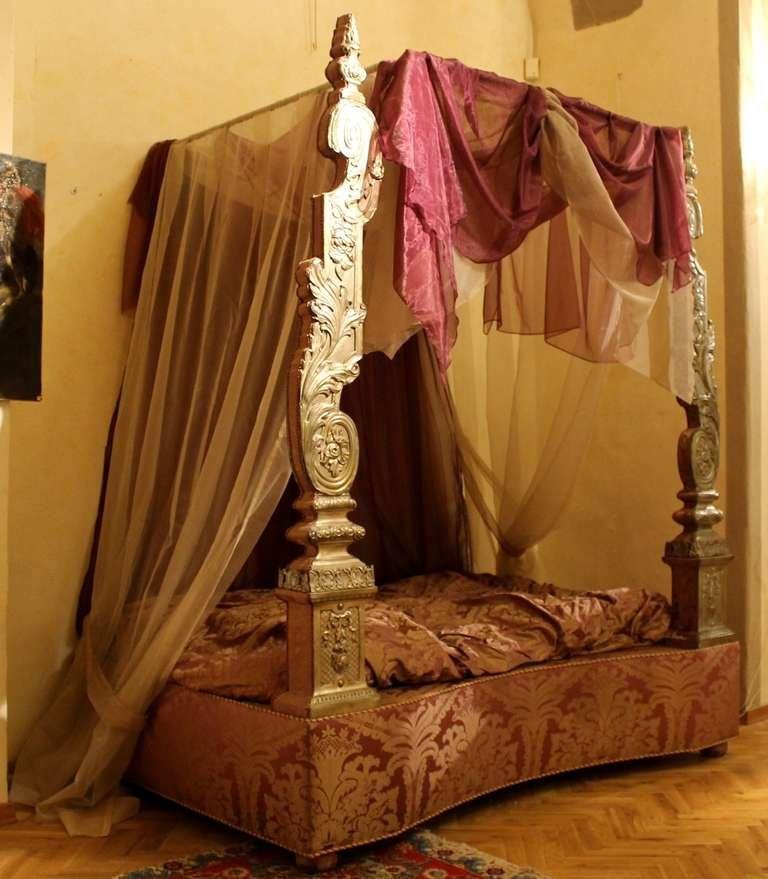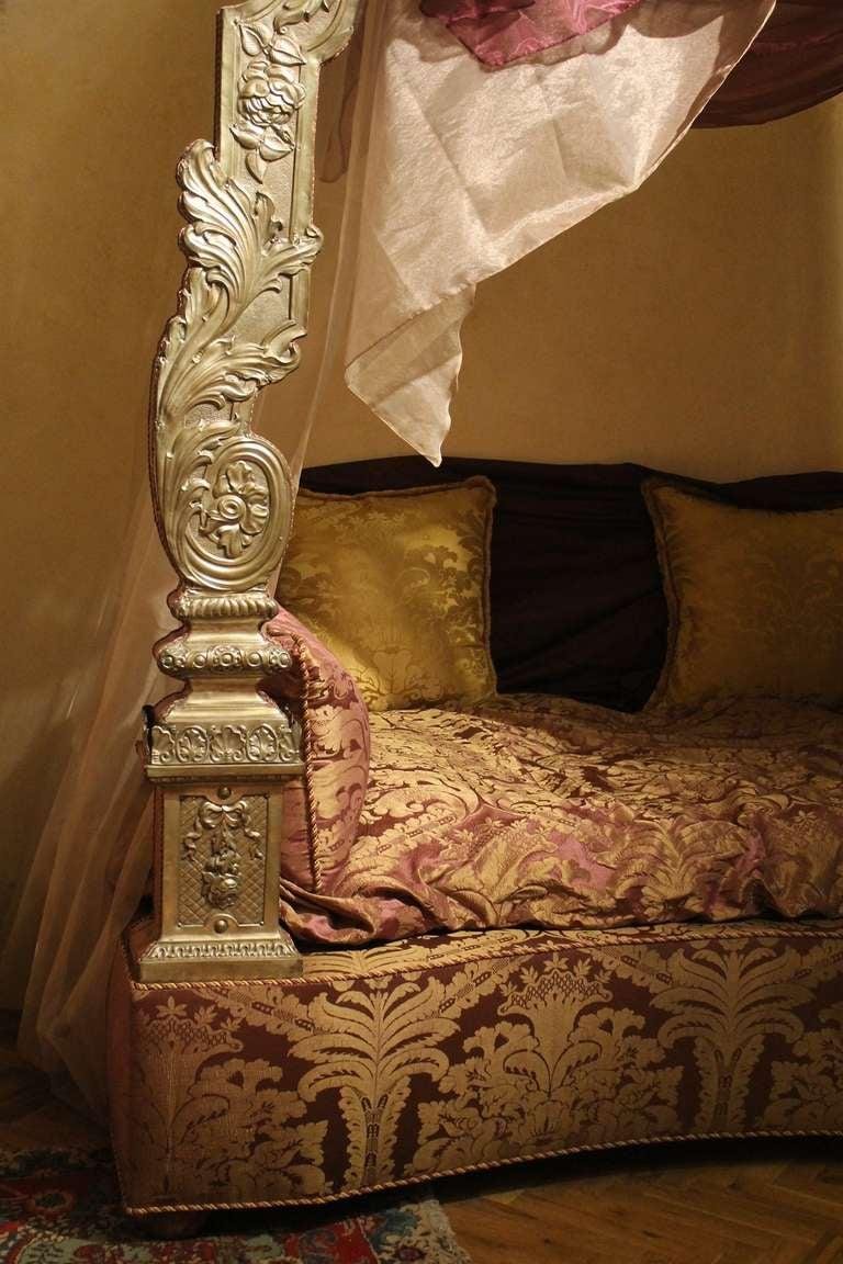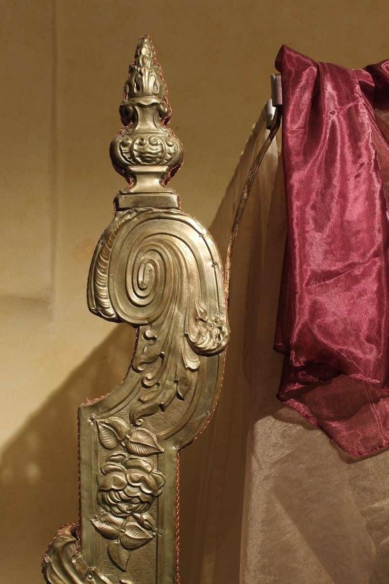 19th Century Italian Canopy Bed with Silver Friezes and Upholstered Purple Silk