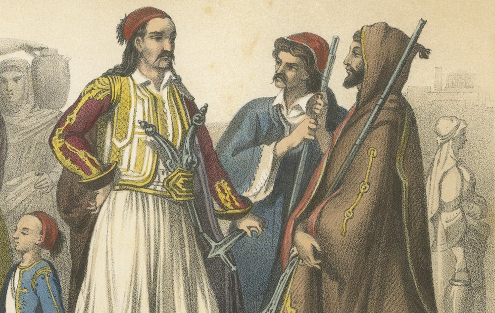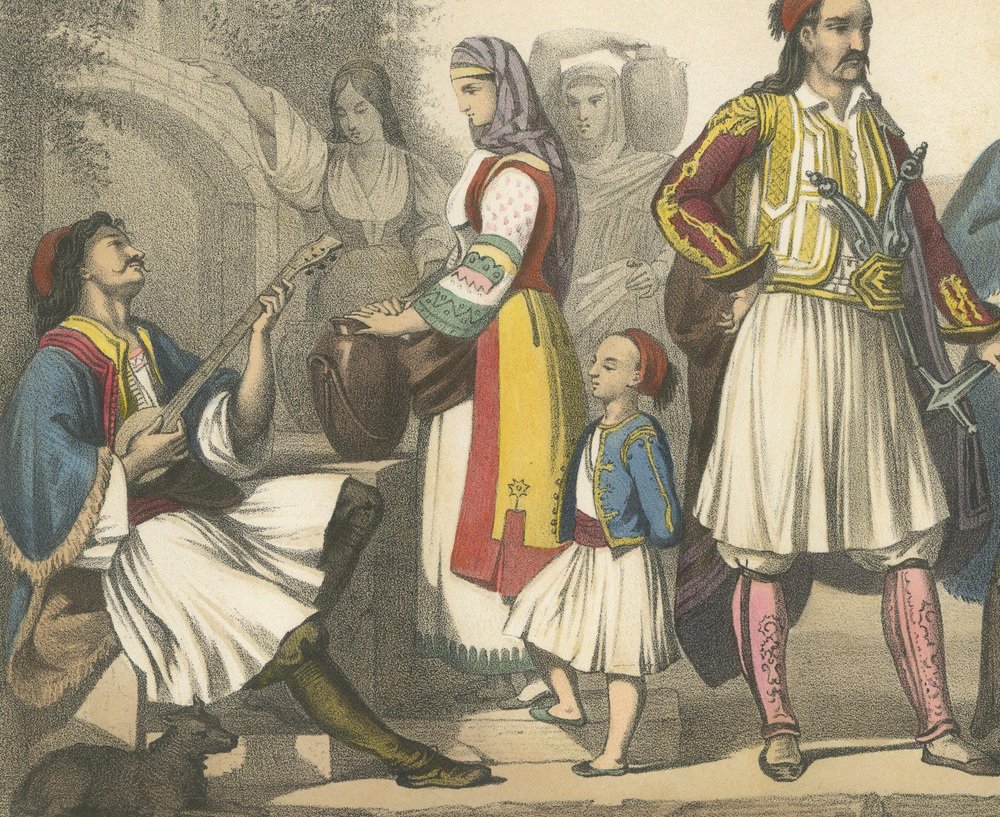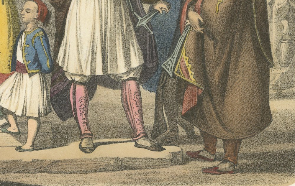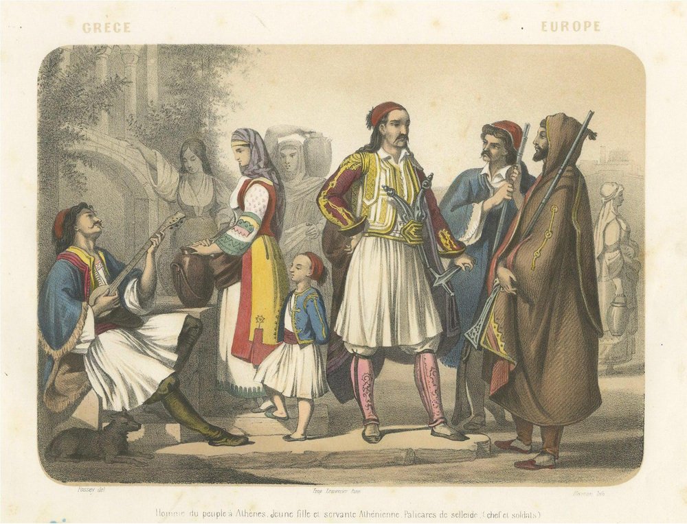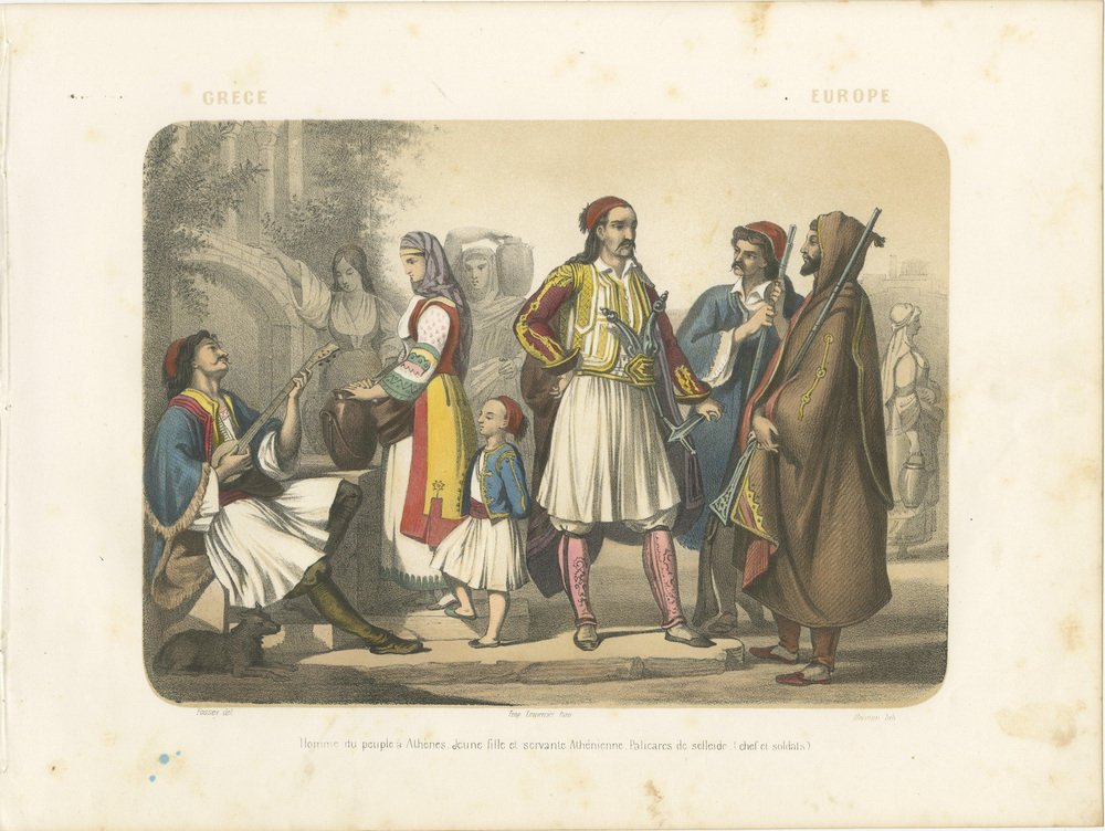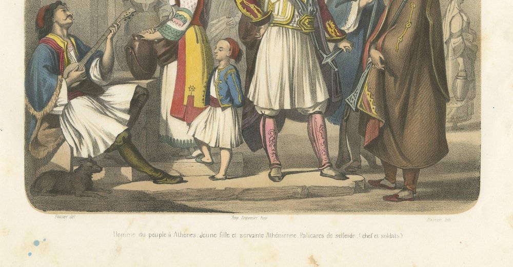 Title: Greek Costumes – Athenians and Palicars of Selléide, c.1845 : This splendid hand-colored lithograph, titled “Grèce – Europe,” originates from the 19th-century French publication Le Monde en Estampes: Types et Costumes des Principaux Peuples de l’Univers, published in Paris circa 1845–1850 by Amédée Bedelet. Drawn by Fossey, lithographed by J. Bocquin, and printed by Lemercier, this series stands among the finest visual records of global costume traditions produced in mid-19th-century France. The scene vividly illustrates traditional Greek attire shortly after the country’s independence from Ottoman rule, when national dress became a proud symbol of identity and freedom. At the center stands a Palicar de Selléide (chief of soldiers), commanding in his white pleated fustanella, richly embroidered waistcoat, and red cap, while his companion soldiers, or palicars, stand beside him in matching martial dress, armed with sabers and long rifles. Their bold stances and elaborate garments evoke the heroism of the Greek War of Independence (1821–1829), celebrated in contemporary European art and literature. To the left, a seated homme du peuple à Athènes strums a stringed instrument, serenading a young fille Athénienne carrying a water jar, her attire marked by a vibrant apron and embroidered sleeves. A small child beside her wears a miniature version of the traditional Greek costume, complete with the short white skirt. On the far right, a cloaked servante Athénienne converses quietly, her brown robe and veil suggesting modesty and devotion. The architecture in the background—classical arches and stone walls—reinforces the link between modern Greece and its ancient heritage, while the warm palette of reds, golds, and blues infuses the image with vitality. The lithograph reflects both ethnographic interest and the Romantic fascination with Greece as the cradle of civilization and modern heroism. Le Monde en Estampes sought to present the people of all nations through their costumes and customs, and this Greek plate stands among its most striking, combining authenticity with artistic elegance. Condition report: Good impression with bright, well-preserved colors. Minor foxing and light age toning mostly to margins, image area clean. Full margins intact. Framing tips: Best presented with a cream or ivory mat and a gilt or dark walnut frame. For a dramatic effect, a deep blue inner mat enhances the Greek national colors and highlights the vivid tones of the fustanella and embroidered garments. Technique: Hand-colored lithograph Maker: J. Bocquin after Fossey, printed by Lemercier, Paris, circa 1845