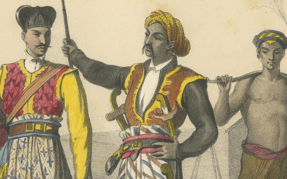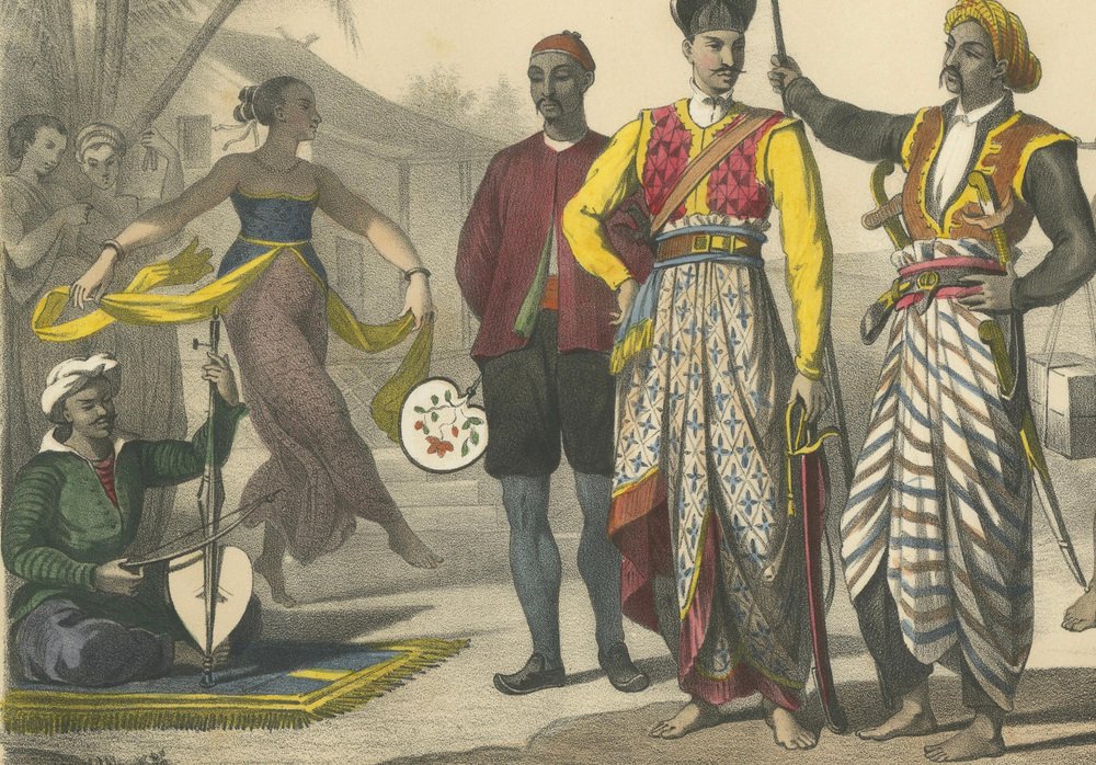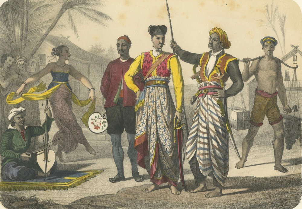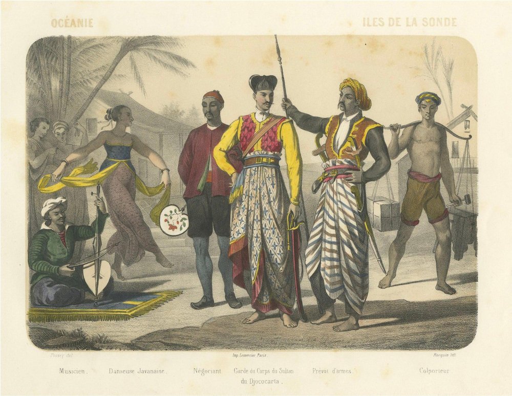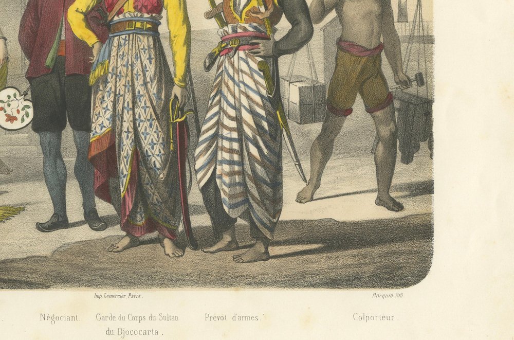 Title: Javanese Court Scene – Musician, Dancer, and Sultan’s Guard, c.1845 : This vibrant hand-colored lithograph, titled “Océanie – Îles de la Sonde,” is from Le Monde en Estampes: Types et Costumes des Principaux Peuples de l’Univers, published in Paris circa 1845–1850 by Amédée Bedelet. Drawn by Fossey, lithographed by J. Bocquin, and printed by Lemercier, this plate beautifully captures the allure and exoticism of the Javanese world through the lens of 19th-century French Romanticism. The scene depicts a lively tableau from Java, one of the Sunda Islands, during the height of the island’s cultural splendor under the influence of both indigenous courts and colonial contact. At the left, a seated musicien plays a bowed string instrument resembling a rebab, his rhythmic accompaniment providing the melody for the graceful danseuse javanaise beside him. The dancer, elegantly poised, wears a transparent flowing sarong and a yellow sash that swirls around her arms, embodying both poise and motion in her traditional Javanese dance. At the center, richly attired figures display the grandeur of Javanese nobility and authority. The négociant (merchant) stands in conversation with a garde du corps du Sultan du Djococarta (bodyguard of the Sultan of Yogyakarta), whose regal bearing and luxurious patterned garments indicate his high rank. Beside them, the prévôt d’armes (chief of arms) holds his staff with dignity, his turban and sash emphasizing his elevated position within the royal entourage. To the right, a colporteur (peddler) carries his wares balanced on a bamboo pole, symbolizing the trade networks that connected the Javanese islands with the broader archipelago and beyond. In the background, palm trees and bamboo huts evoke the tropical landscape of Java, while hints of architecture suggest the Sultan’s palace grounds. The composition is both decorative and documentary, blending ethnographic observation with the Romantic fascination for the “Oriental world.” The fine detailing of the costumes—particularly the rich textiles and patterns of batik and songket—reflects the high craftsmanship of Javanese attire. Fossey’s careful drawing and Bocquin’s lithographic precision bring each figure to life, while Lemercier’s masterful printing achieves remarkable depth and luminosity in color. This plate is an exceptional representation of how mid-19th-century French artists interpreted the diversity and refinement of Southeast Asian culture, combining artistry with curiosity about distant lands. Condition report: Excellent impression with strong, original hand-coloring. Minor foxing limited to margins; image area crisp and bright. Wide borders preserved. Framing tips: Ideal with a warm cream or pale sand mat and a dark teak or ebony frame. A narrow gold inner mat can complement the rich yellows and reds of the dancers’ garments. Technique: Hand-colored lithograph Maker: J. Bocquin after Fossey, printed by Lemercier, Paris, circa 1845