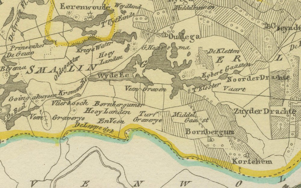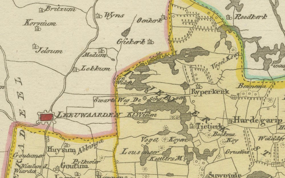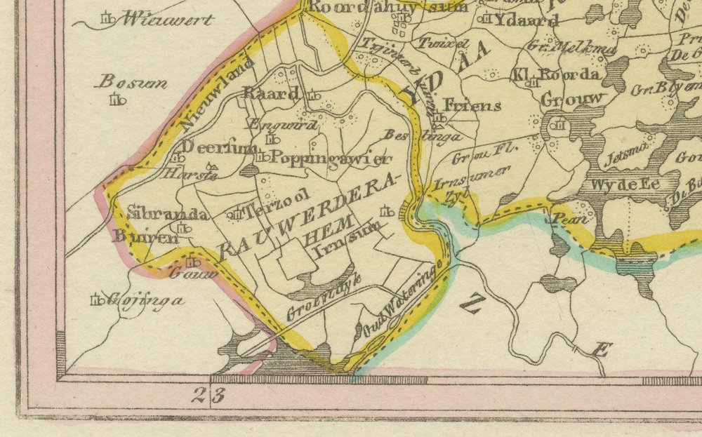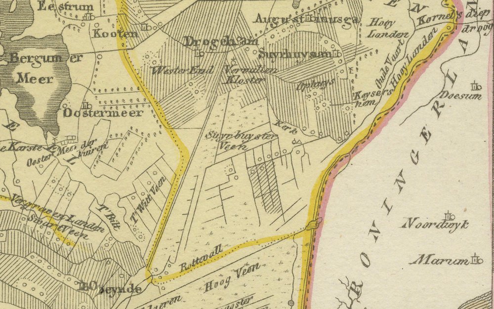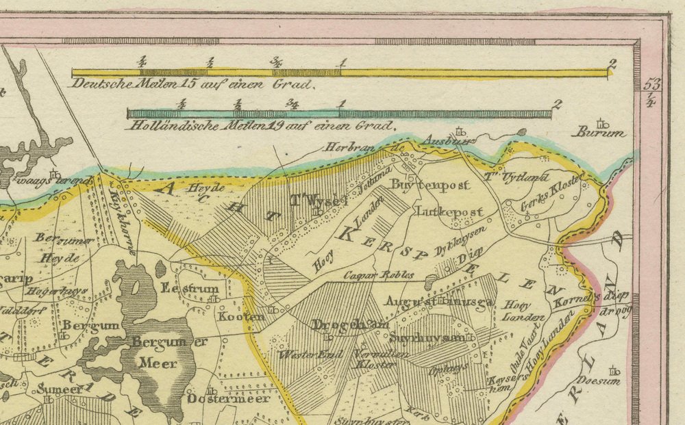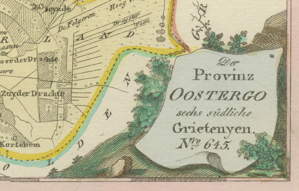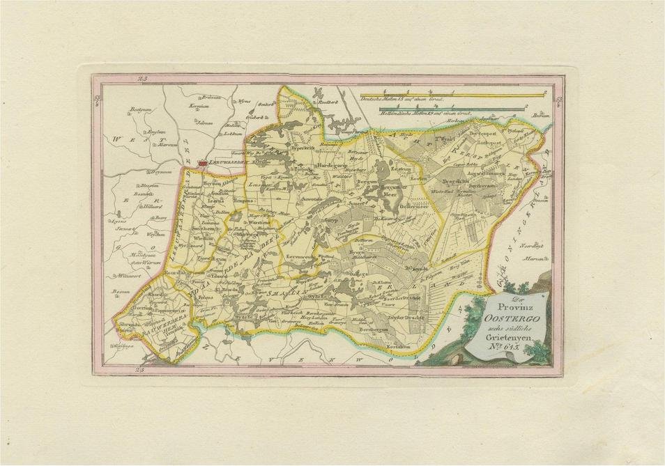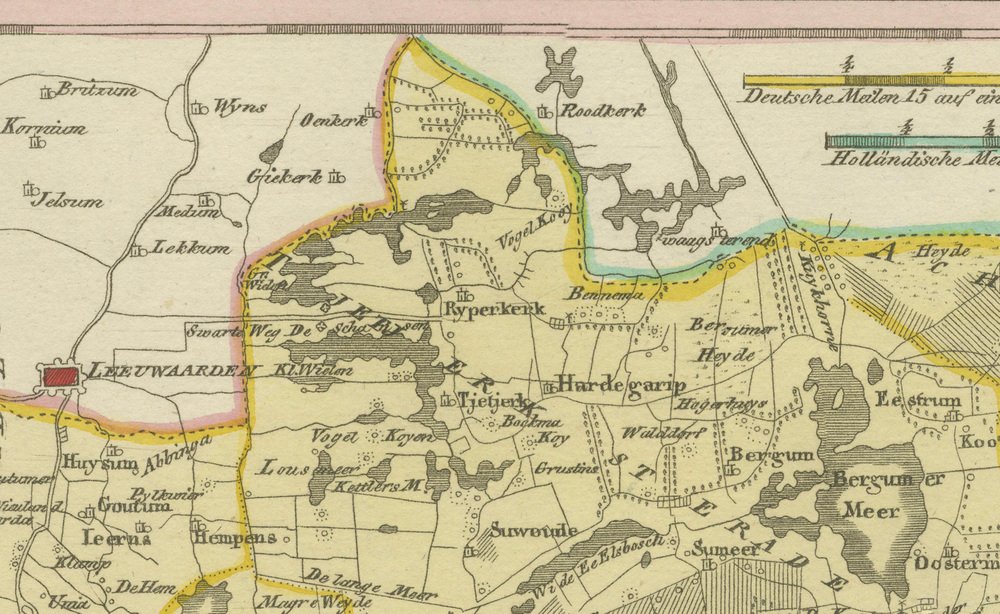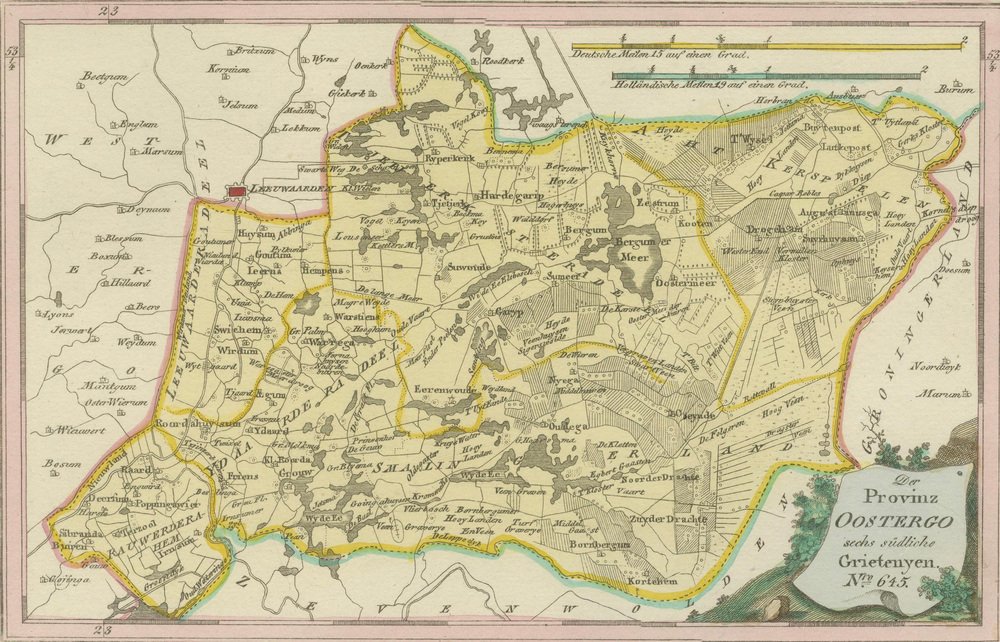 Major settlements depicted include Kollum, Buitenpost, Augustinusga, Drogeham, Harkema, Twijzel, Twijzelerheide, Oud Woesterga, Budestje, Budestje (just over the border in Groningen), Church Monastery, Stroobos, and Surhuizum. Smaller villages and parishes noted include Veenwouden (Feanwâlden), Kooten (Koatstertille area), Zwagerveen, Kuikhorne, Drogeham, Dantumawoude, Damwoude, Rinsumageest, Driesum, Broeksterwoude, Murmerwoude, Ee, Wetsens, and Engwierum. The map also shows waterways such as the Dokkumer Ee, polder divisions, and extensive reclaimed farmland. This map offers a snapshot of the landscape of eastern Friesland at the close of the 18th century, when the area was shaped by agriculture, waterways, and local administration through grietenijen (districts). Its wealth of place names makes it particularly valuable for regional historians and genealogists. The title cartouche in the lower right corner is framed with foliage, a characteristic design element of von Reilly’s atlas. with fine engraving and original hand color, the sheet is both a decorative and historical document of Friesland.