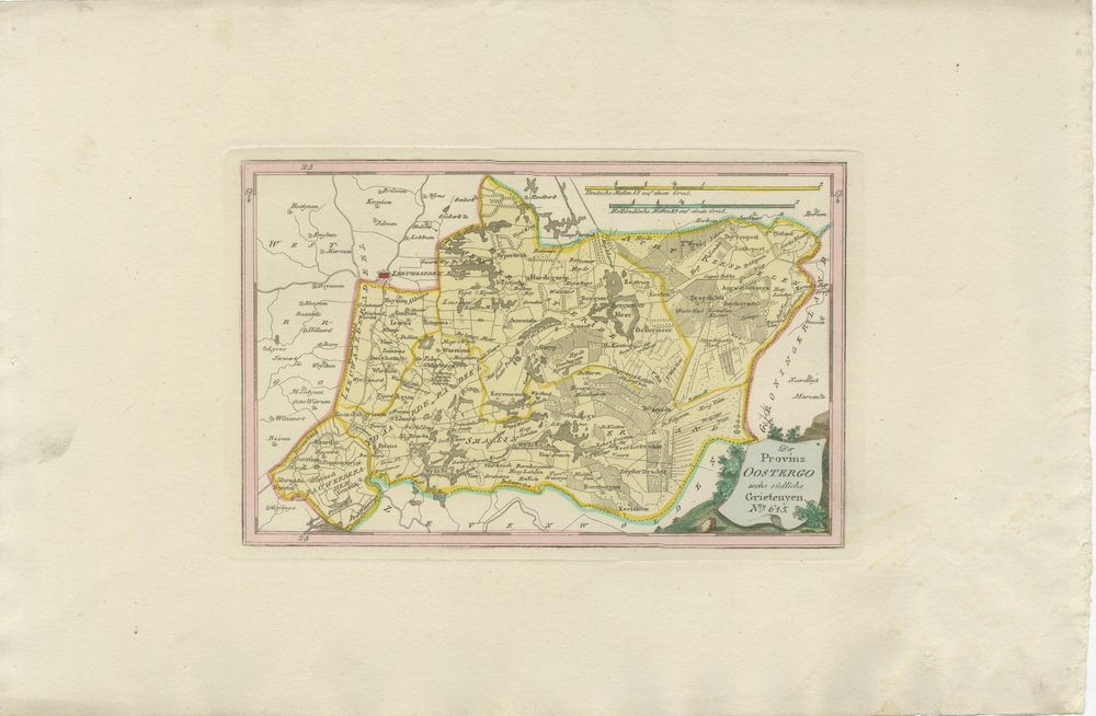 Original engraved map titled Der Provinz Oostergo sexs östliche Grietenyen No. 643, published in Vienna in 1791. This map shows the eastern districts of Oostergo in Friesland, with numerous villages, towns, waterways, and agricultural lands carefully engraved and highlighted with original hand coloring. The sheet is from Franz Joseph Johann von Reilly's atlas Schauplatz der fünf Theile der Welt, engraved by Ignaz Alberti in Vienna, 1791.