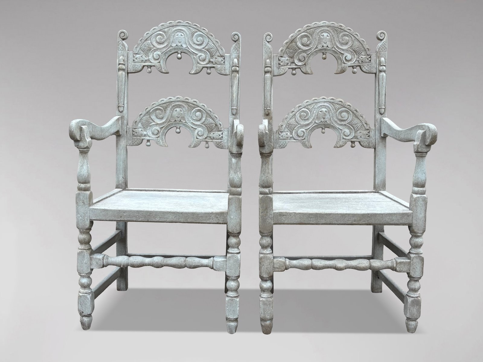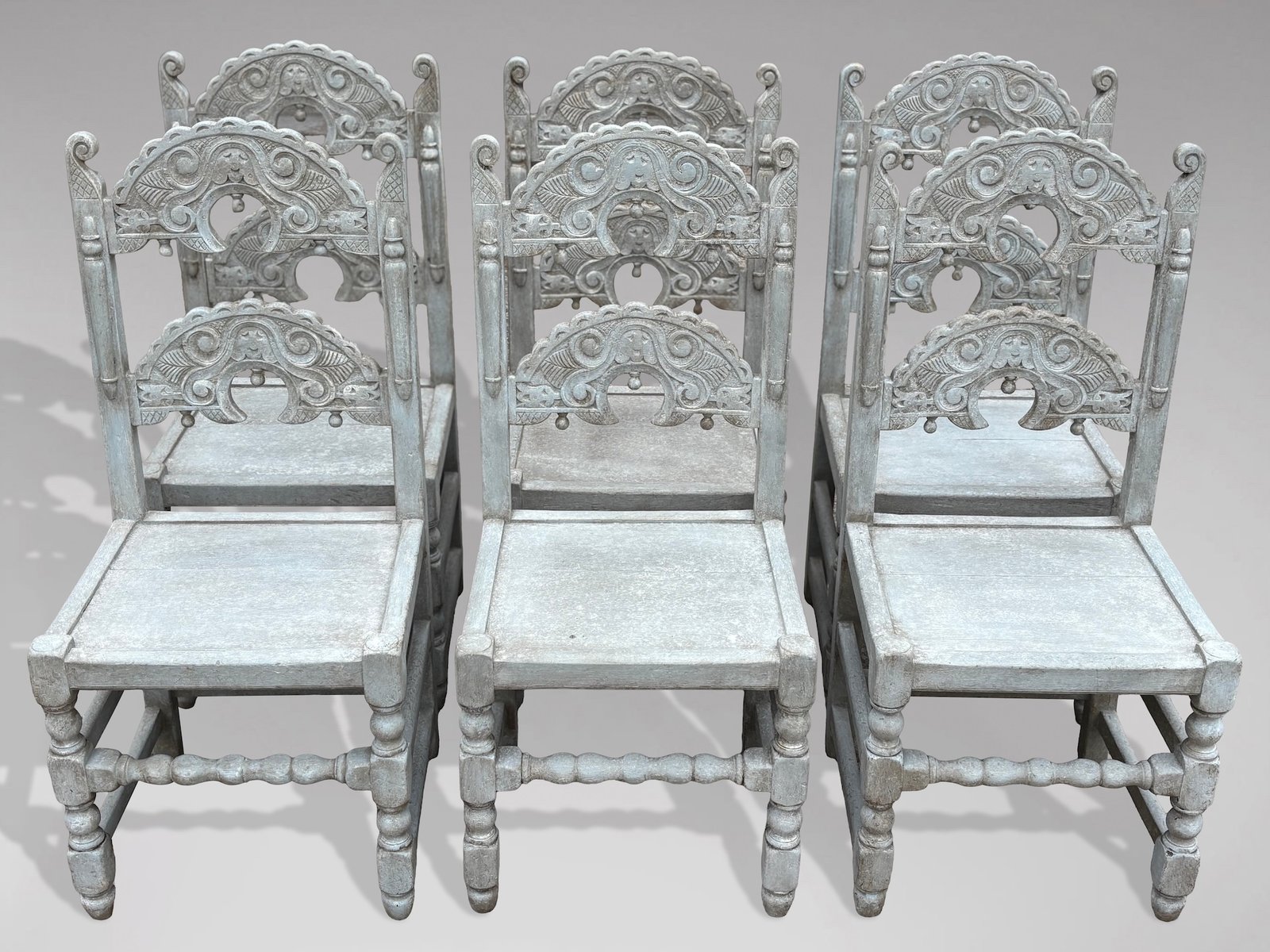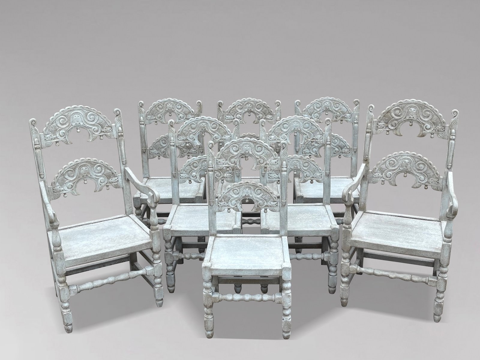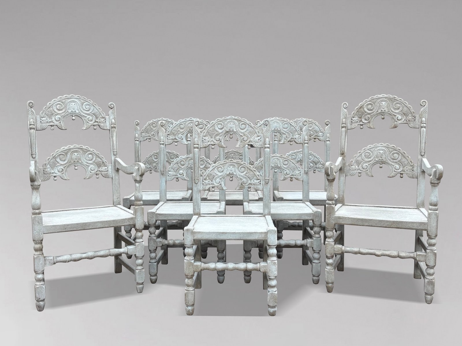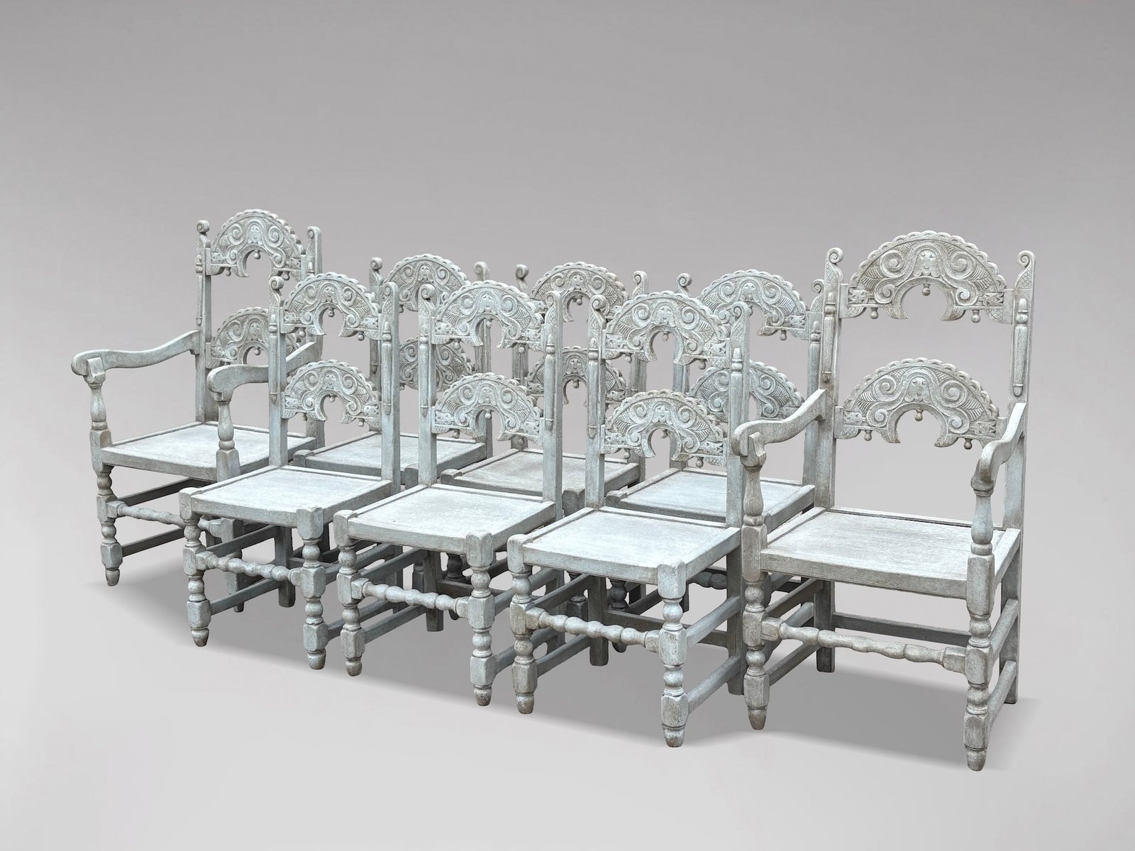 Antique Painted Carved Oak Derbyshire Dining Chairs, 1910, Set of 8