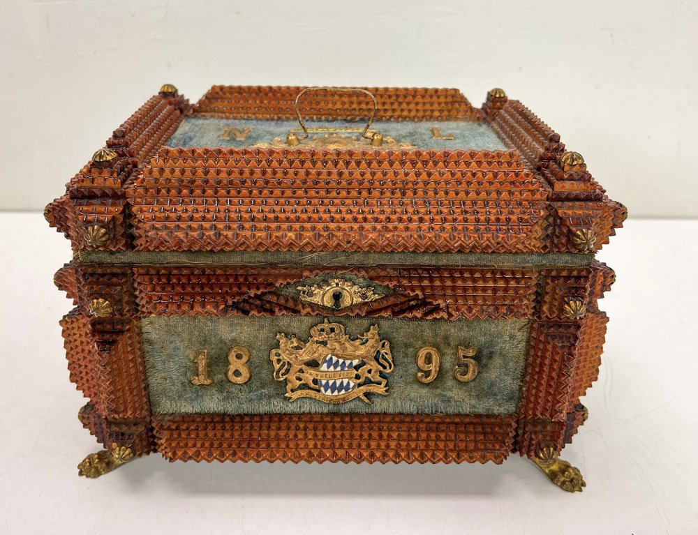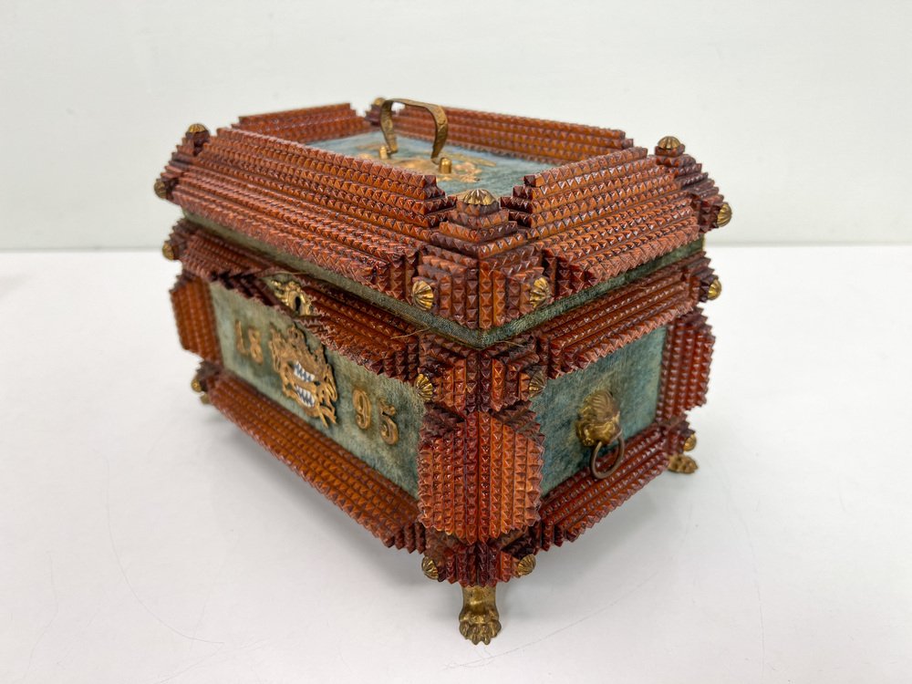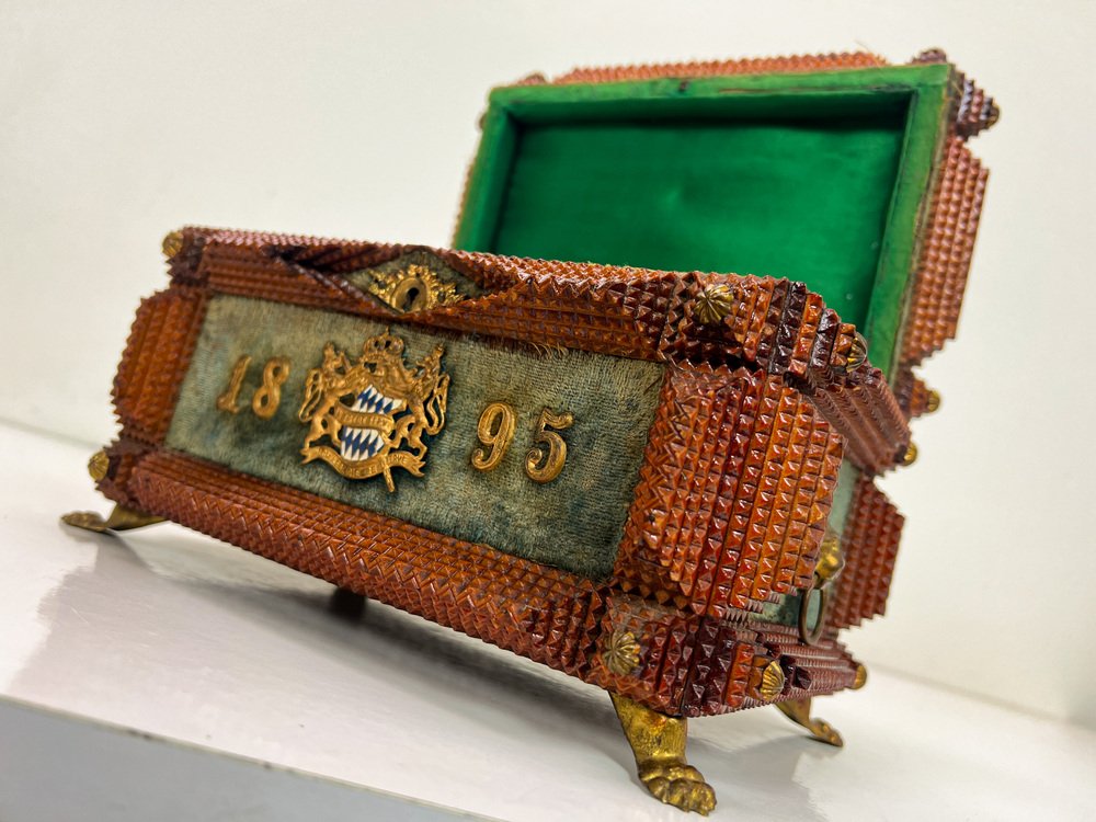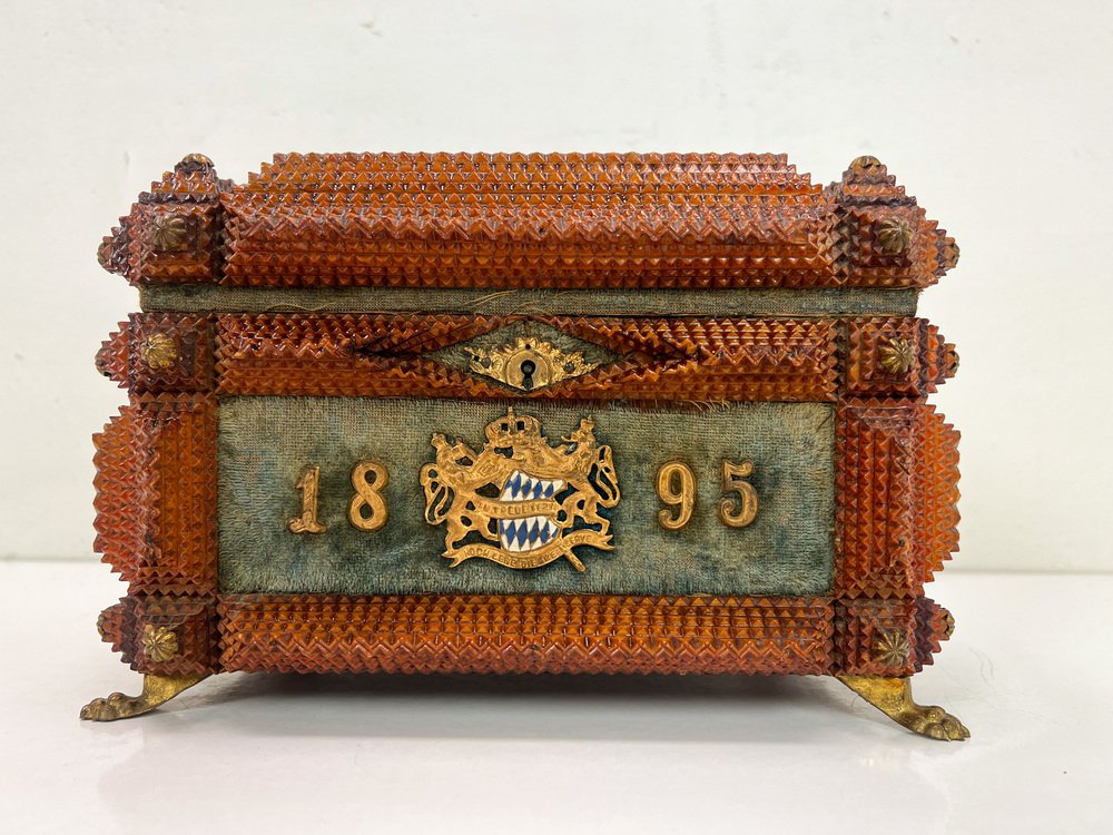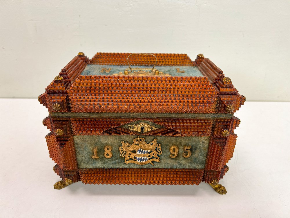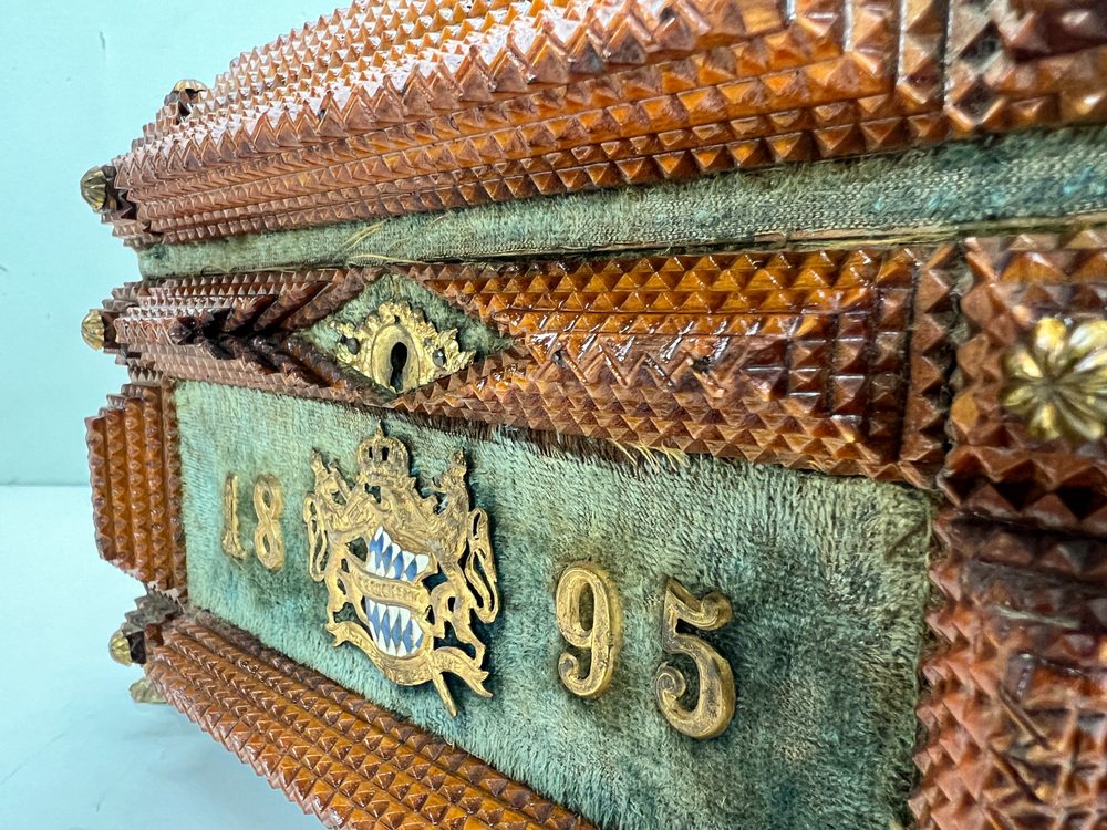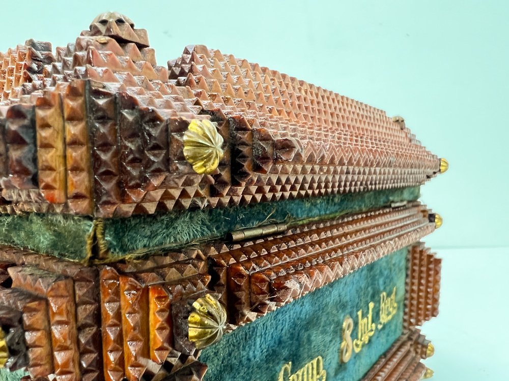 Antique Tramp Art Carved Wood Jewelry Box, Germany, 1895