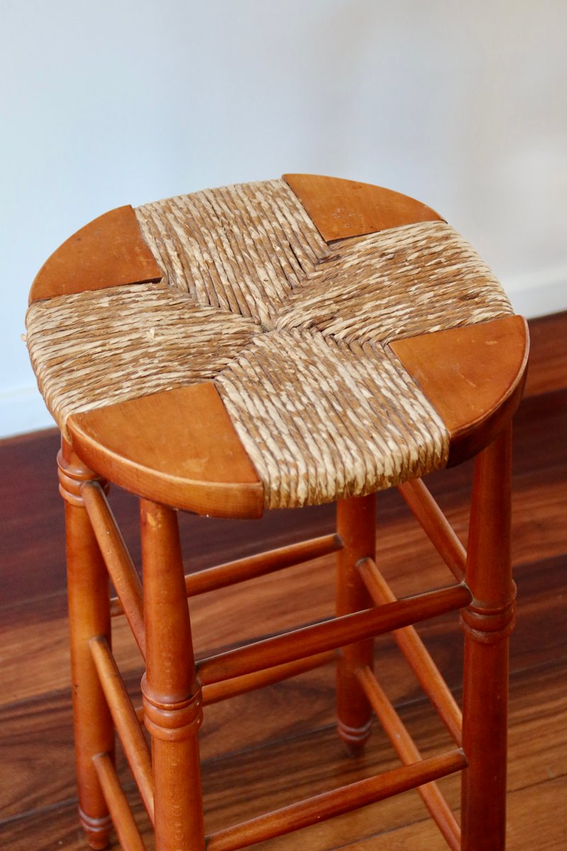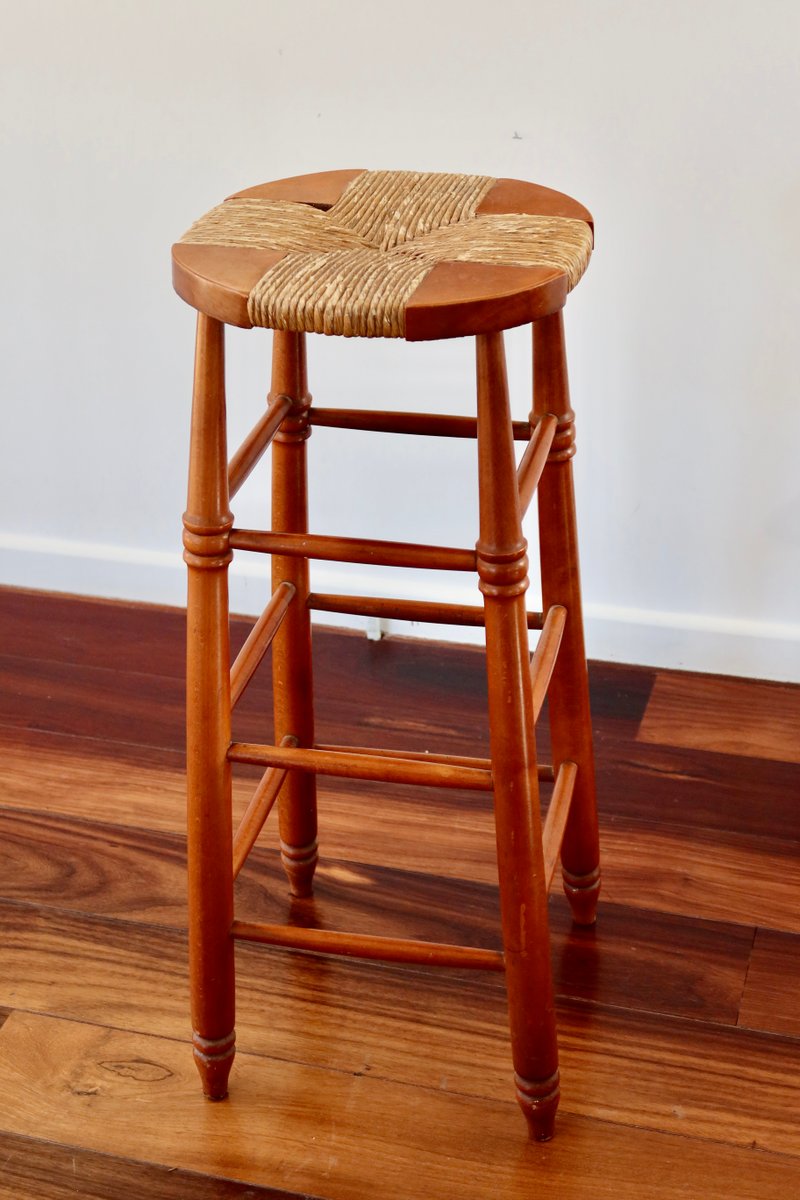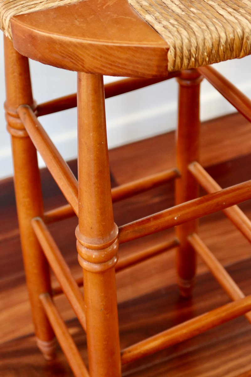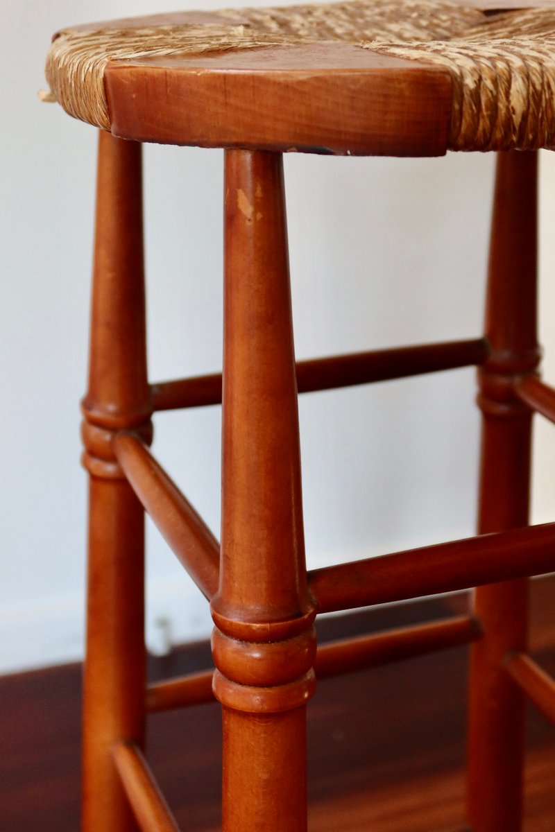 Antique Wooden Bar Stool with Straw Seat, 1980s