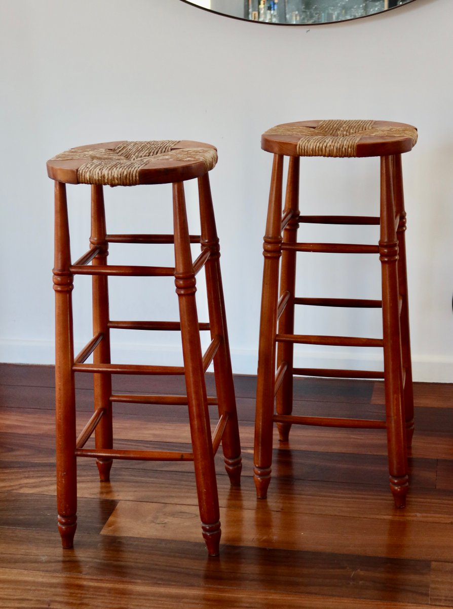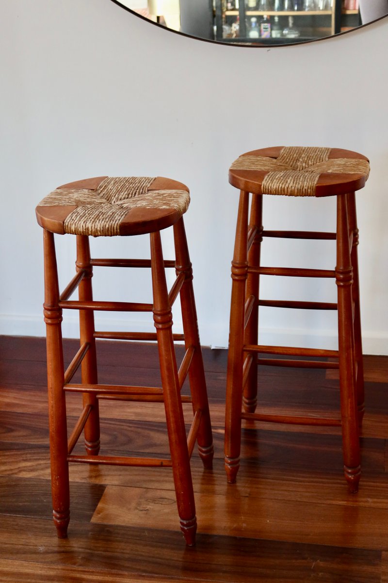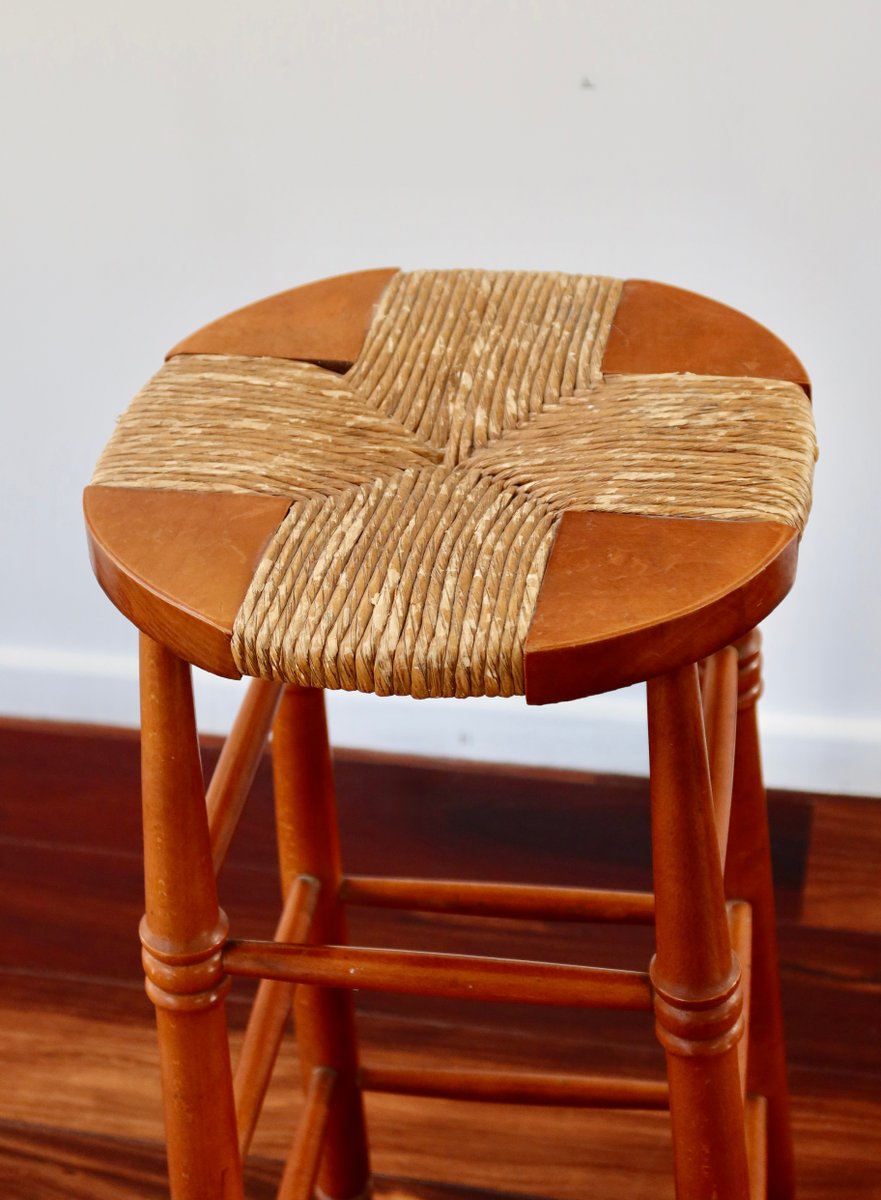 Antique Wooden Bar Stool with Straw Seat, 1980s