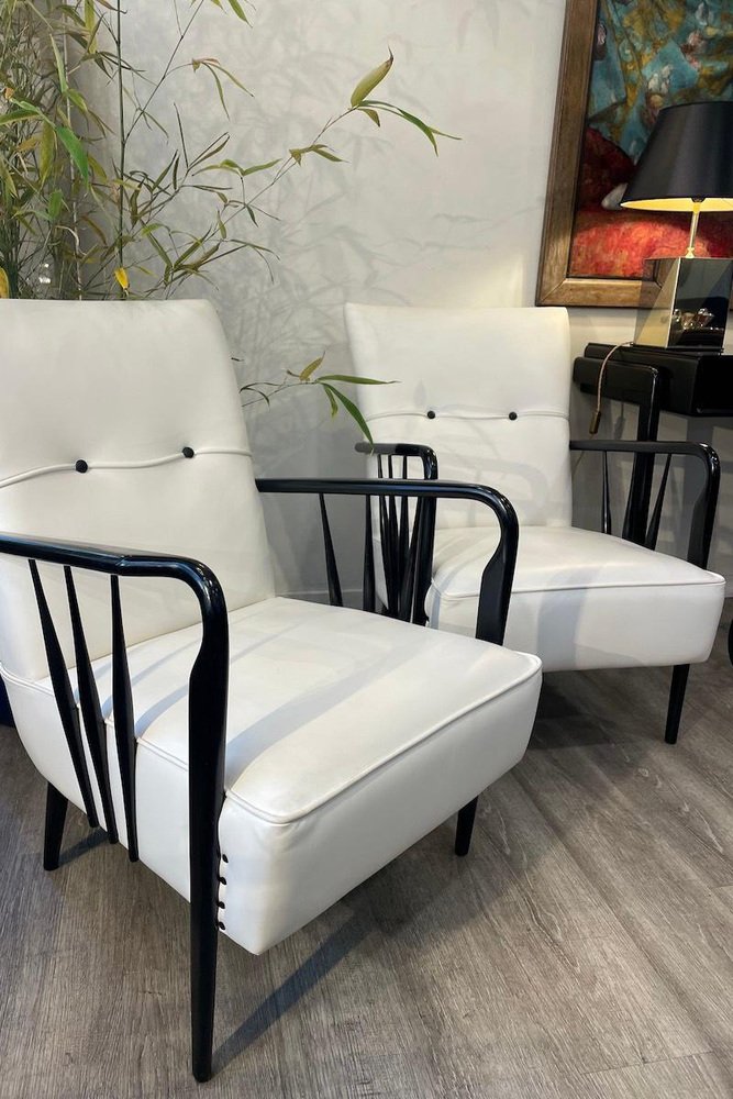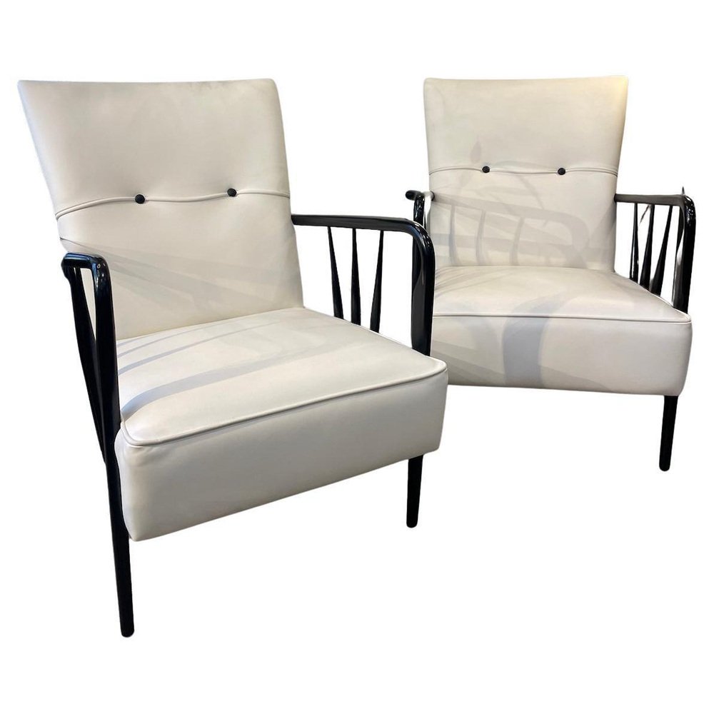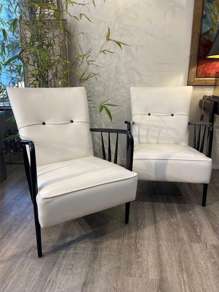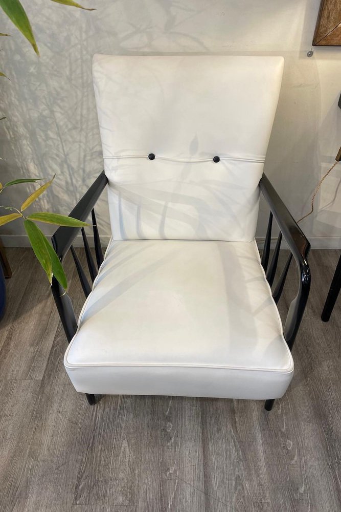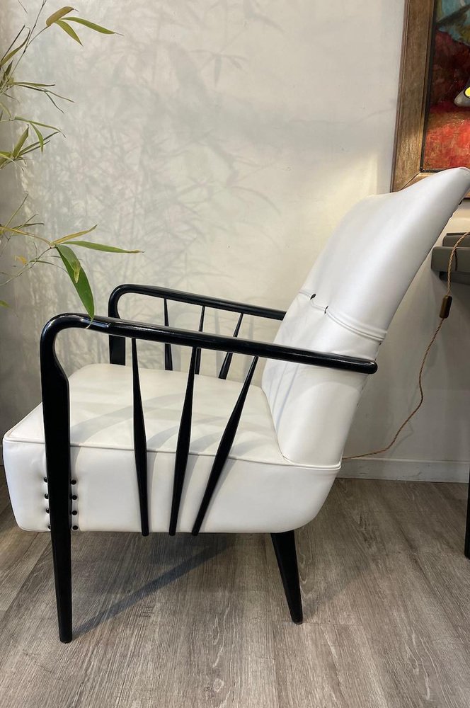 Armchairs in White Leather and Black Wood, 1950s, Set of 2