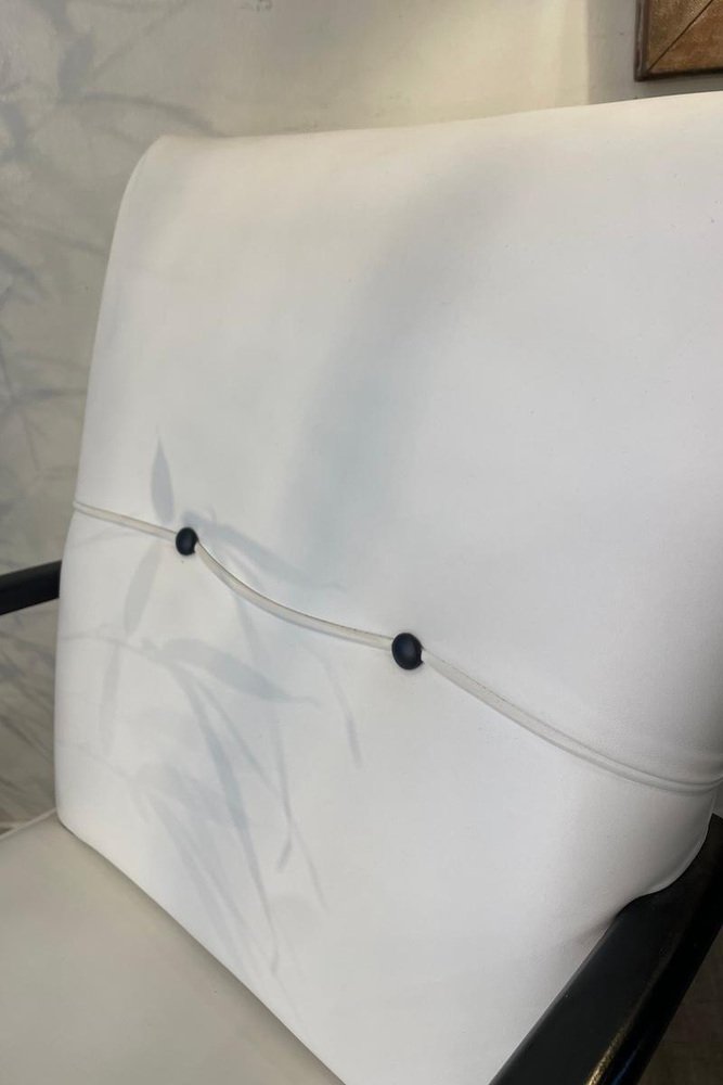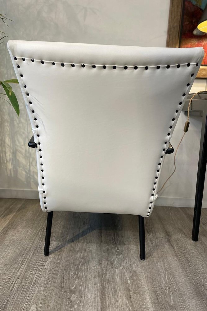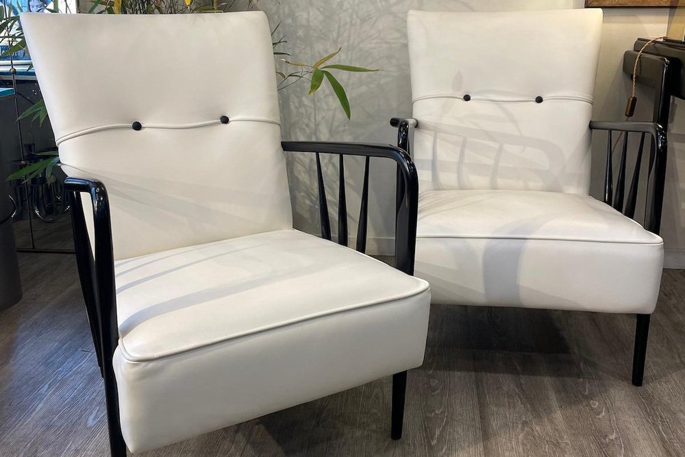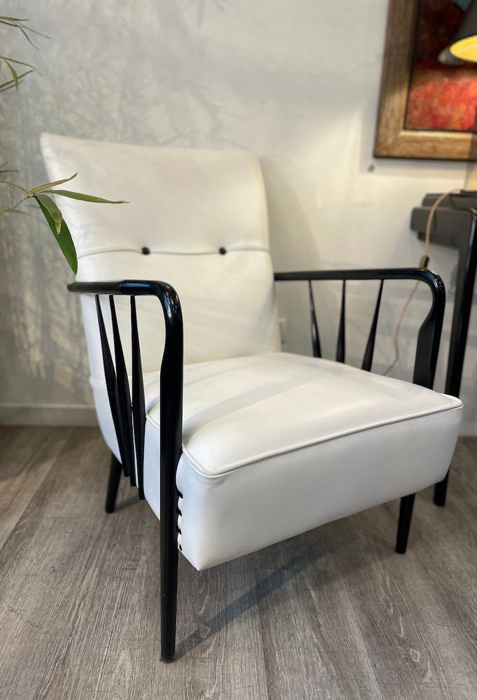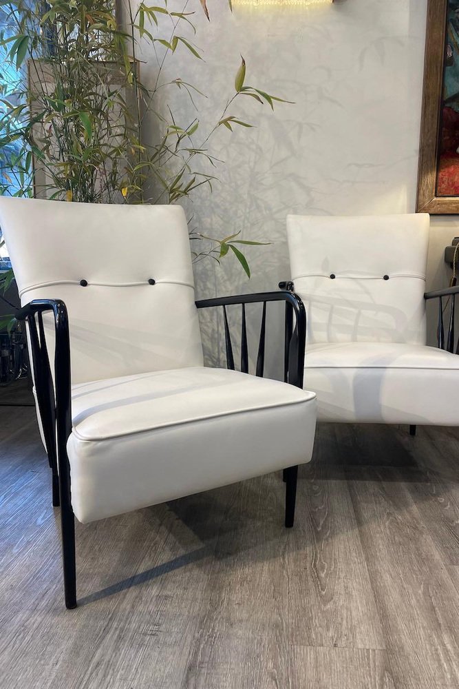 Armchairs in White Leather and Black Wood, 1950s, Set of 2