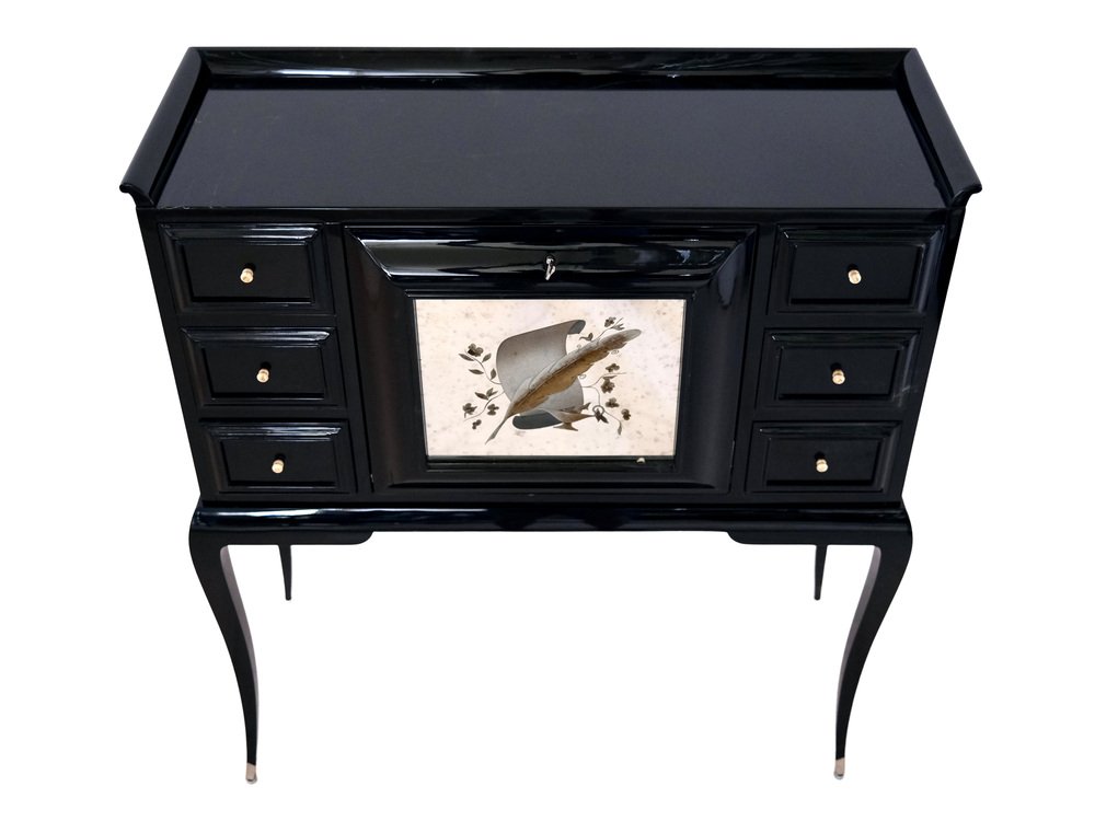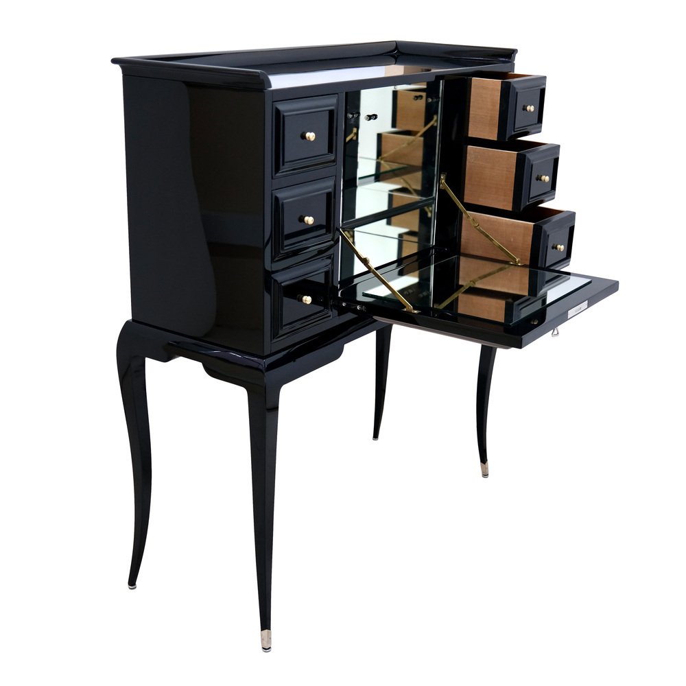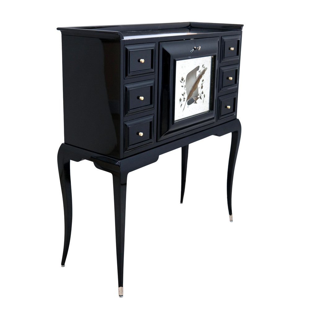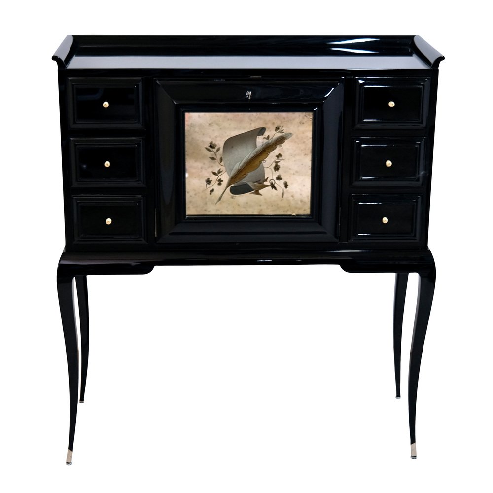Art Deco Black Lacquer Secretaire with Etched Mirror