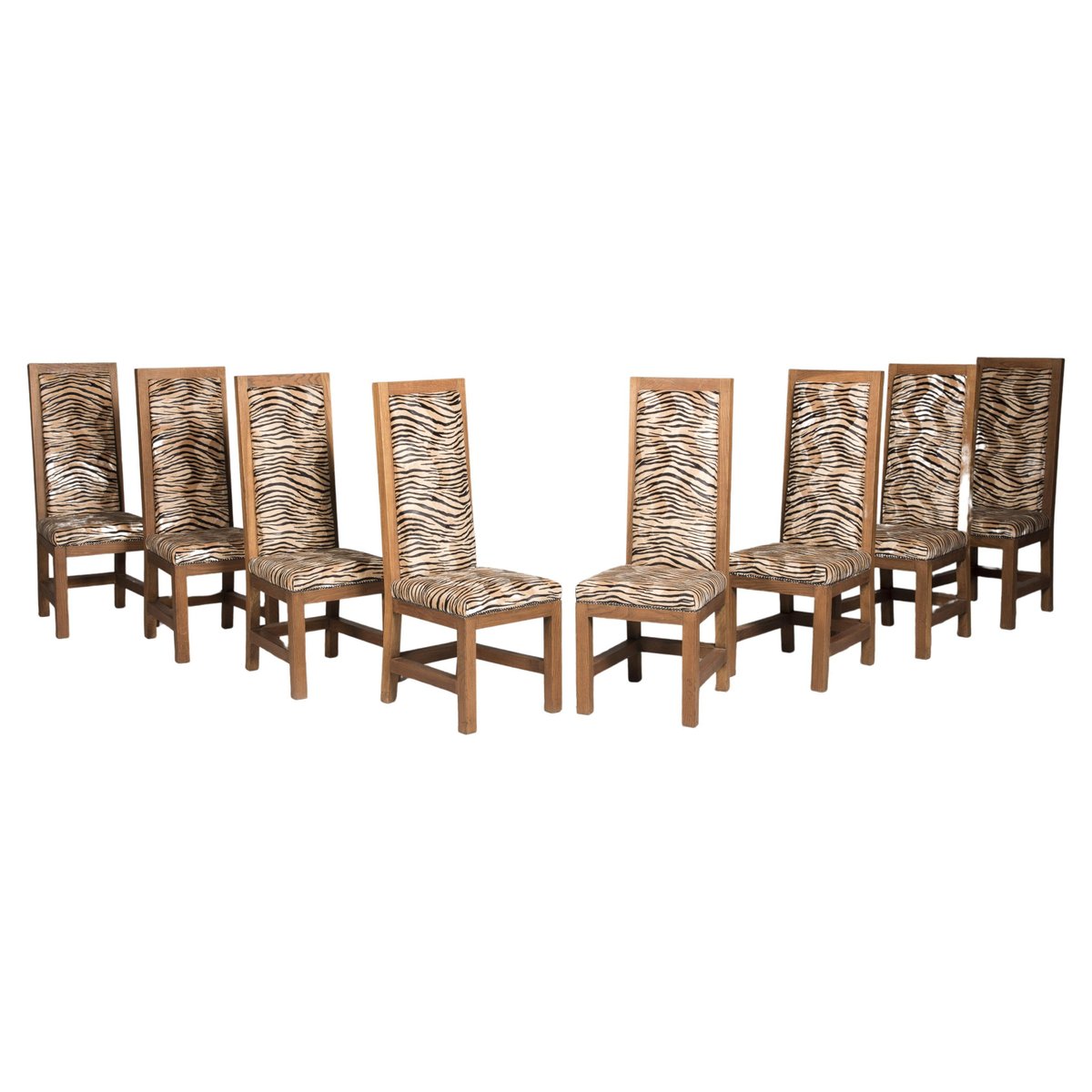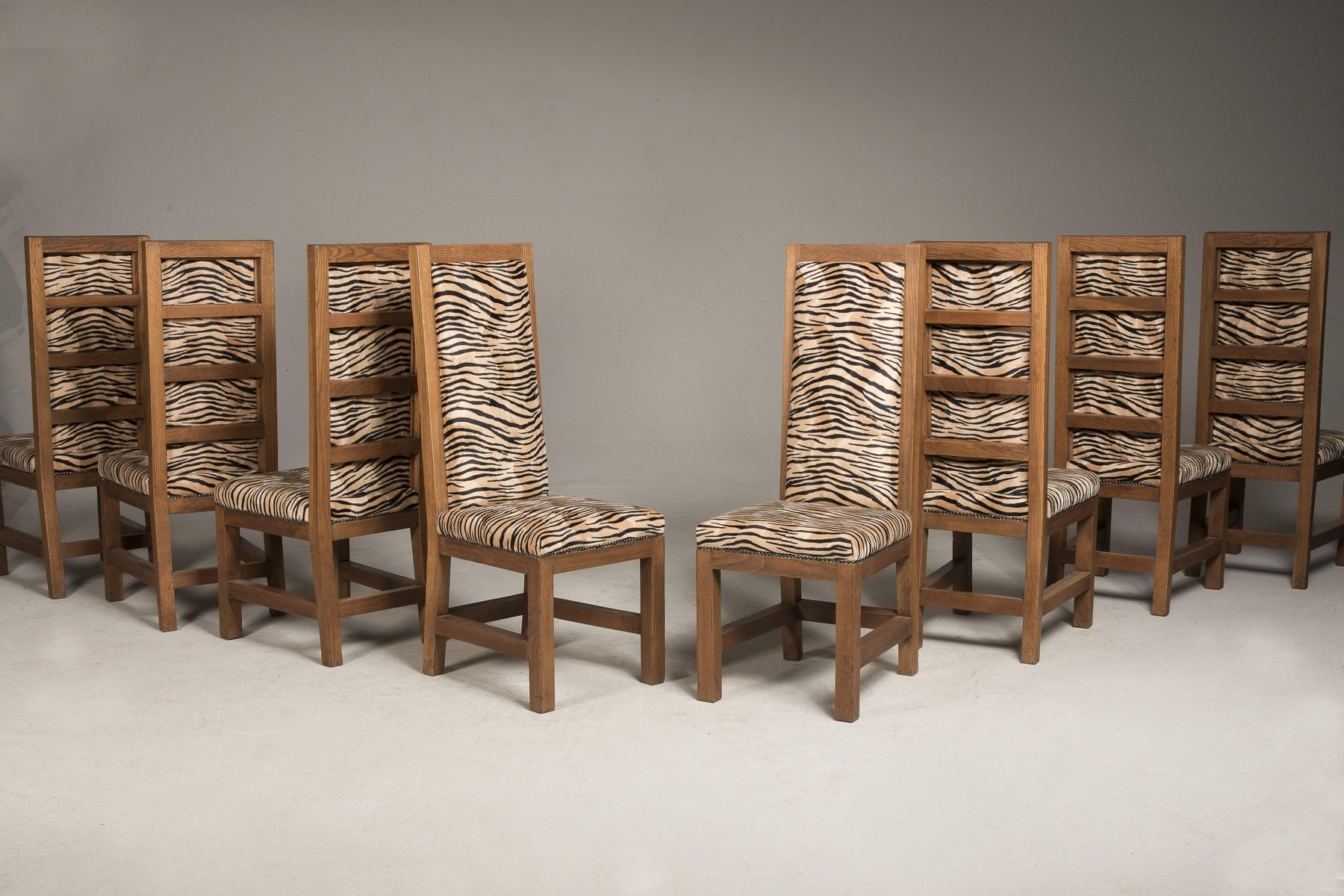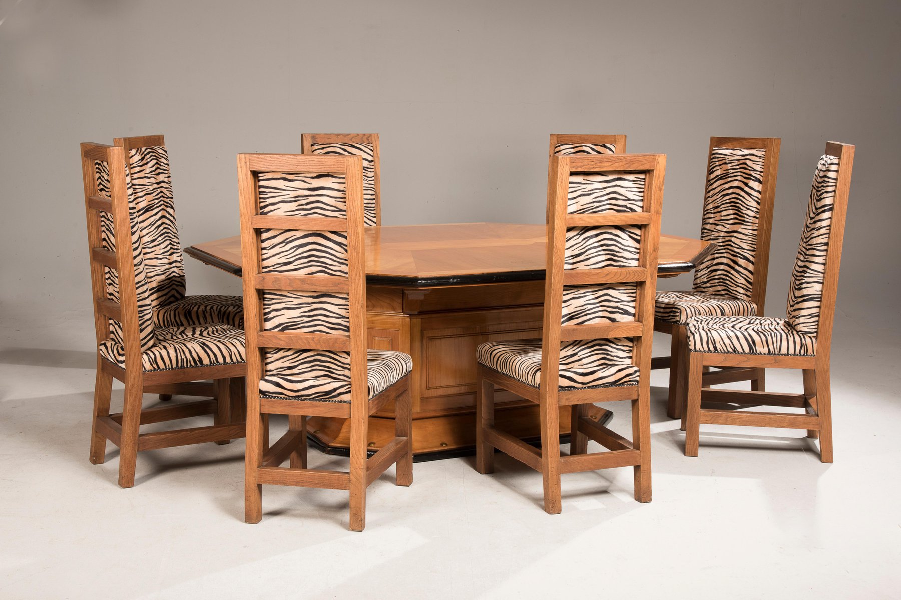 Art Deco Oak & Velvet Dining Chairs, 1930s, Set of 8