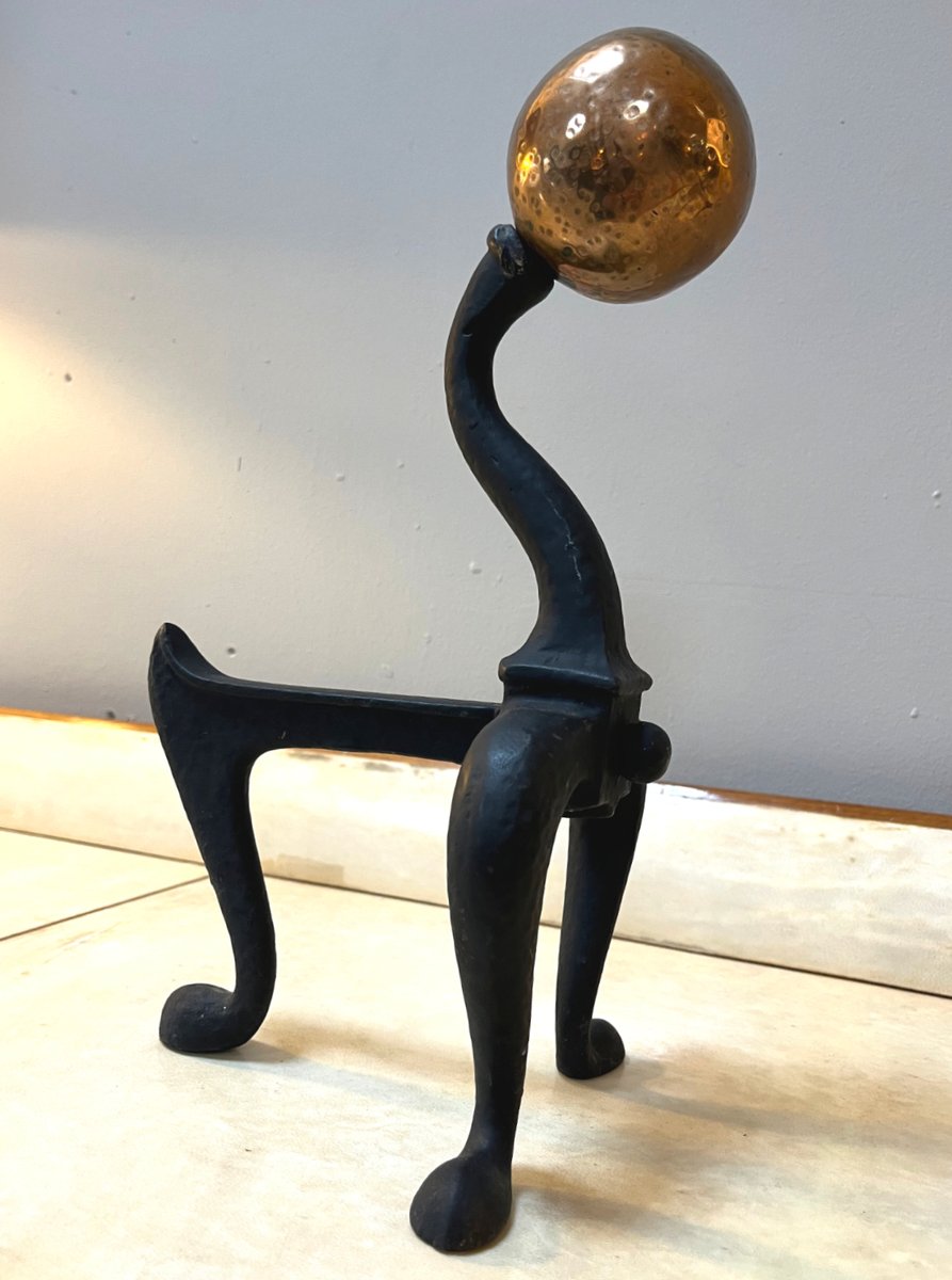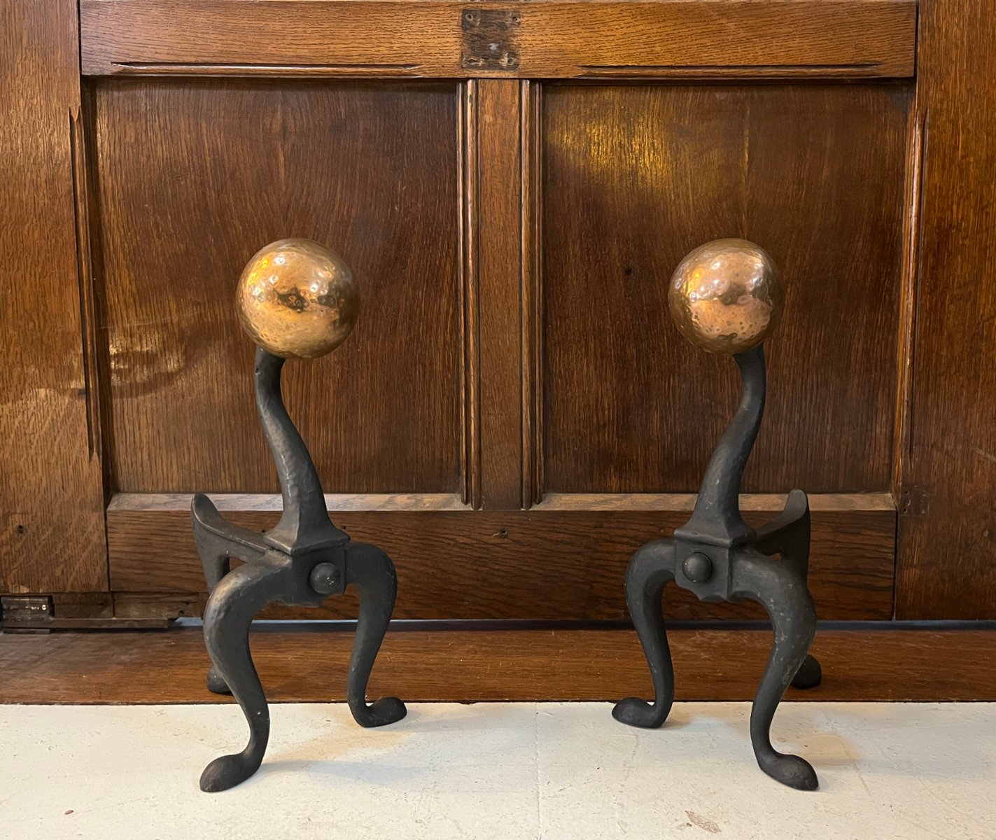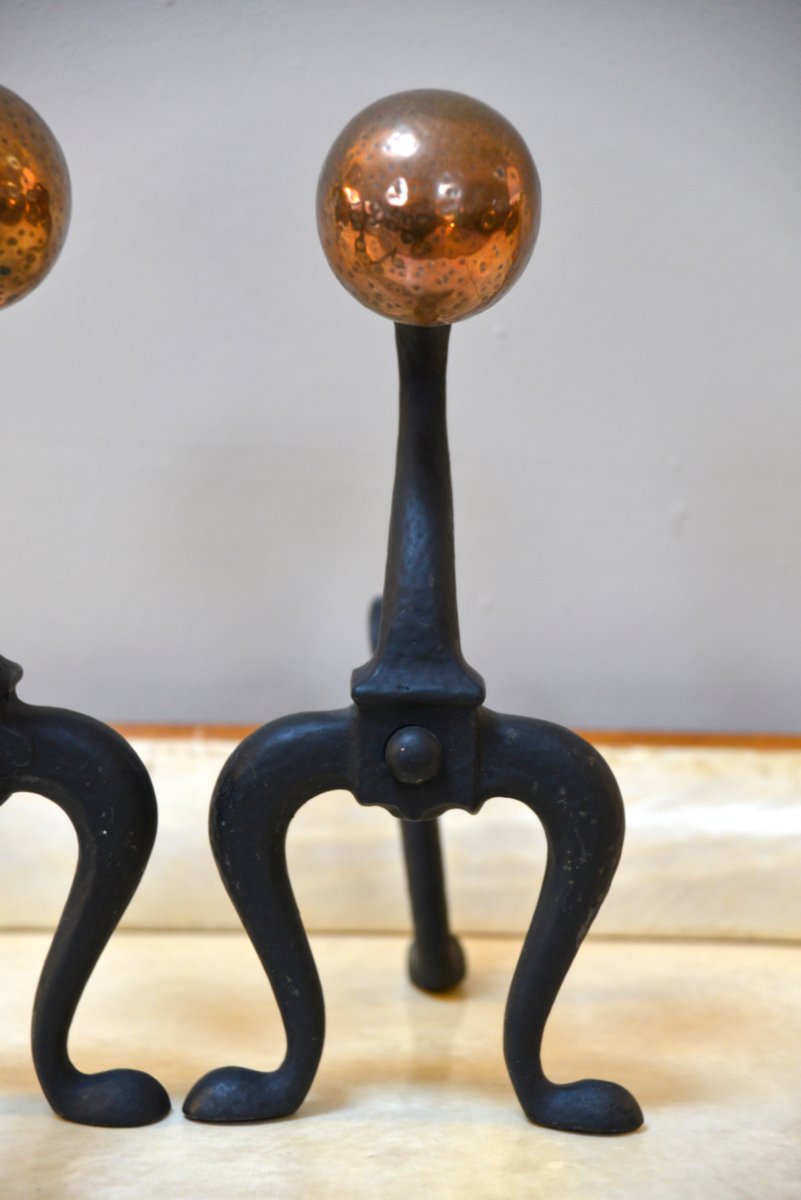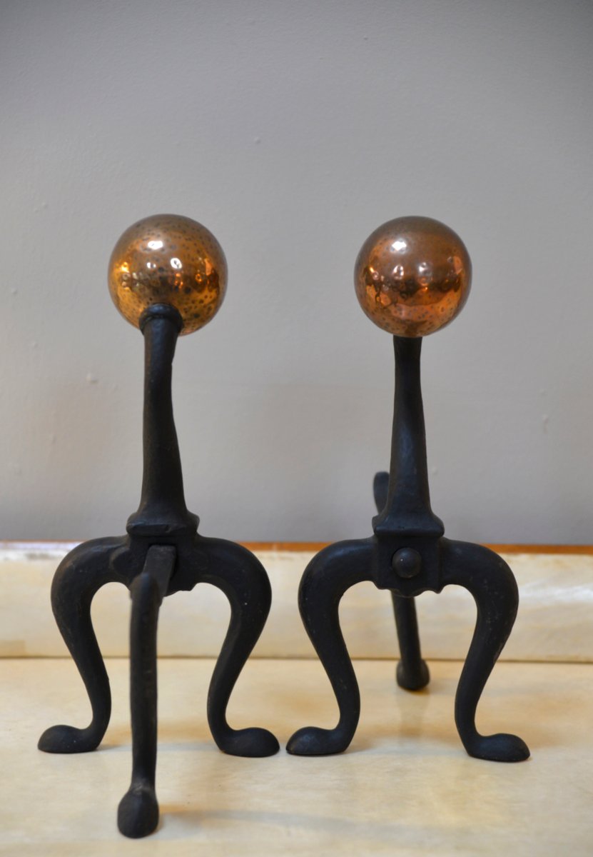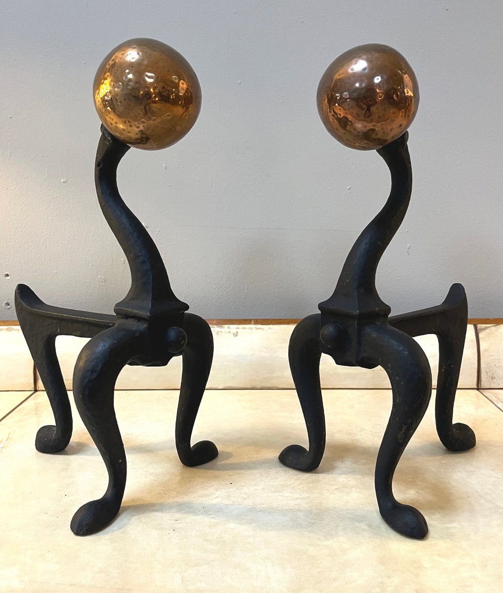 Arts & Crafts Firedog Andirons in Brass, Copper and Cast Iron, 1920s, Set of 2