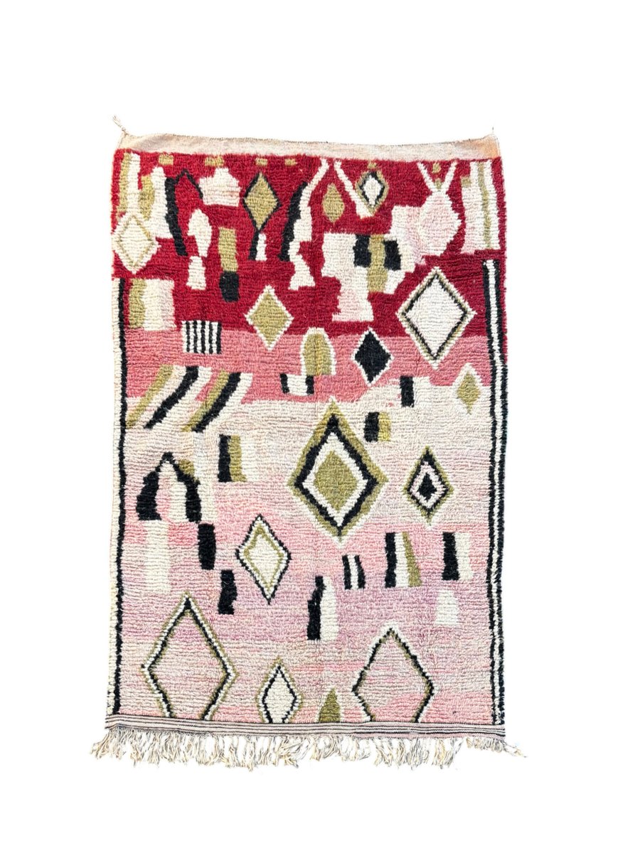 This Moroccan Boujad rug is a handwoven piece originating from the Boujad region in the Middle Atlas Mountains of Morocco. Boujad rugs are renowned for their artistic freedom, bold graphic language, and expressive compositions that blend ancestral craftsmanship with a highly decorative aesthetic.