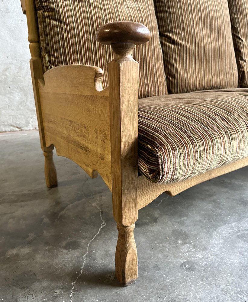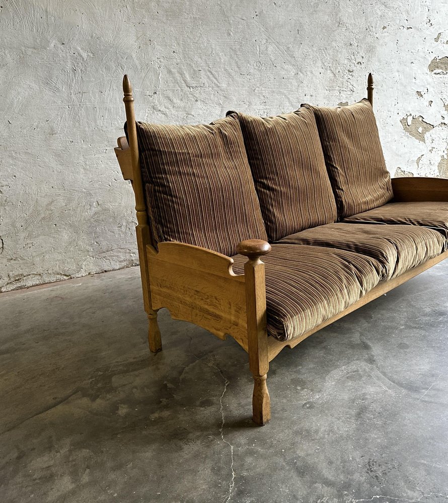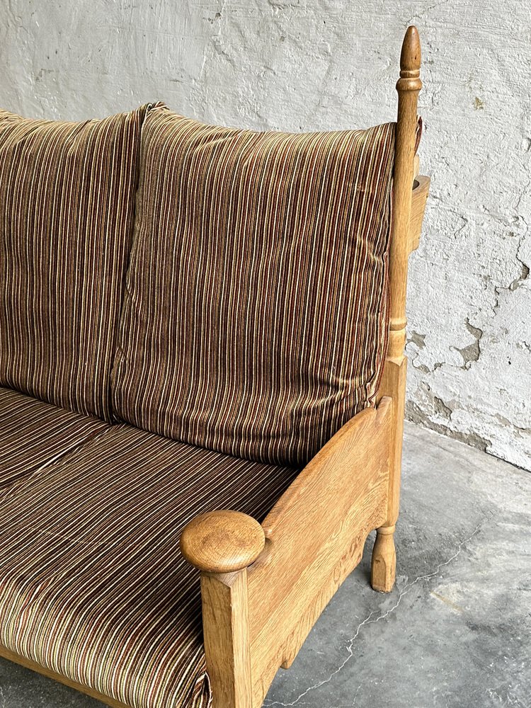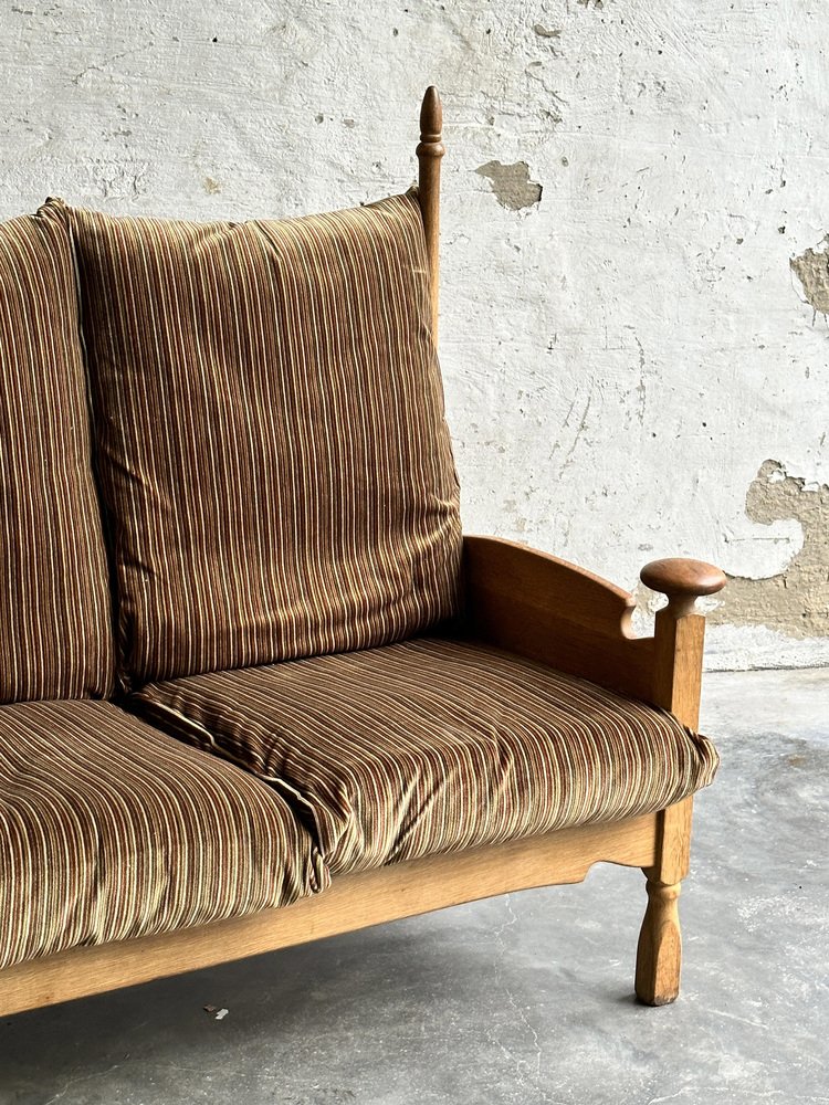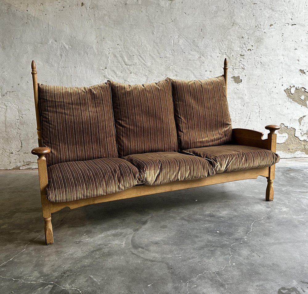 Brutalist Oak and Velvet Throne Sofa in the style of Guillerme Et Chambron, 1950s