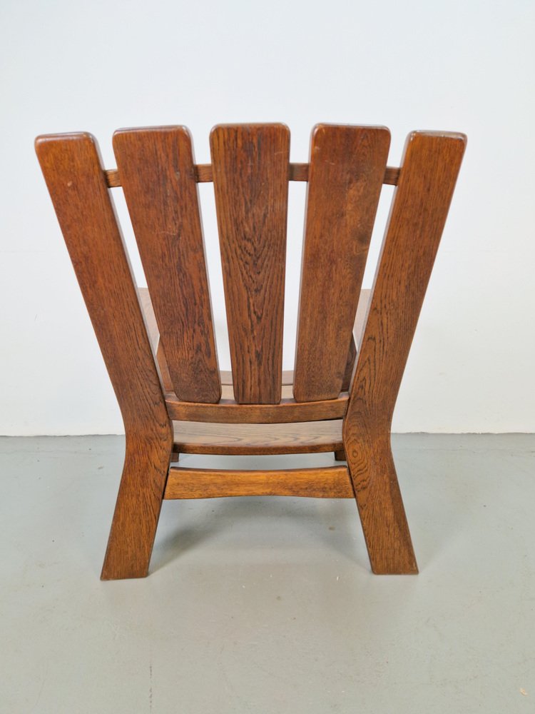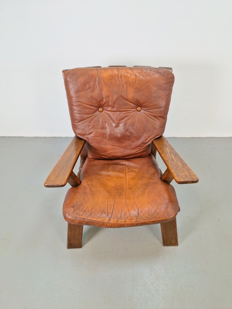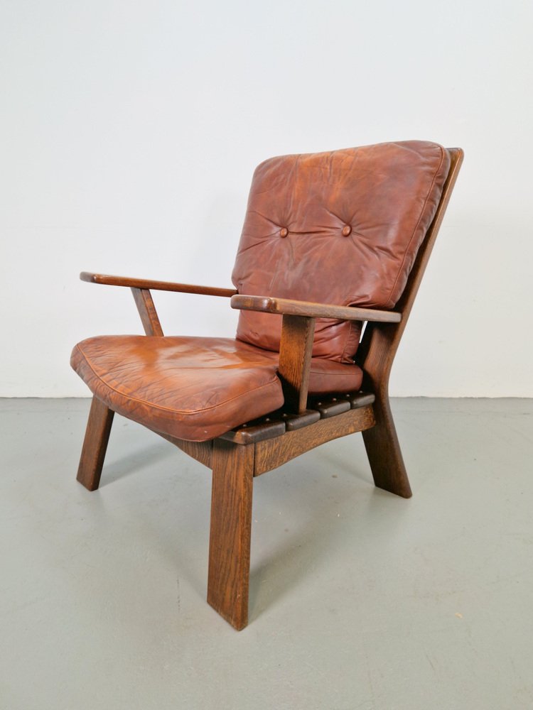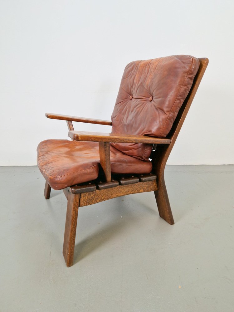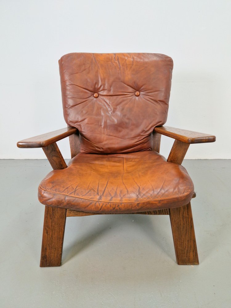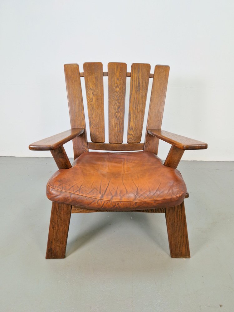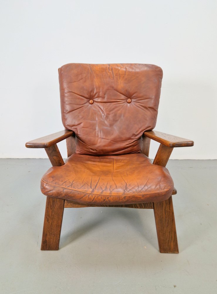 Brutalist Wood Armchair with Brown Leather Upholstery, Germany, 1960s