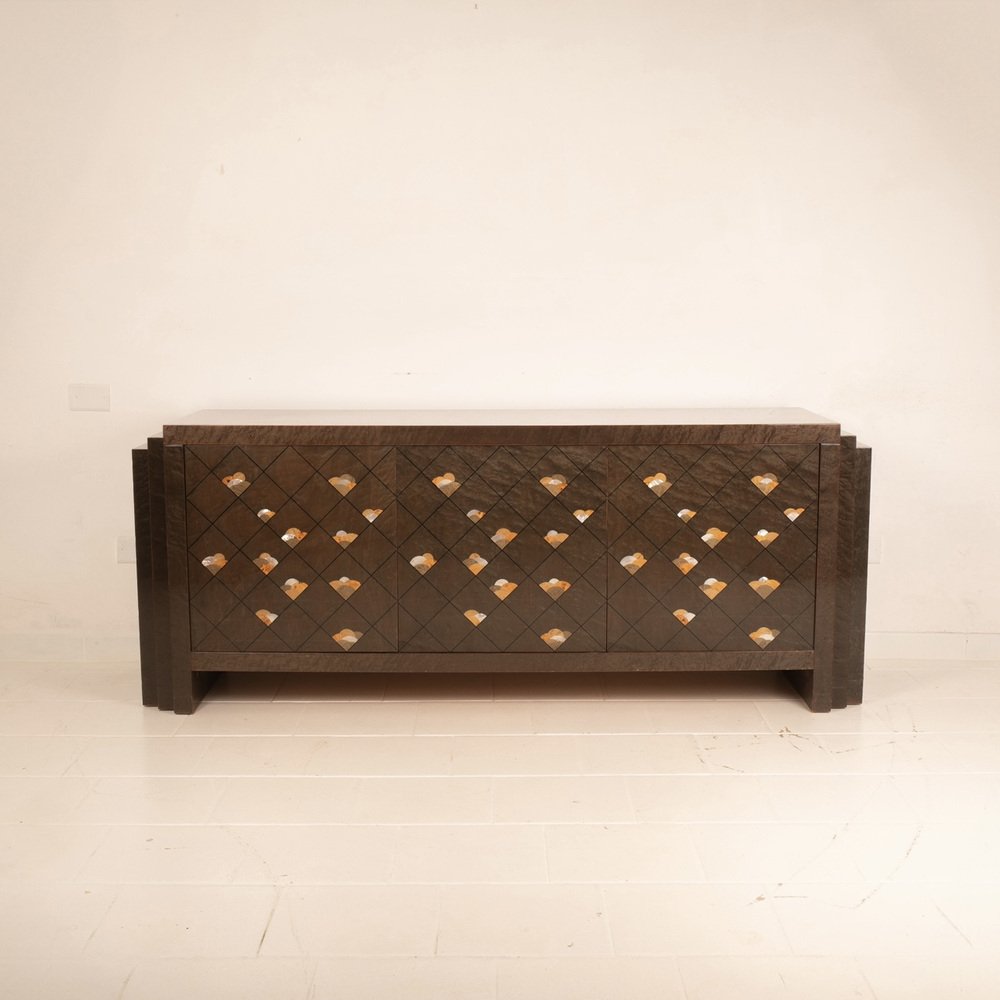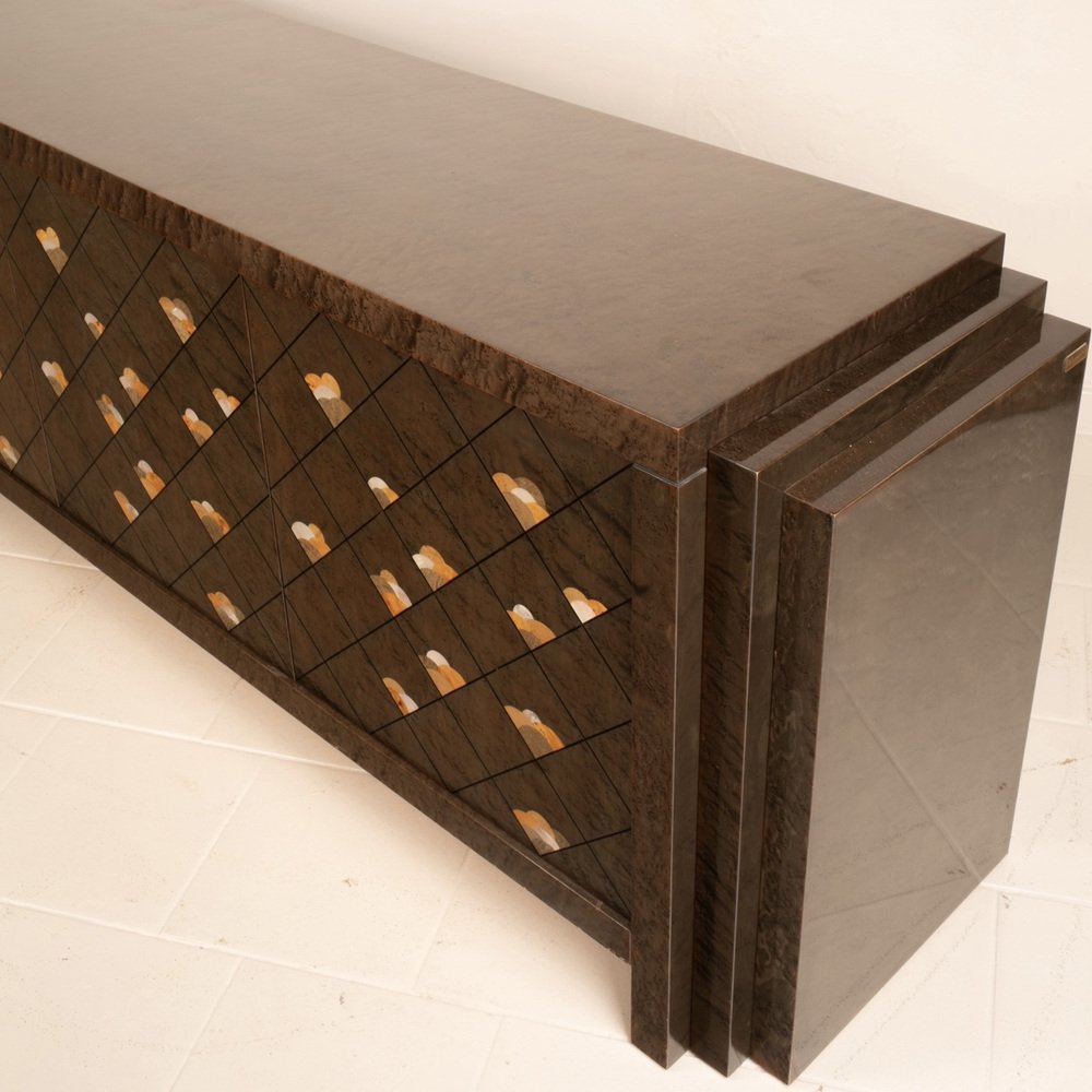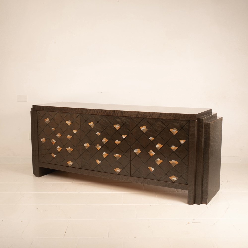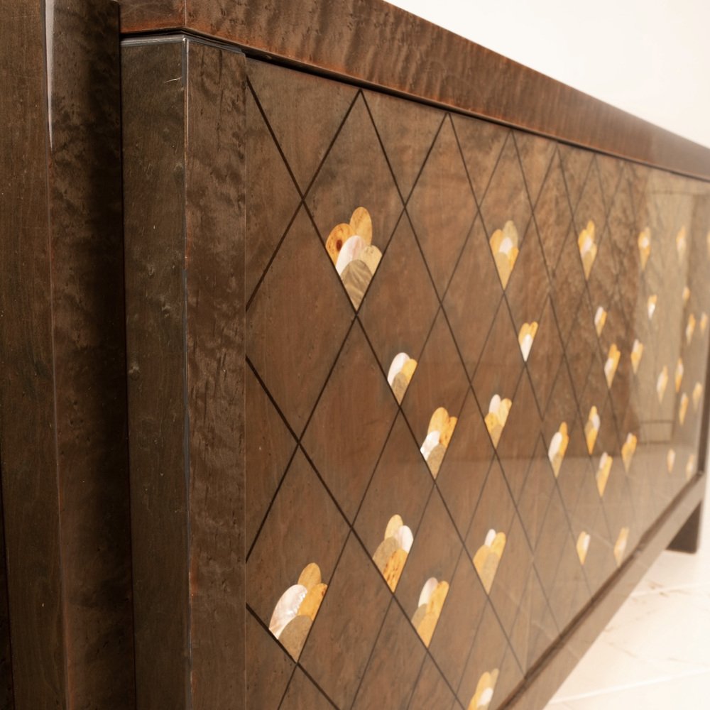 The sideboard is entitled "Chiaro di Luna" and is made of very precious maple root, also called partridge's eye, known for its iridescent and luminous nature, dyed brown and adorned with a motif of octagonal lines and decorations in wooden inlay.
