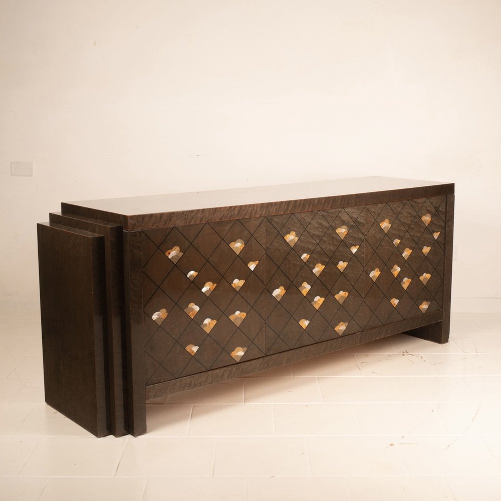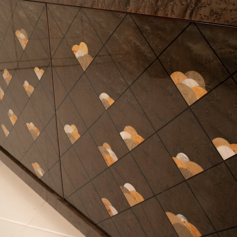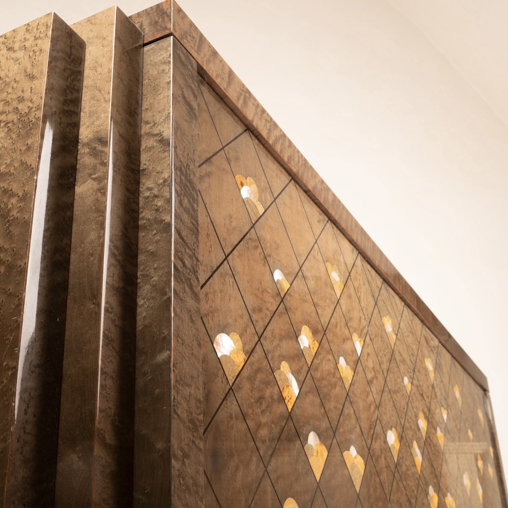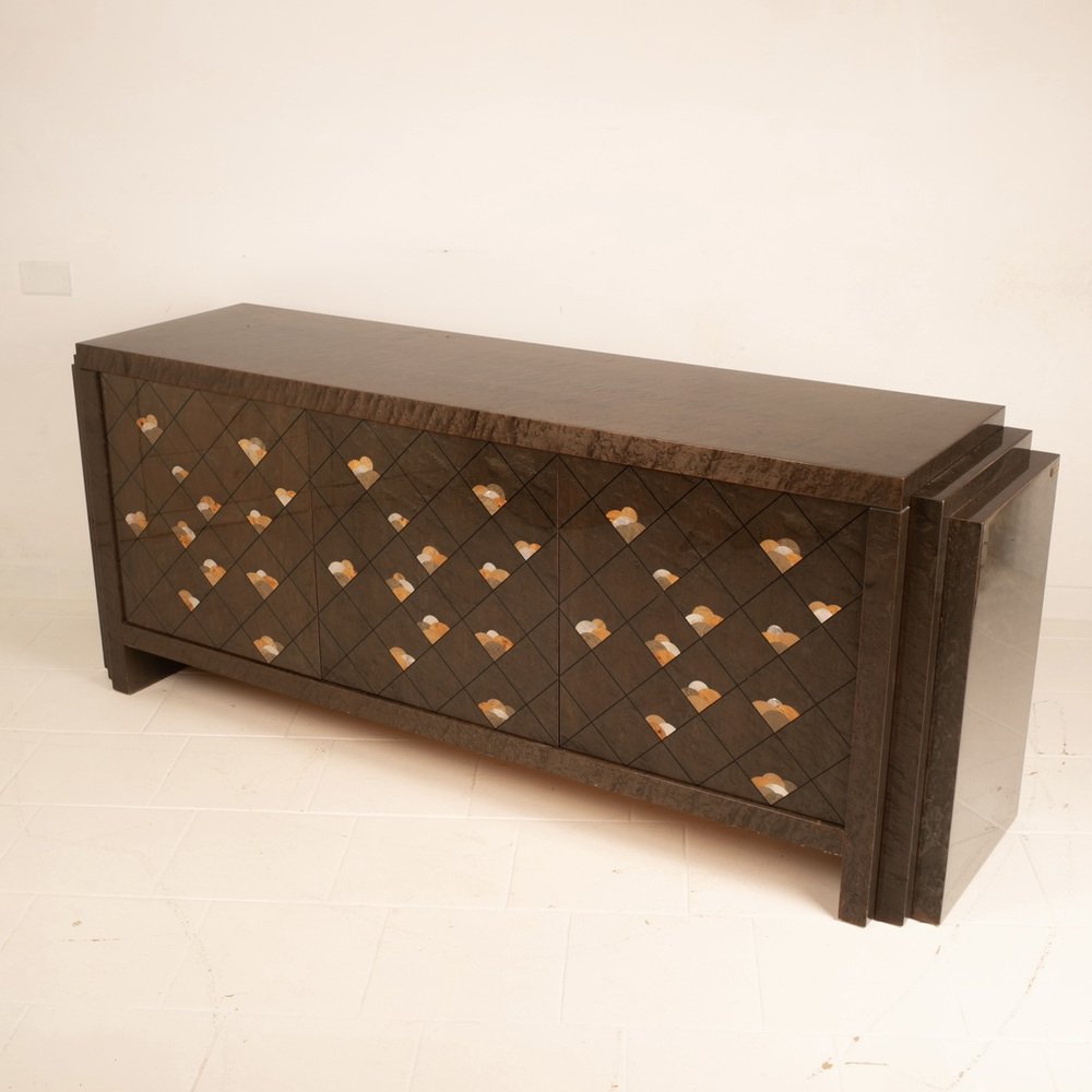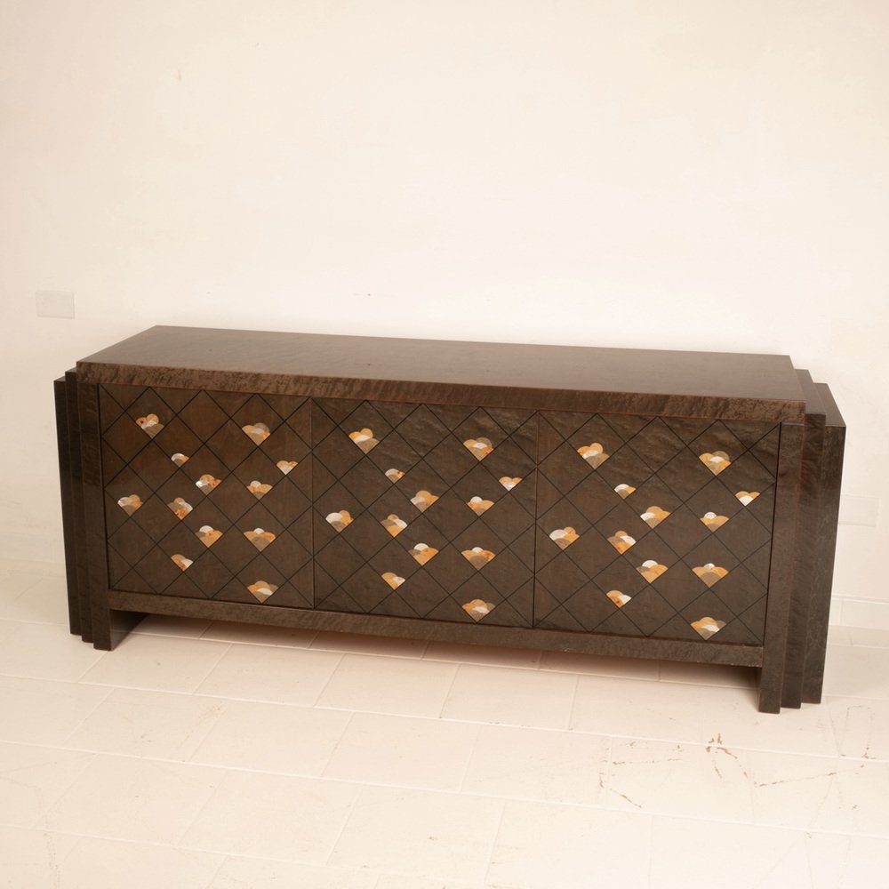 The sideboard is entitled "Chiaro di Luna" and is made of very precious maple root, also called partridge's eye, known for its iridescent and luminous nature, dyed brown and adorned with a motif of octagonal lines and decorations in wooden inlay.