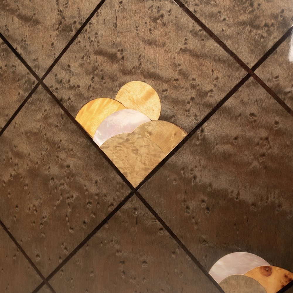 Distinctive Design: Motif of octagonal lines and decorations in wooden inlay, made with craftsmanship. Iridescent and luminous maple root, brown tint