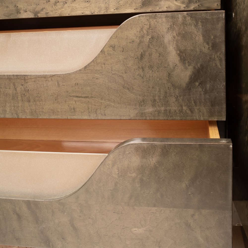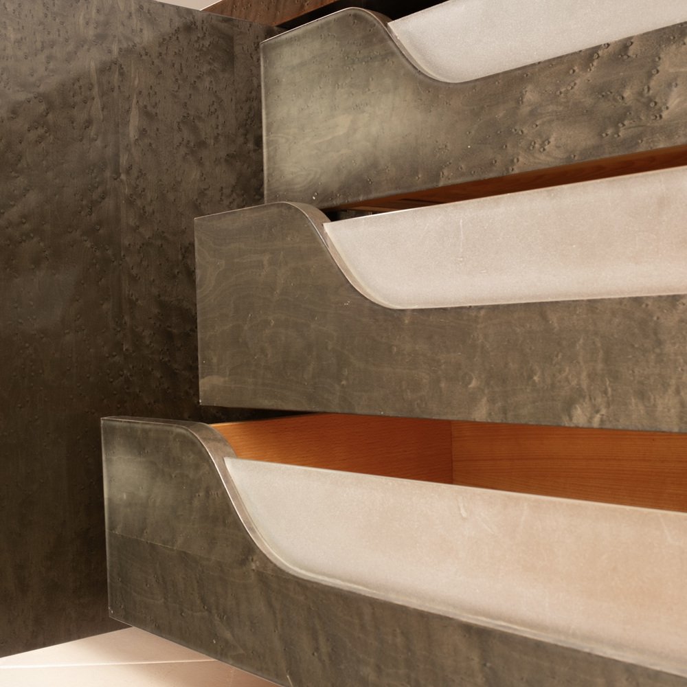 Main materials: Maple burl (partseye), wooden inlay, etched glass