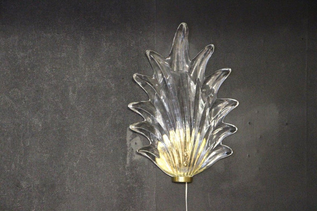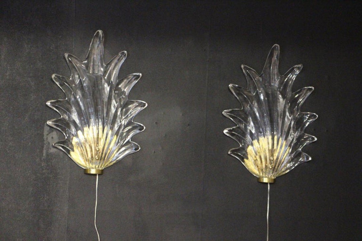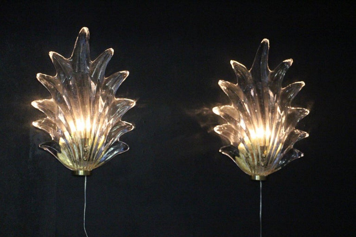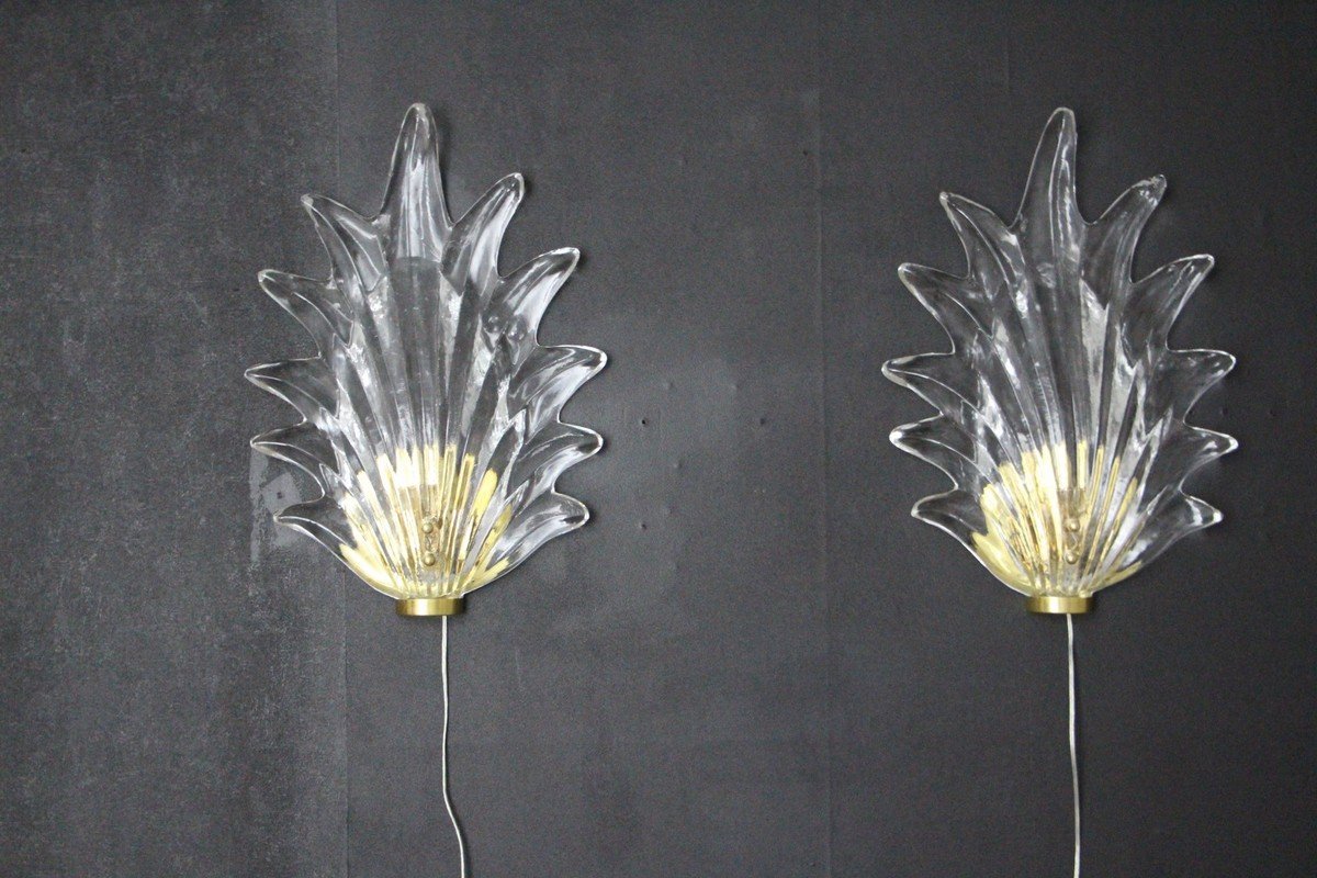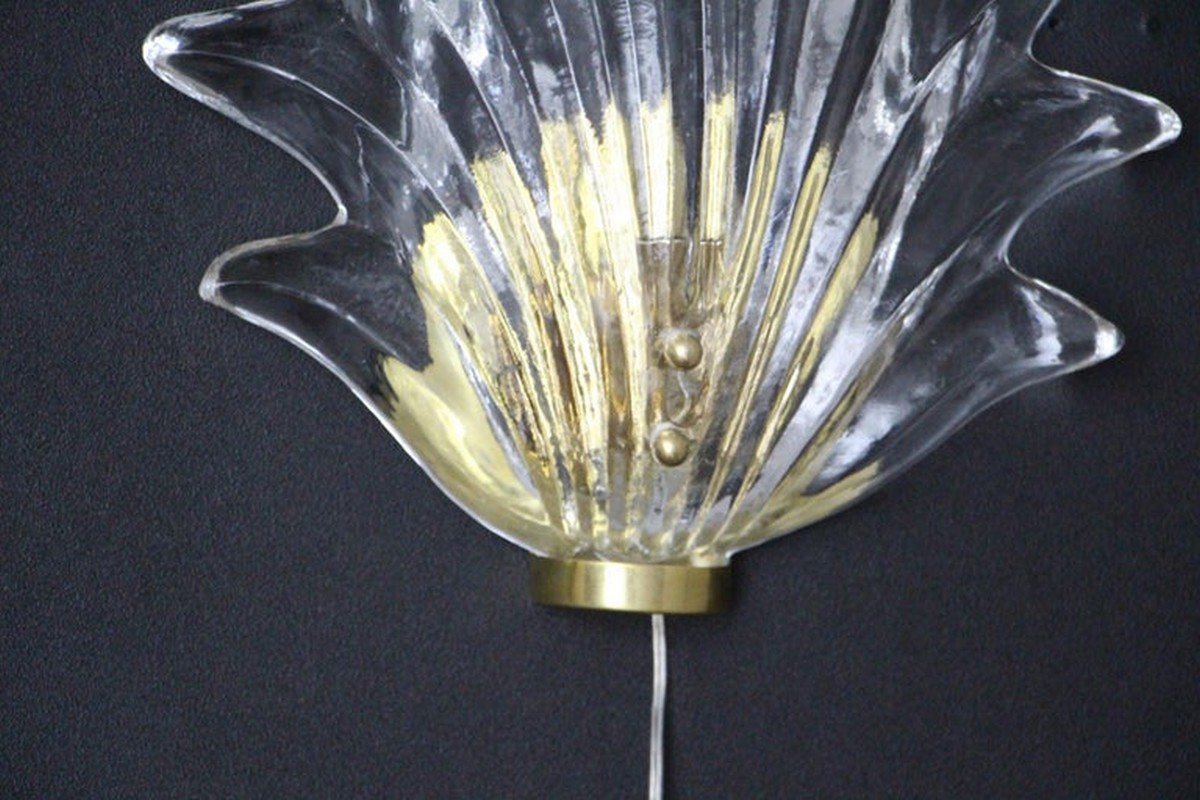 Clear Murano Glass Leaf and Brass Sconces by Barovier, 1980s, Set of 2
