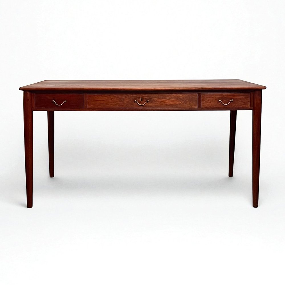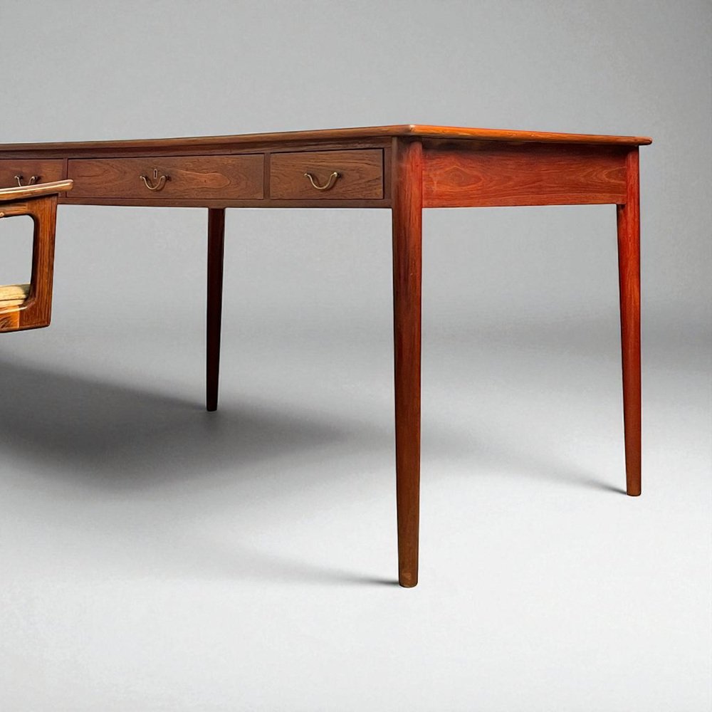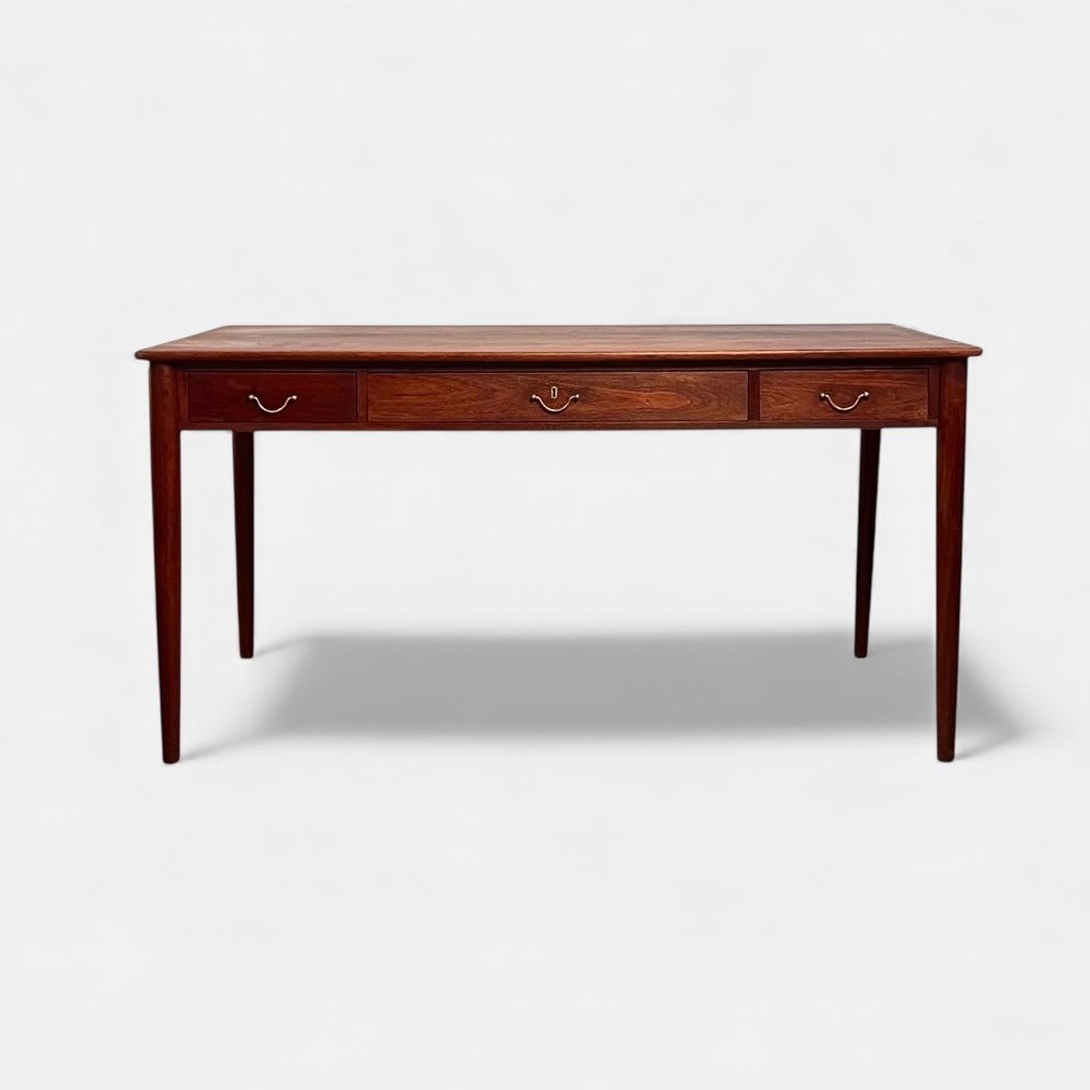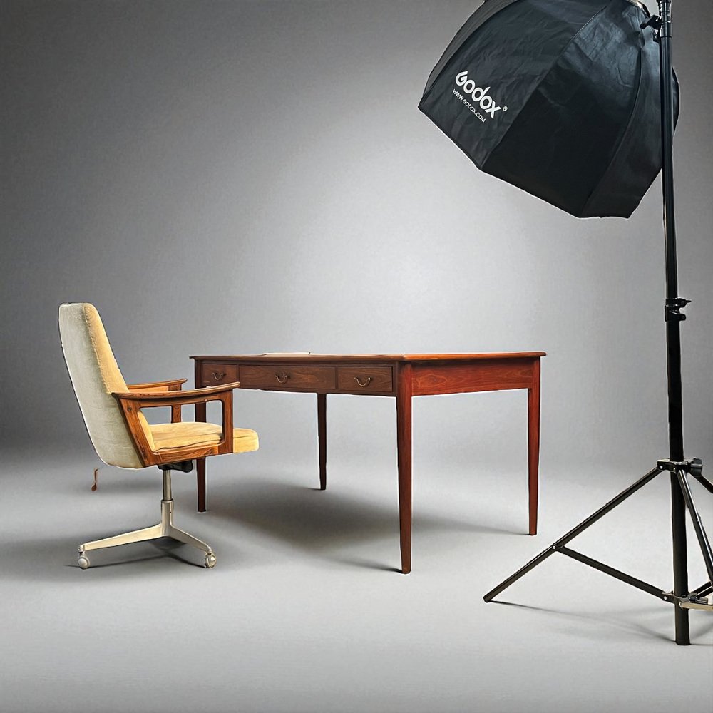 Between the 1940s and 1960s, Wanscher enjoyed fruitful collaborations with small-scale, artisanal cabinetmakers, like the masterful A. J. Iversen (1888-1979), as well as well as larger-scale Danish companies, such as France & Søn, Fritz Hansen, Poul Jeppesen, and Rud Rasmussen. With Iversen, he created the iconic Ladies Desk (1954) and Egyptian Stool (1957). Other standout Wanscher designs include the PJ-149 Colonial Chair (1949), Rungstedlund Dining Chair (ca. 1950), and PJ-112 Sofa (1951) for Poul Jeppesen; as well as the 110 Rocking Chair (1951) and Senator Easy Chair (1951) for France & Søn .