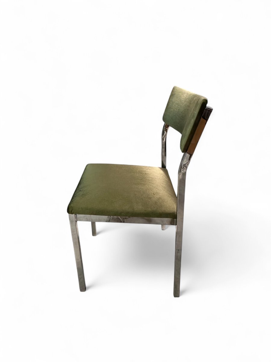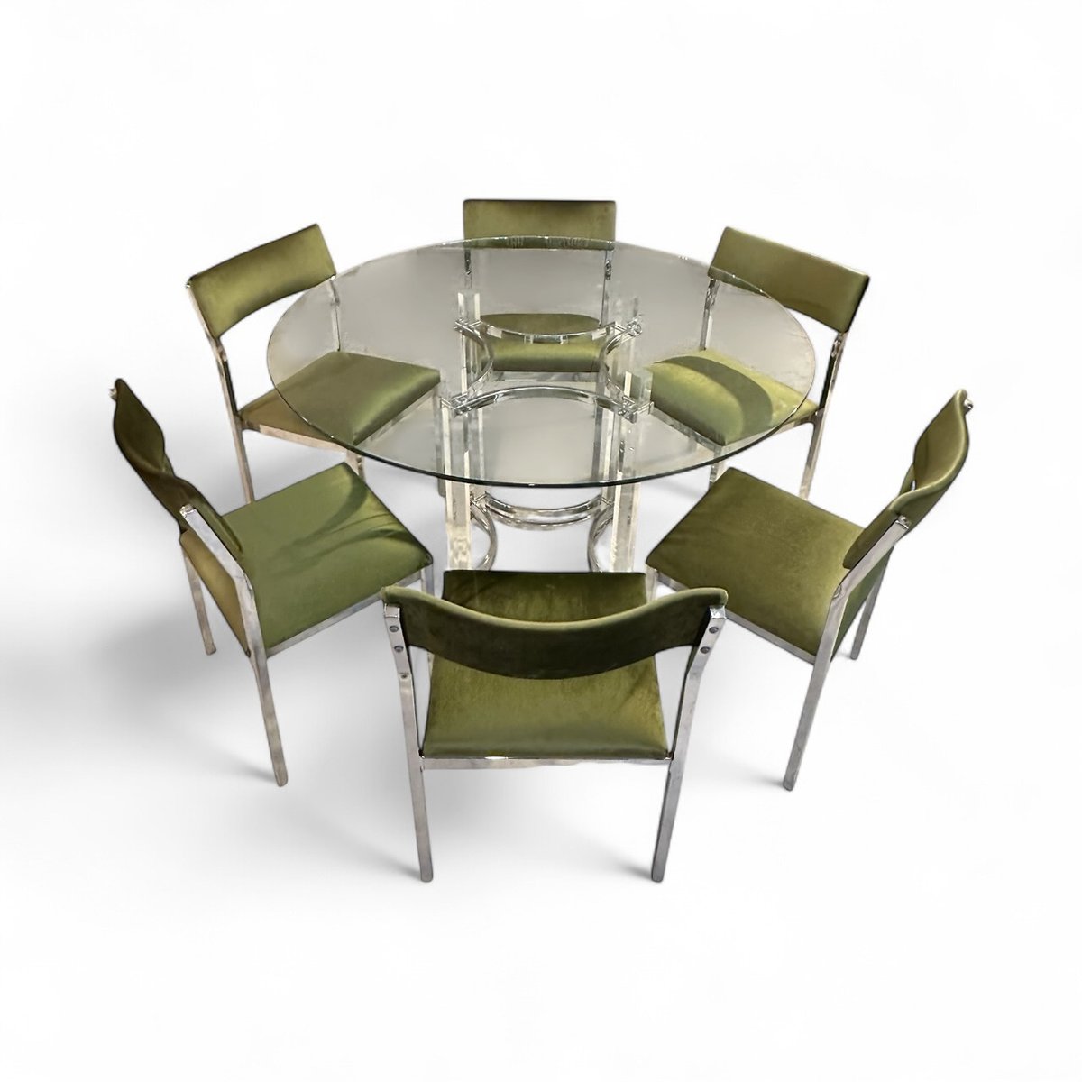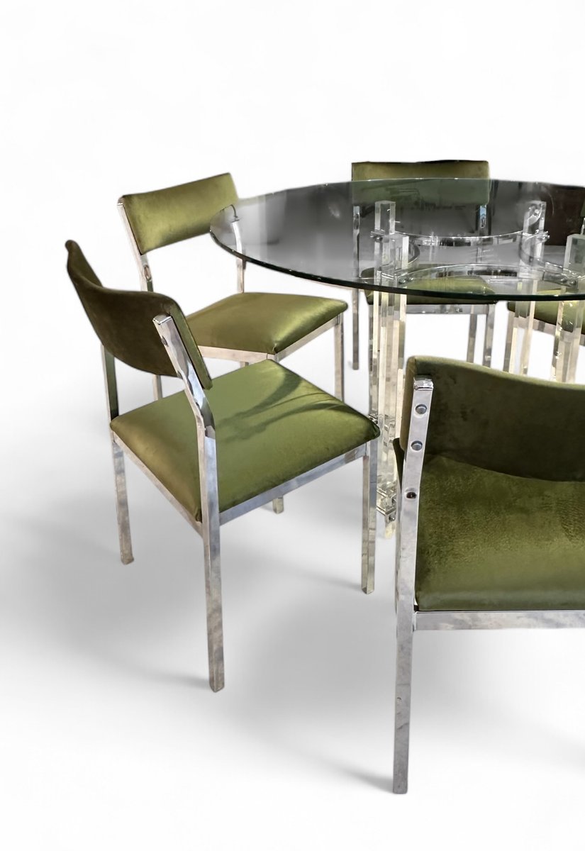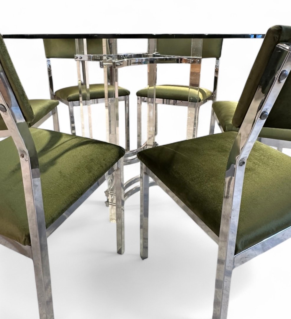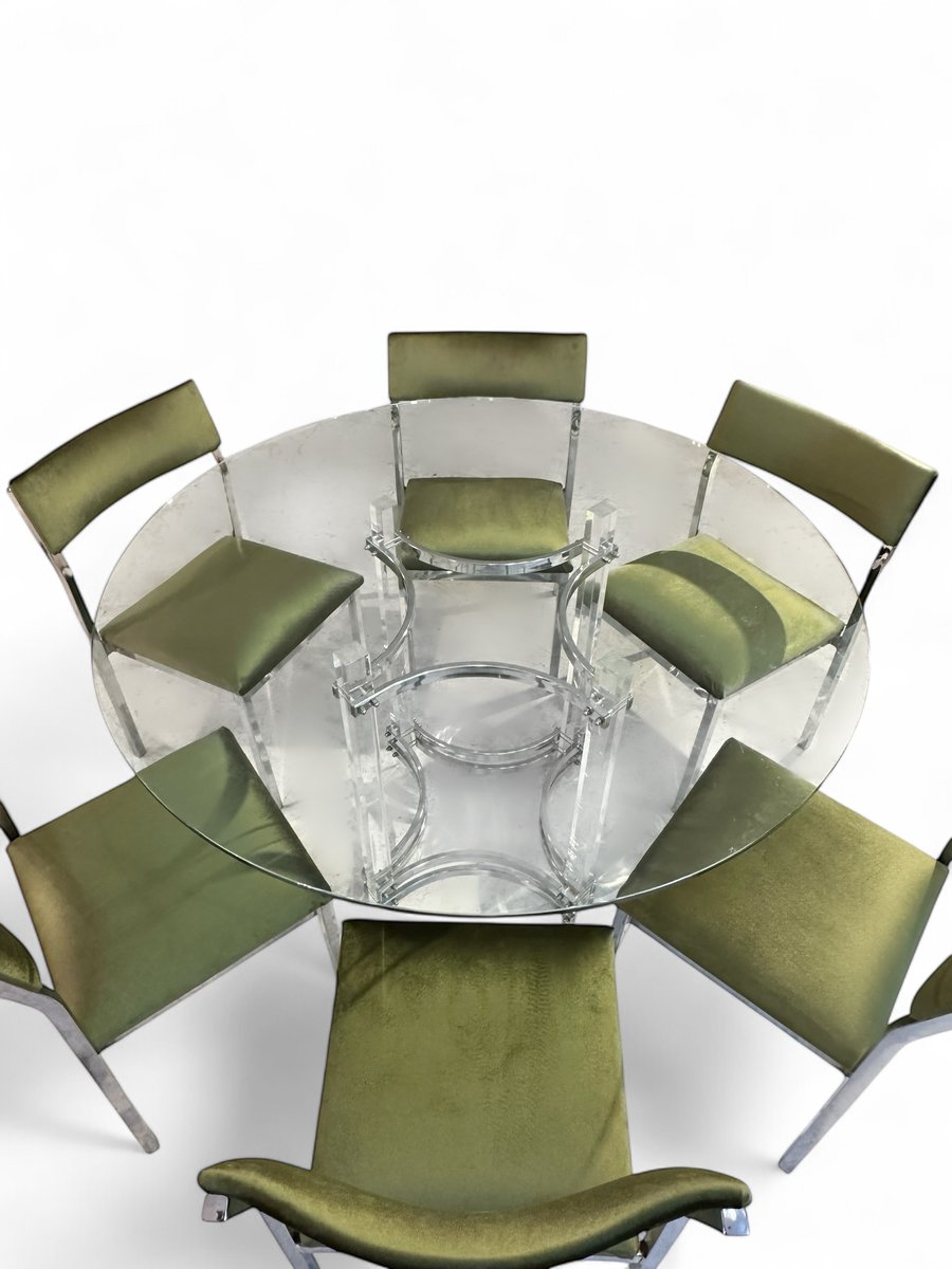 Dining Table with Chairs in Chrome and Green Velvet by Charles Hollis Jones for Merrow, 1976, Set of 7