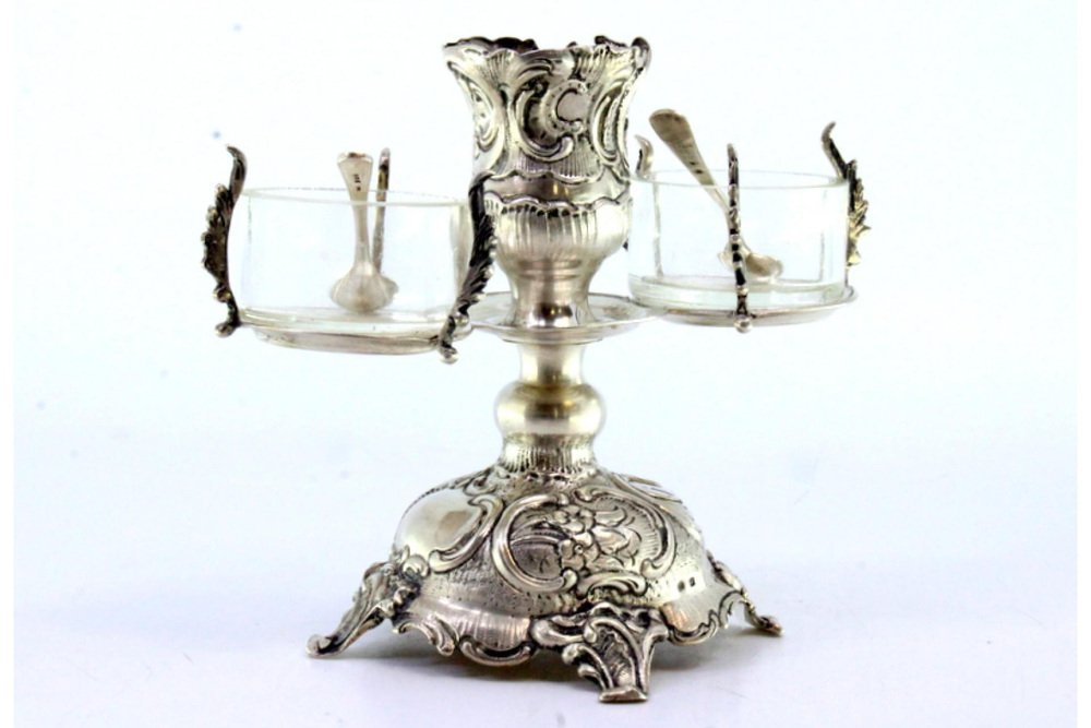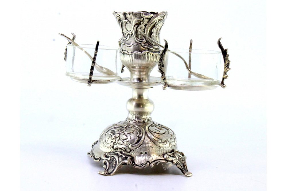 Embossed Silver and Glass Candlestick with Salt and Pepper Shakers and Spoons, Set of 3