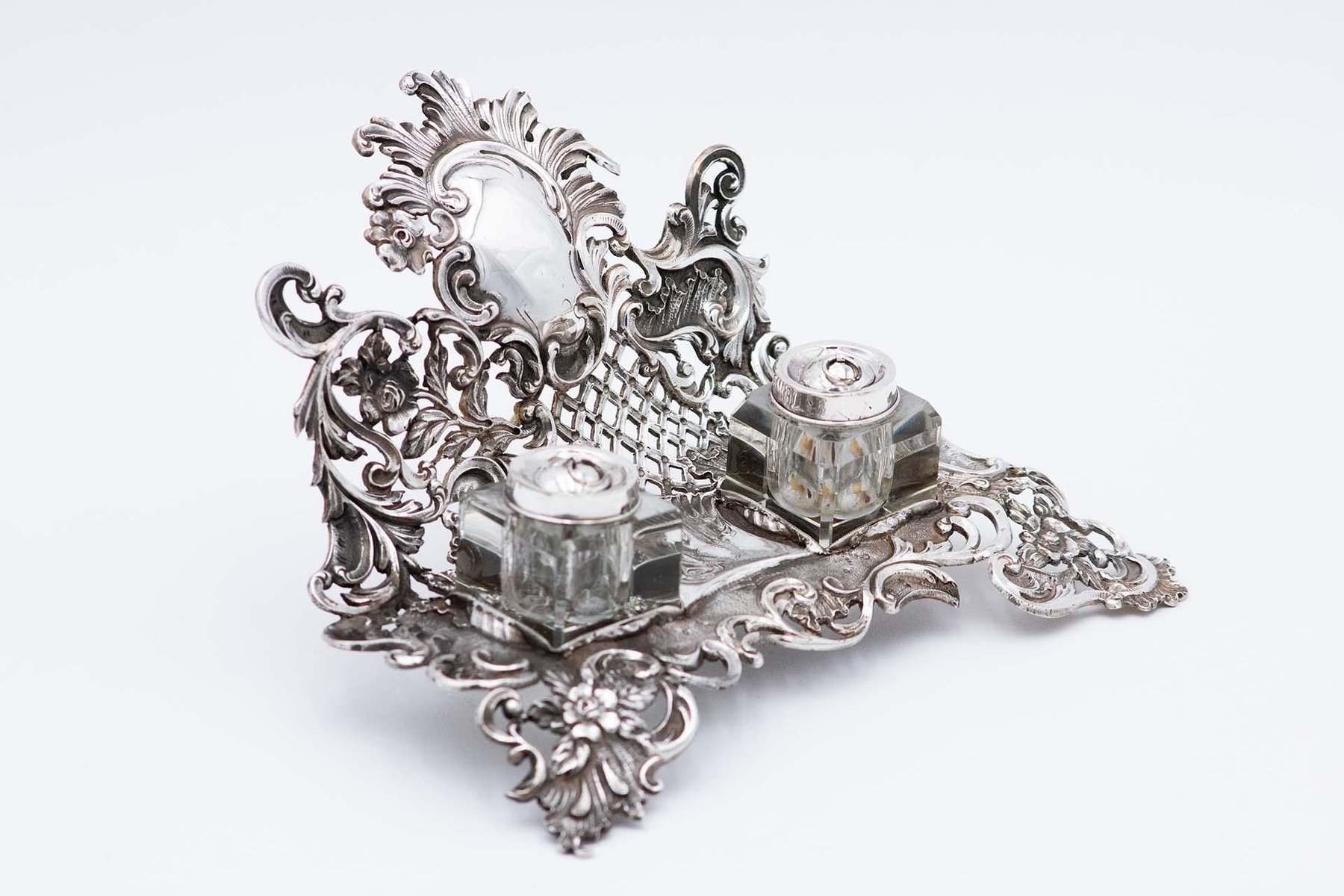 Embossed Silver Inkwell with Cutouts and Small Glass Tanks, Set of 3