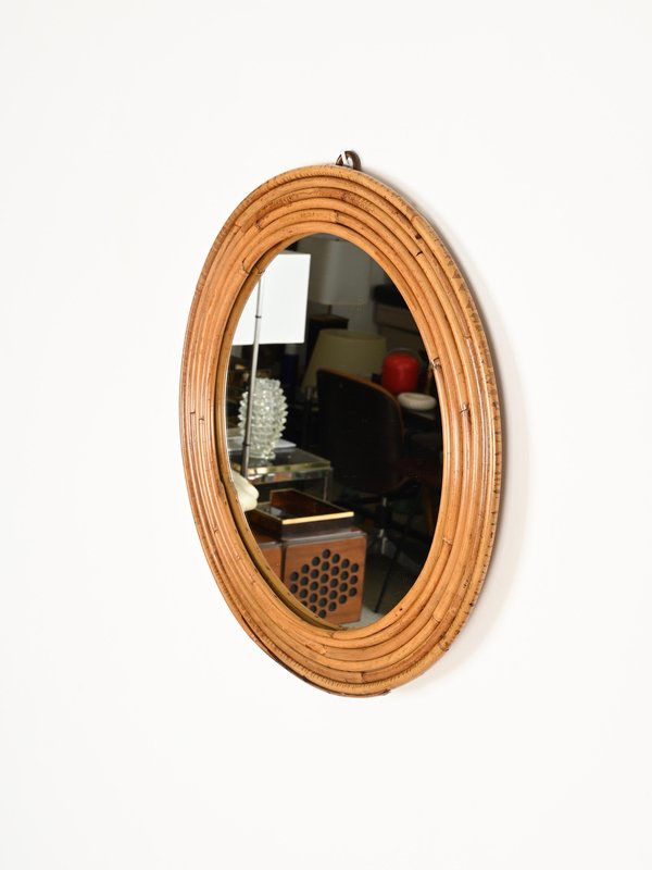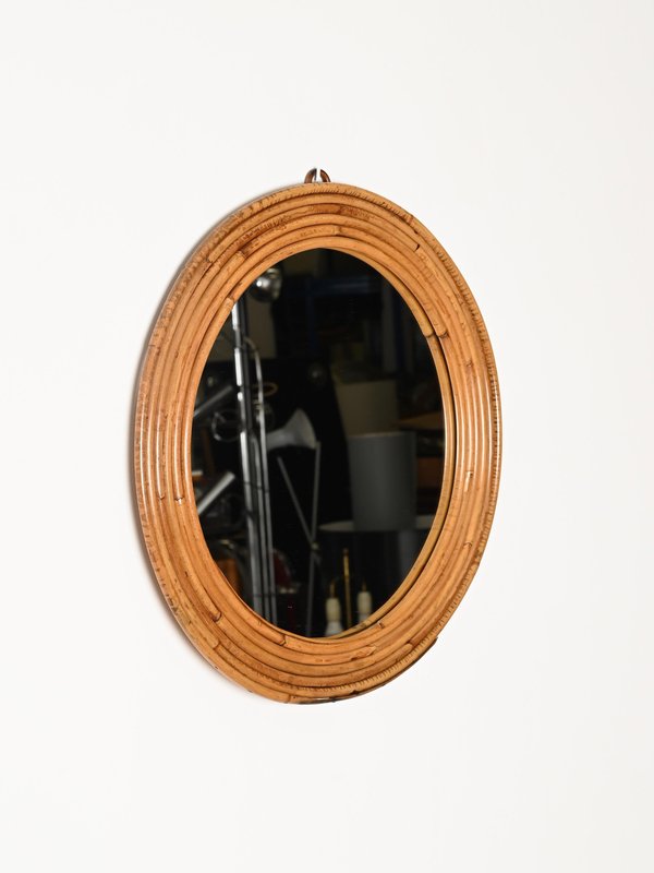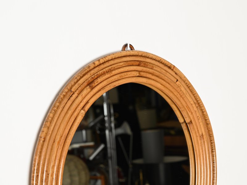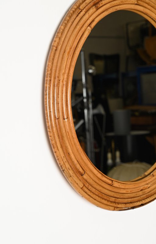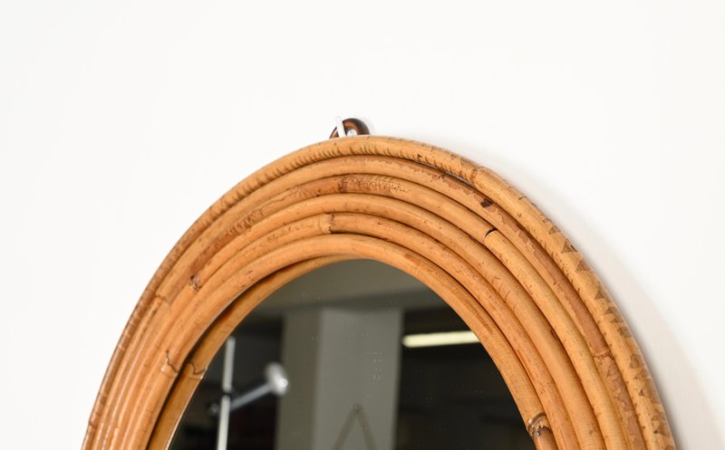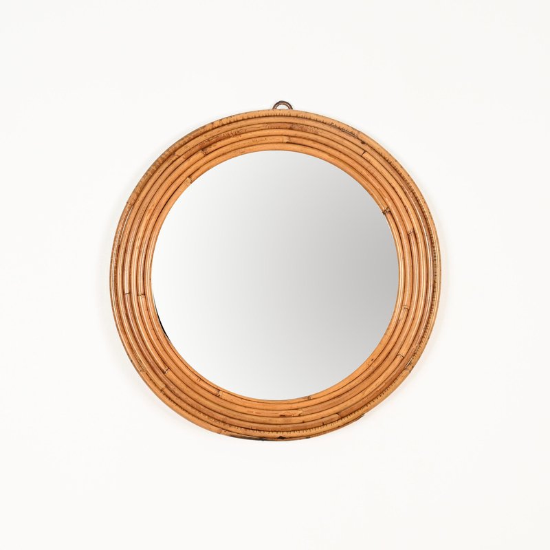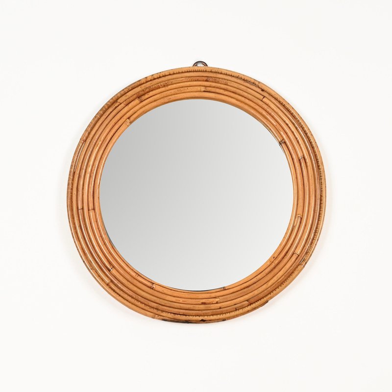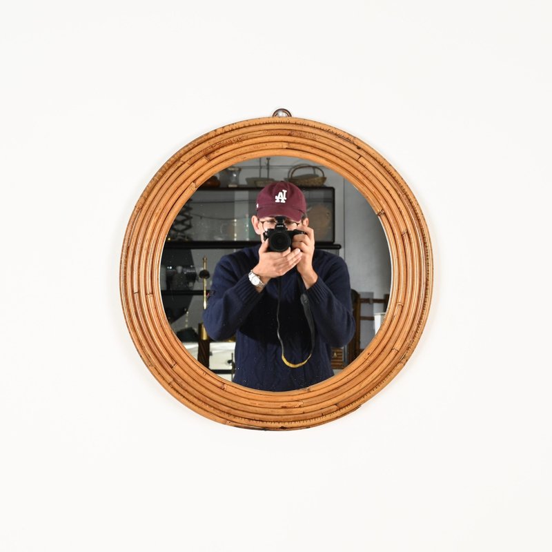 French Riviera Round Mirror in Curved Rattan attributed to Vivai del Sud, Italy, 1970s