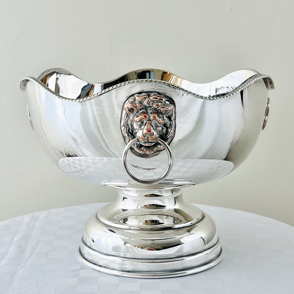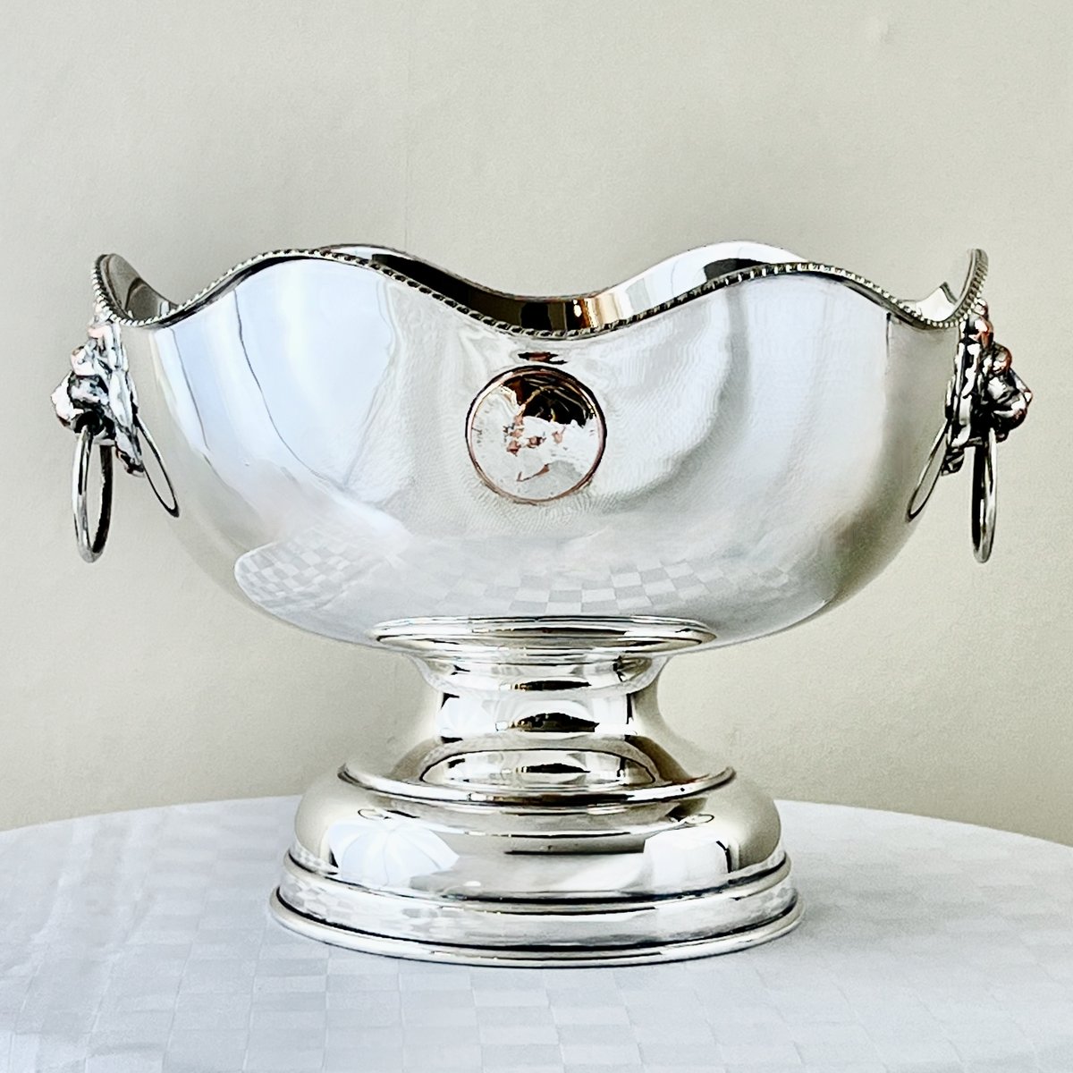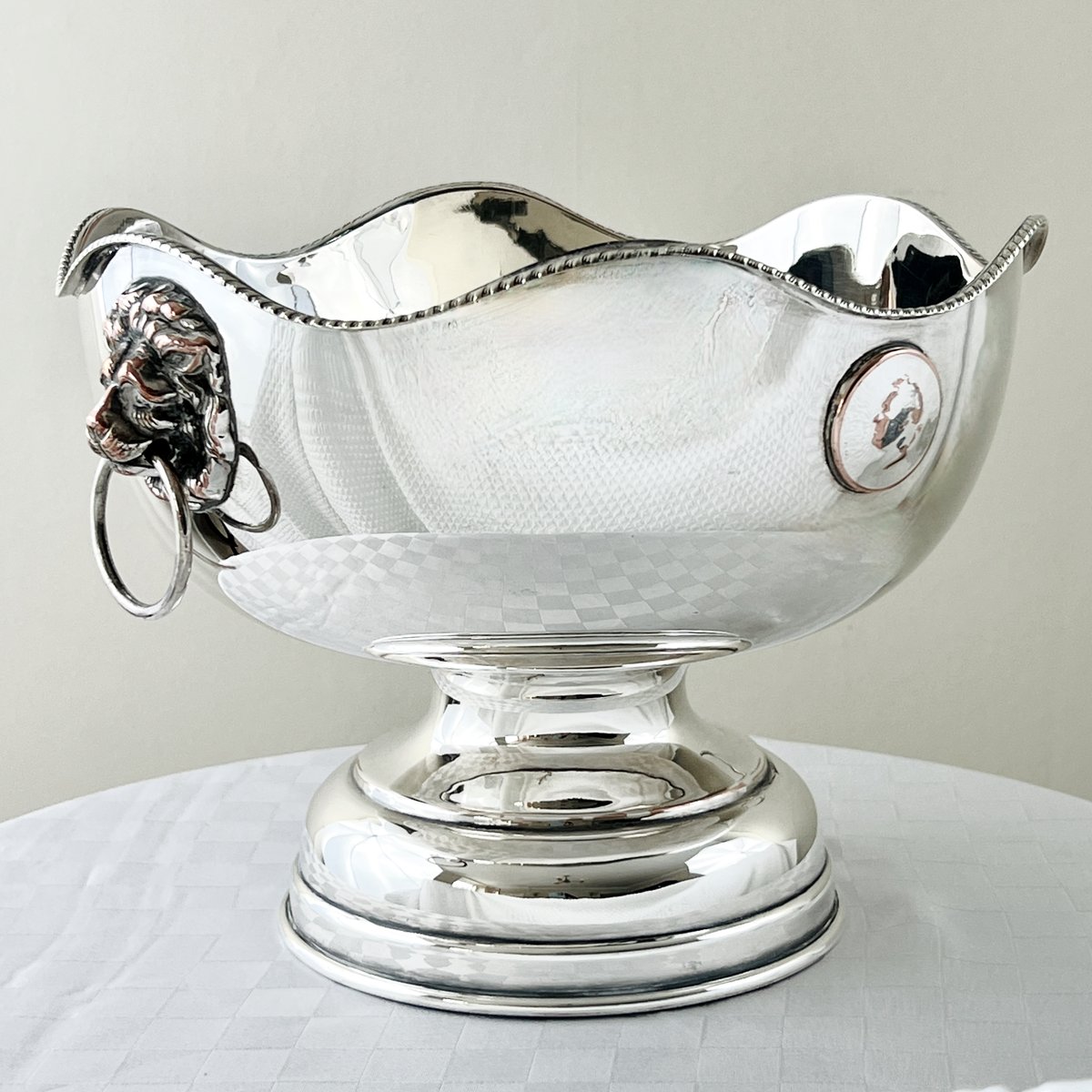 Georgian Style Silver-Plated Bowl with Lion's Head, Gadroon Rim, and Coin Medallions, 1930s-1950s
