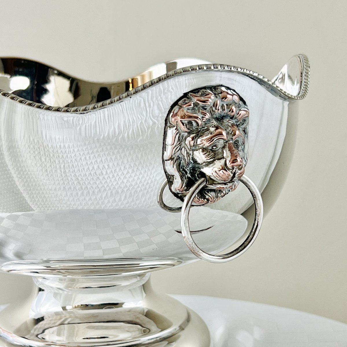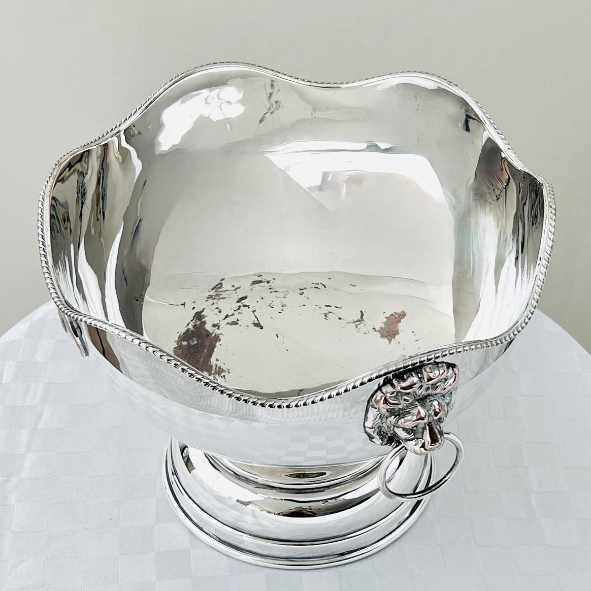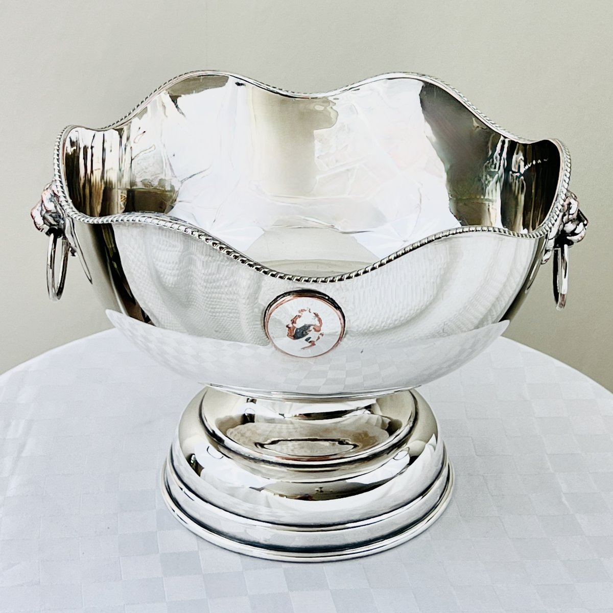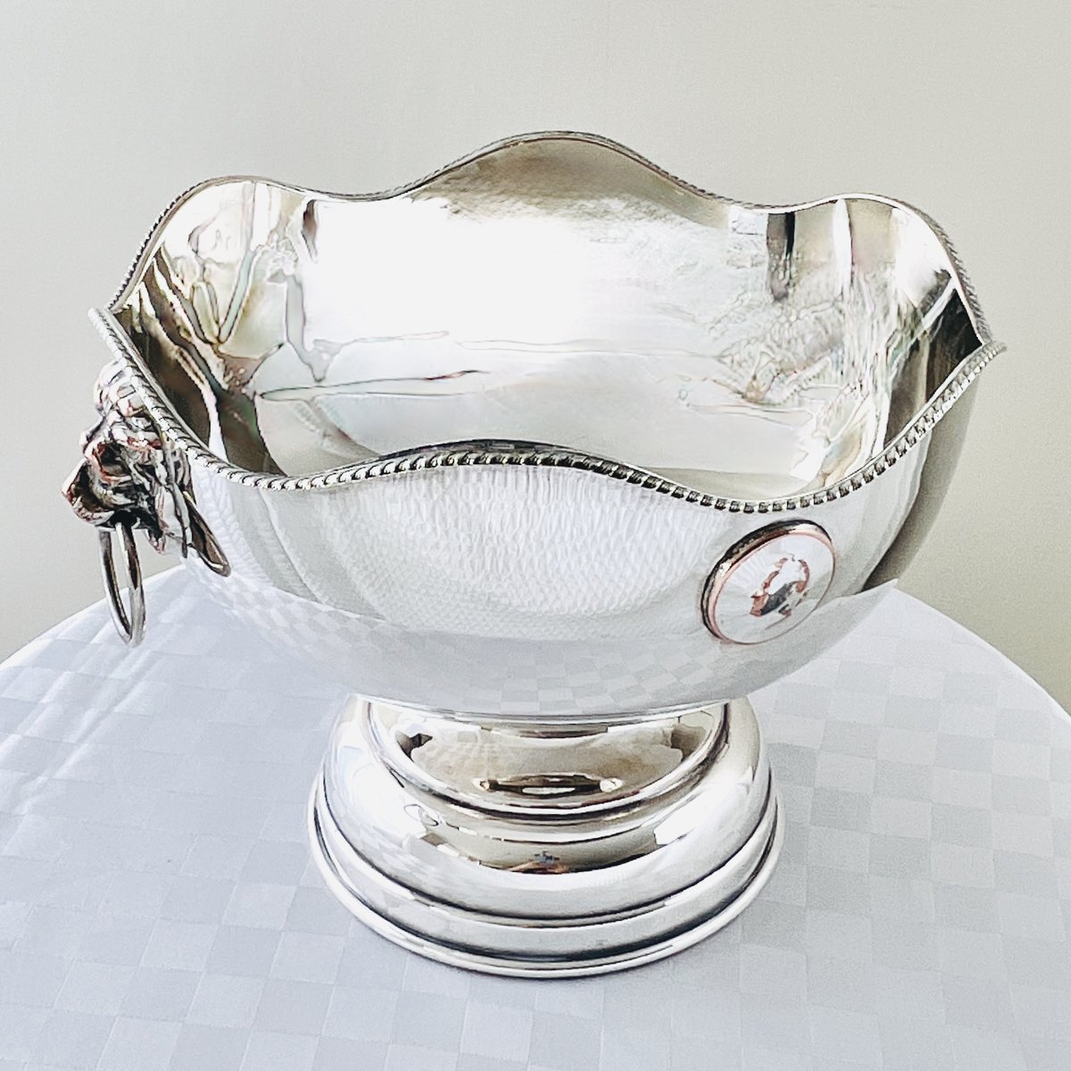 Georgian Style Silver-Plated Bowl with Lion's Head, Gadroon Rim, and Coin Medallions, 1930s-1950s