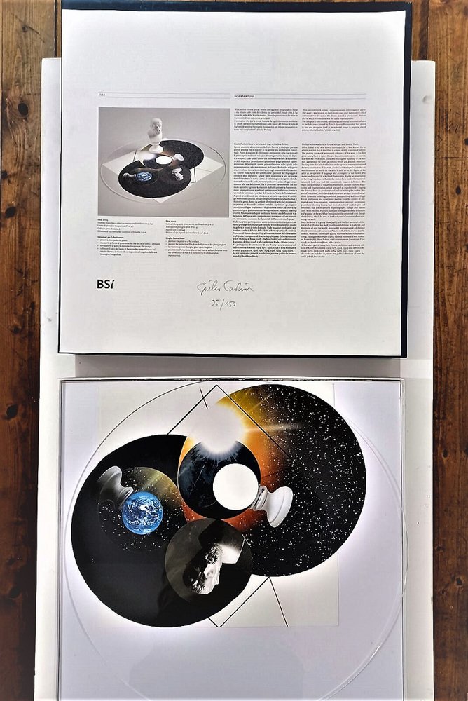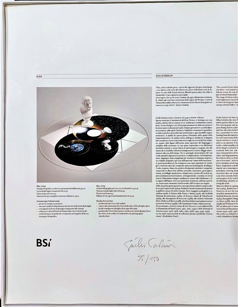 In the artist's words, "Elea, an ancient Greek colony - a name that today does not designates no place - was situated on the coast of Cilento near of the present city of Salerno: it was the seat of the Eleatic School, a pre-Socratic philosophy which had in Parmenides its main exponent. The image that here evokes it, far from any territorial reference, alludes to the light-years traversed by the figures of Time: Parmenides' face seems to find itself and recognize itself in the reflection in negative situated between the celestial bodies."