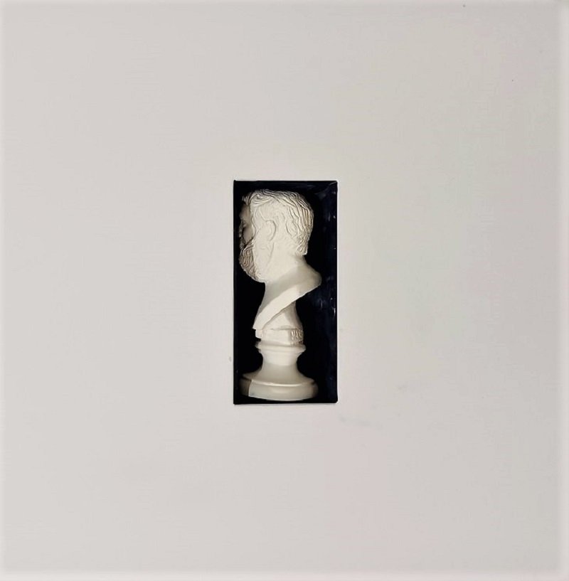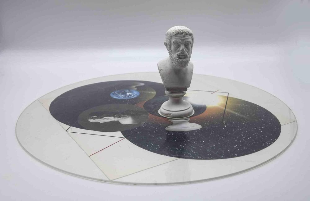 The plaster bust of the Greek philosopher Parmenides is placed on a plate of circular acrylic glass, which holds a shaped photographic image - as if consisted of two rounds offset from each other - in turn placed on a sheet