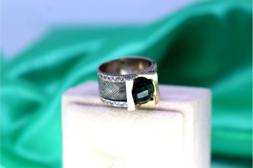 Gold and Silver Ring with Inlaid Zirconias and Cut Green Tourmaline