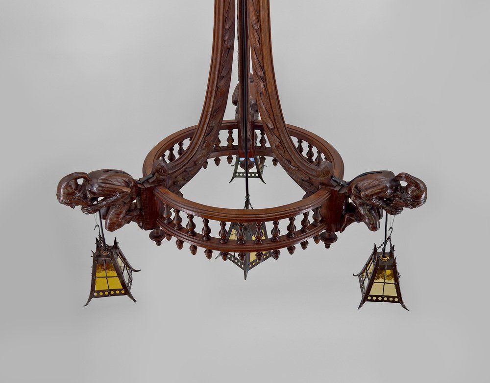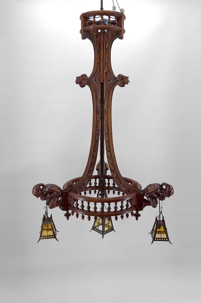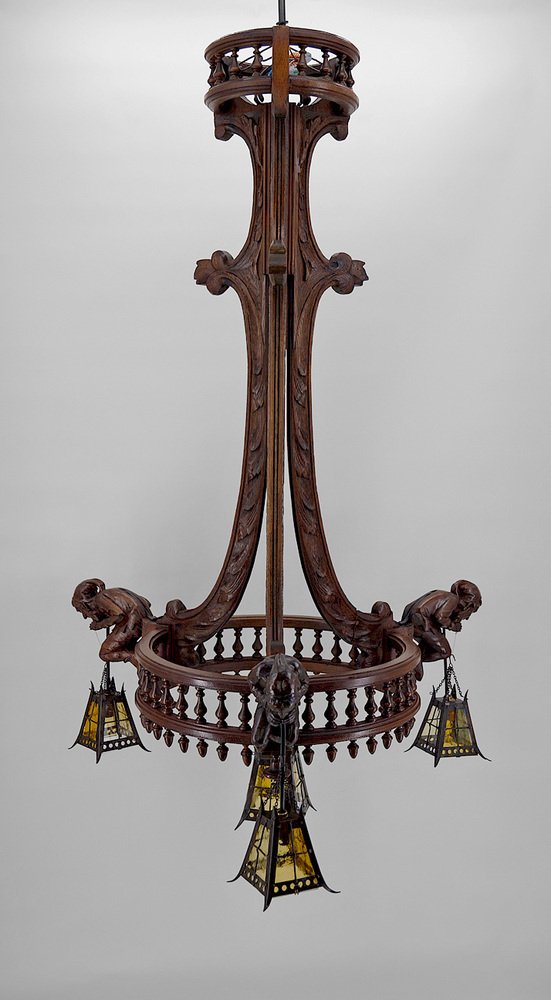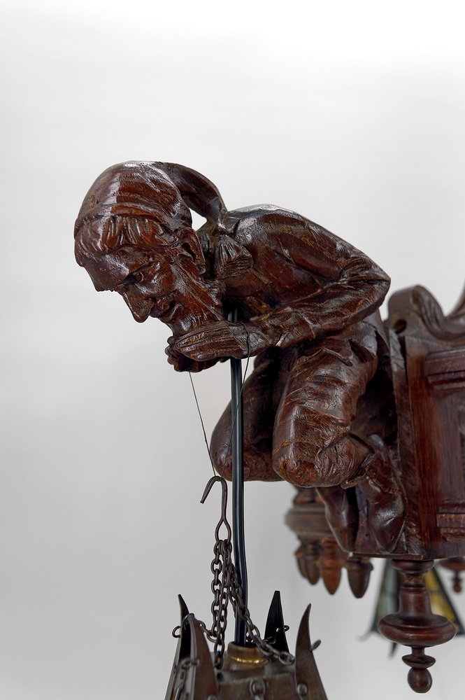 Gothic Chandelier Carved with Jesters & Lanterns, France, 1900s
