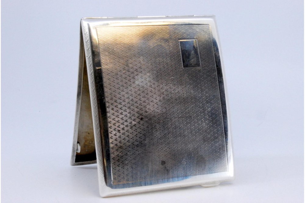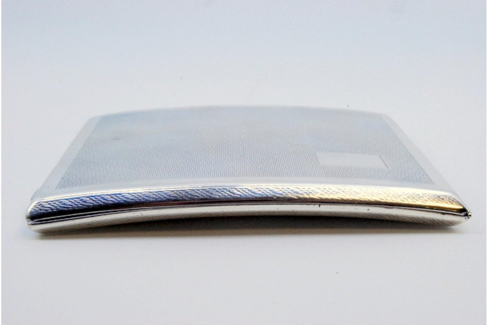 Guilloche Silver Cigarette Case with Curved Monogram Card, Polished Edges on the Edge and Hinged Lid