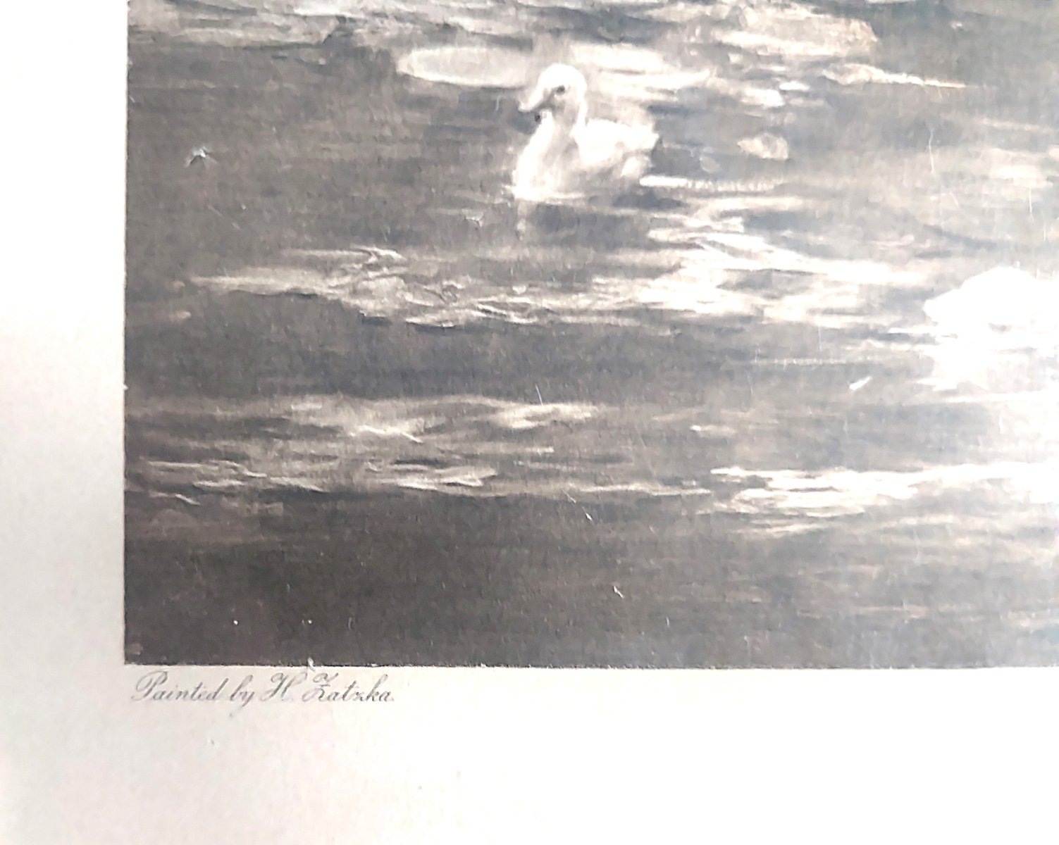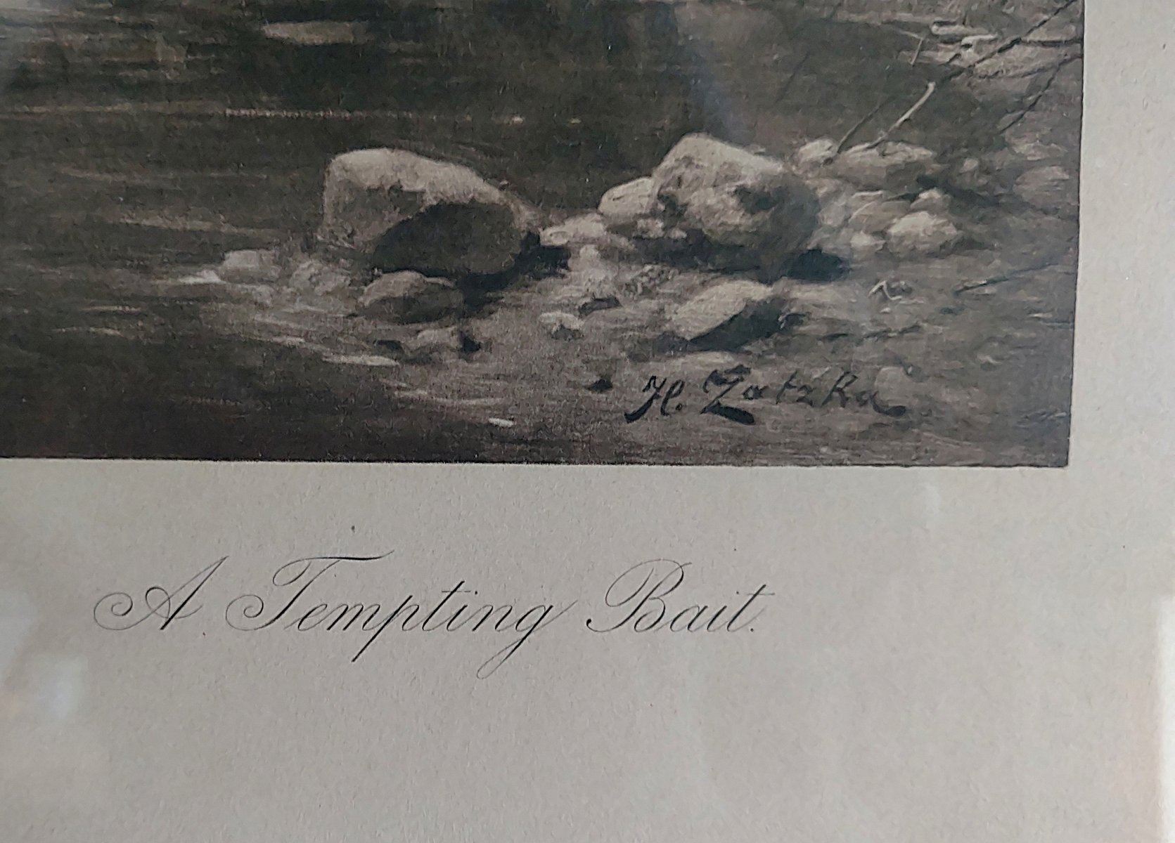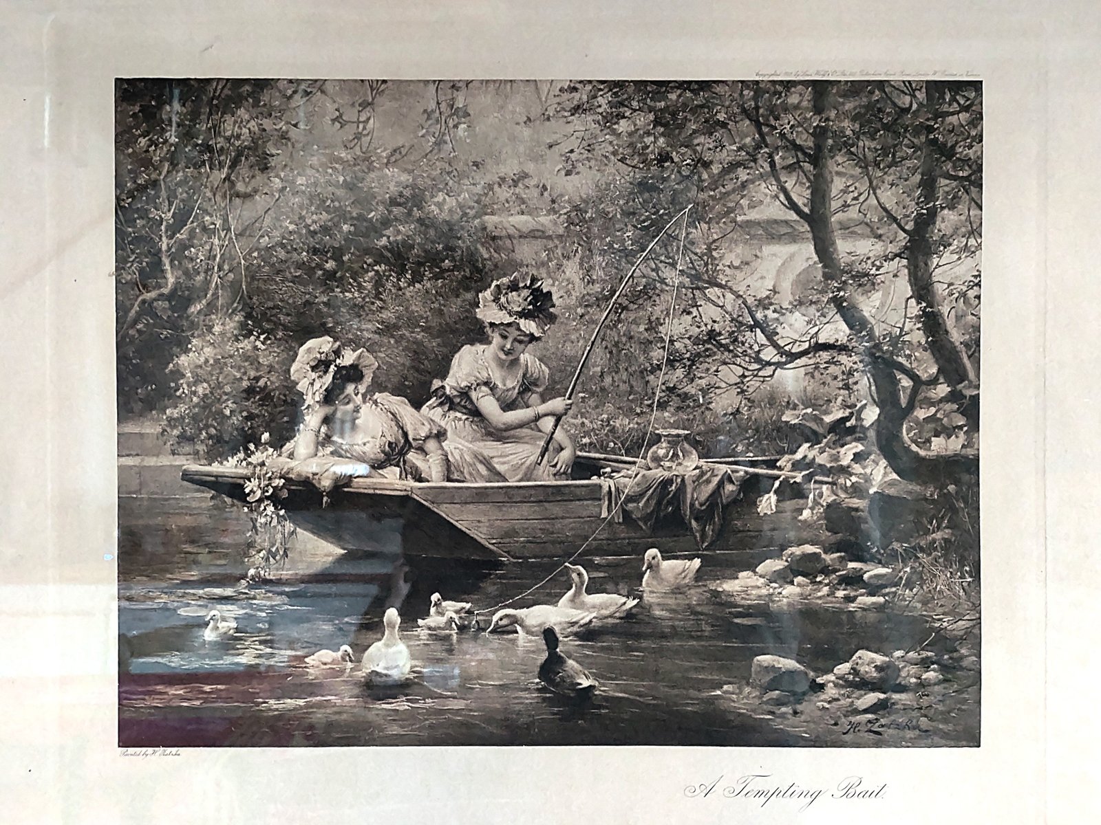 A beautiful print titled "Tempting Bait" by Hans Zatzka (1859-1945). Copyrighted 1905 by Louis Wolff & Cie Ltd (Established), 245 Tottenham Court Road, London - Printed in Vienna. Louis Wolff & Cie were London printmakers founded in 1878 who produced high-quality prints for both artists and popular artists of the time. Working from 1878 to around 1930, they used various printing methods, including etching, photogravure, and photography.