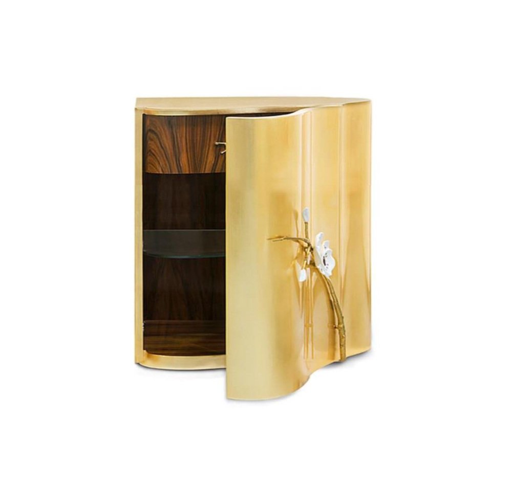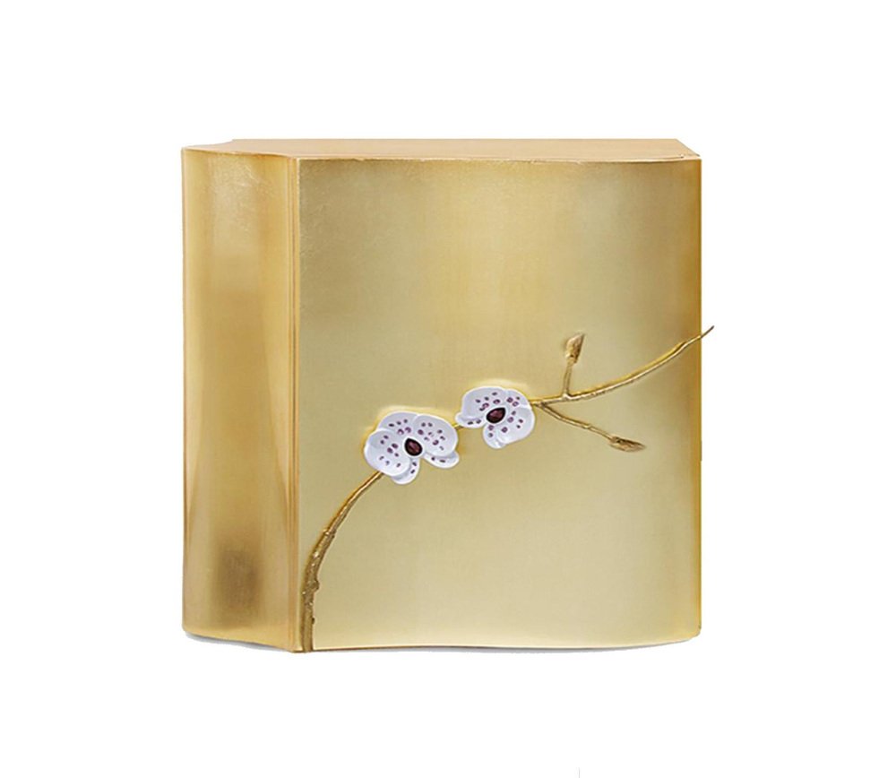 Set Of 2 Honor Bedside Table by Memoir Essence Dimensions: D 50 x W 60 x H 55 cm. Materials: Gold leaf, Swarovski crystals and iron wood veneer. Also available with a lacquered interior. Please contact us. Inspired in high jewelry Honor is characterized by a sinuous shape distributed along a curvilinear piece in gold leaf, adorned with metal orchid branches hand worked. This branches are ponctuated by Swarovski crystals who enhance the jewelry status of the bedside table. Memoir Essence Interiors has been writing its memoirs day by day, inspired in every detail lived through a feminine world, this world brings the most delicate imaginary. Jewelry, fashion, architecture, music, art and materials are Memoir’s inspirations to materialize a collection of design pieces of furniture, upholstery, lighting and accessories. The use of noble materials like marble, brass, veneers, gold and silver leaf, Swarovski crystals as other decorative and fine materials, combined with handwork techniques as casted brass, hand-whickered fabric ribbons, gold leaf appliance, marble cutted and puzzled pieces, provide the needed essence to tell memoirs through the designed pieces and the interiors they fulfill. This collection mostly handmade and focused on details and material nobility is made in Portugal, bringing handwork techniques that are part of Portuguese history, applied in a current and differentiated way, delivering timeless pieces to your special projects. Acquire Memoir is the opportunity to travel through the feminine essence over design and experience a unique “memoir” of timelessness and exclusivity. Writing is first chapter in 2016, after a journey of inspirational research, forecasting and design, Memoir made its first appearance at Maison et Objet, Paris. Since then Memoir is “writing” memories adding new materials, designs, techniques and appearances around the world, as in Paris, London or UAE. Memoir will continue this journey, always motivated by the inspiration possibilities in the many delicate details found in feminine world. Tell your memoires with this collection and be a memorialist yourself…