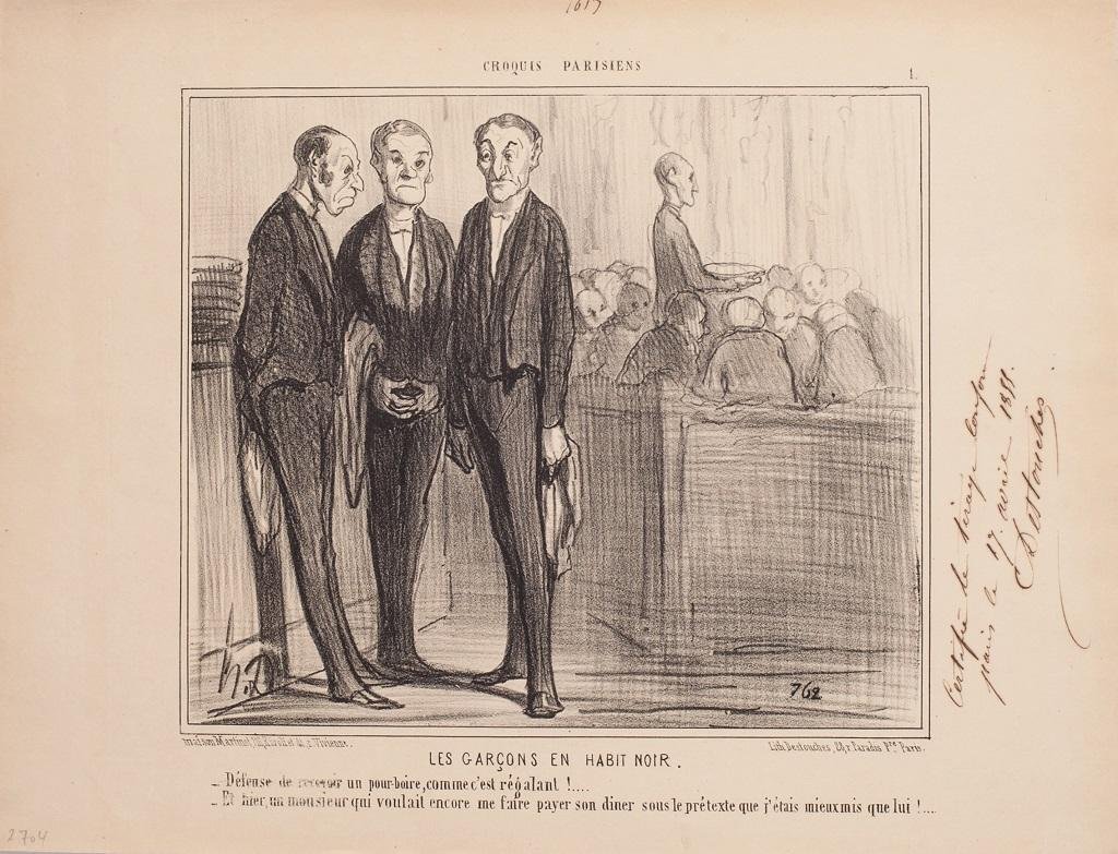 Les Garçons en Habit Noir is a b/w lithographed plate, from the series containing a total of 120 prints, Croquis Parisiens. Realized by Honoré Daumier (France, 1808-1879) and published in the French Periodical, Le Charivari on April 25th, 1855, in the Journal Amusant and in the Petit Journal pour Rire between September 1852 and February 1877. State 2 of 2 Gift of Mr. and Mrs. Stanley Talpis. Superb specimen, all margins, on thin vellum. With Autograph certificate of circulation in pen and sepia ink, signed and dated by Trinocq or Destouches. Light rednesses, minor aging signs at the edges. Excellent condition. Reference: Delteil, Loys. Le peintre-graveur illustré: Daumier, Vols 20-29. Paris: Chez l'auteur, 1906-1926. Honoré-Victorin Daumier (Marseille,1808 – Valmondois, 1879) The French painter, sculptor, and printmaker, through his artworks, Honoré Daumier, offers us commentary on the social and political life in France, from the Revolution of 1830 to the fall of the second Napoleonic Empire in 1870. Caricatures and cartoons of political figures, satirizing the behavior of his countrymen in newspapers and periodicals was his main activity, for which he became popular in his lifetime and is remembered and appreciate still today. He was a republican democrat whose targets were the bourgeoisie, the church, lawyers and the judiciary, politicians, and the monarchy. His talented and satiric pencil had a very high cost on his life: he was jailed for several months in 1832 after the publication of Gargantua because of a offensive depiction of King Louis-Philippe. Charles Baudelaire noticed the Daumier's production and greatly admired his paintings, which were to have an influence on a younger generation of impressionist and post-impressionist painters. Later generations have come to recognize Daumier as one of the great French artists of the 19th century. Daumier was prolific artist that produced more than 100 sculptures, 500 paintings, 1000 drawings, 1000 wood engravings, and 4000 lithographs
