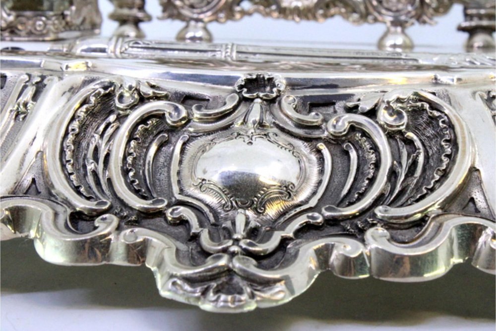Inkwell in Cut Silver with Shell Reliefs, Letter Holder, Pen and Feet
