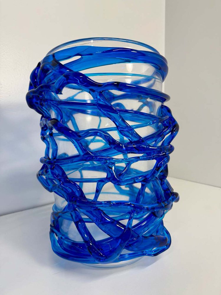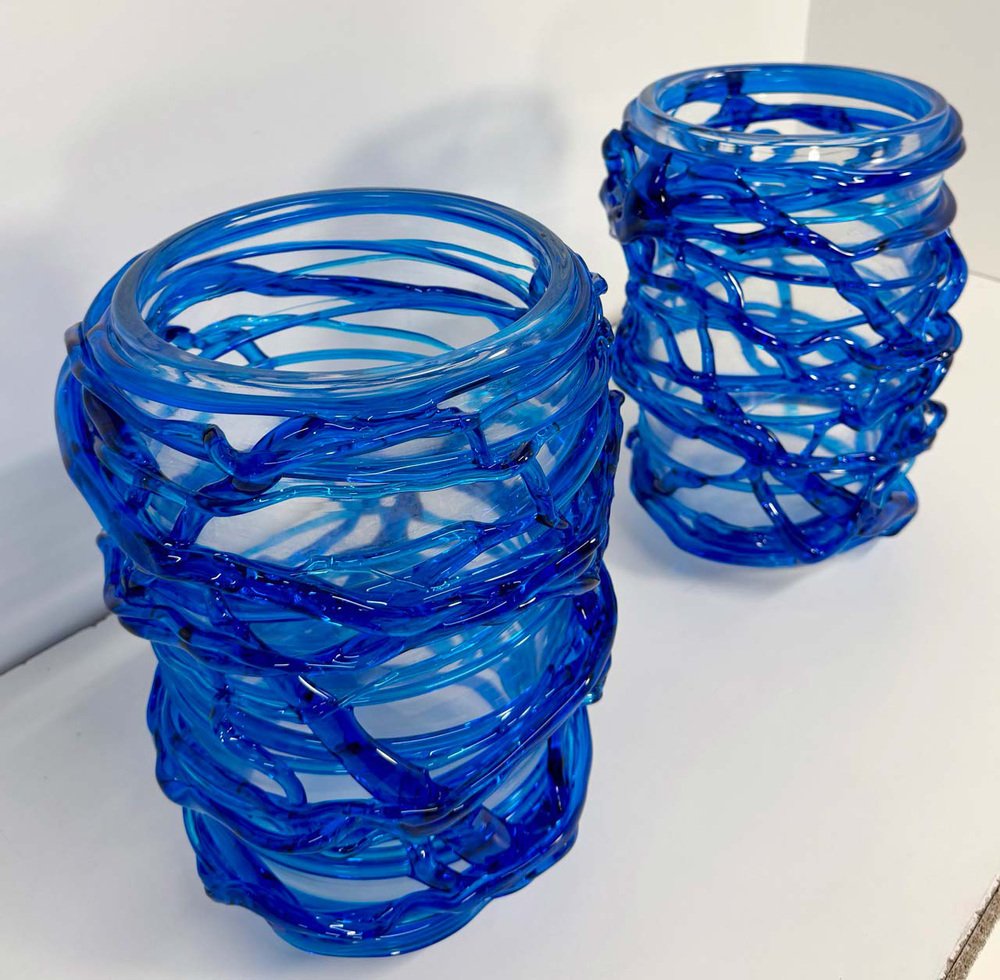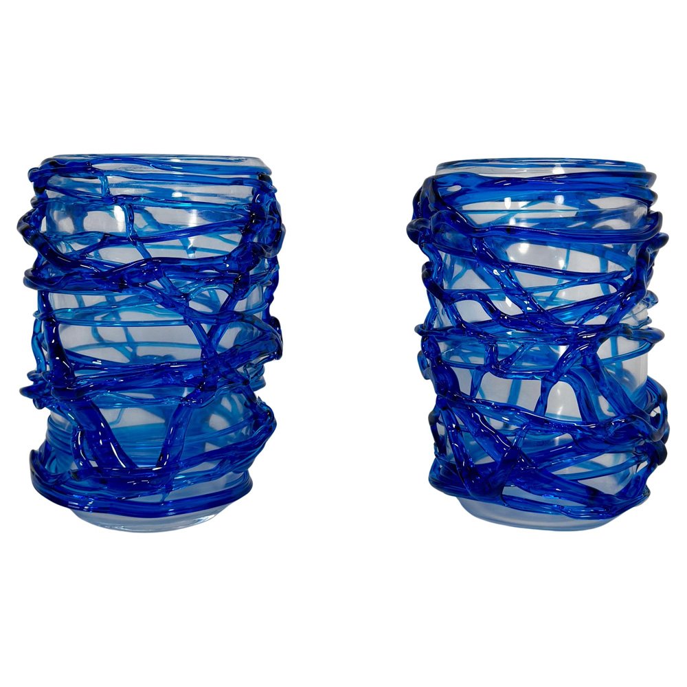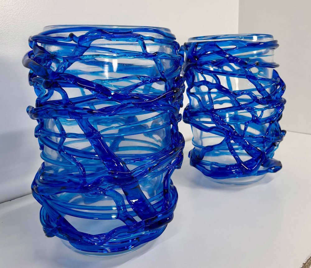 Italian Art Deco Style Cobalt Blue Murano Glass Vases by Cenedese, 2000s, Set of 2
