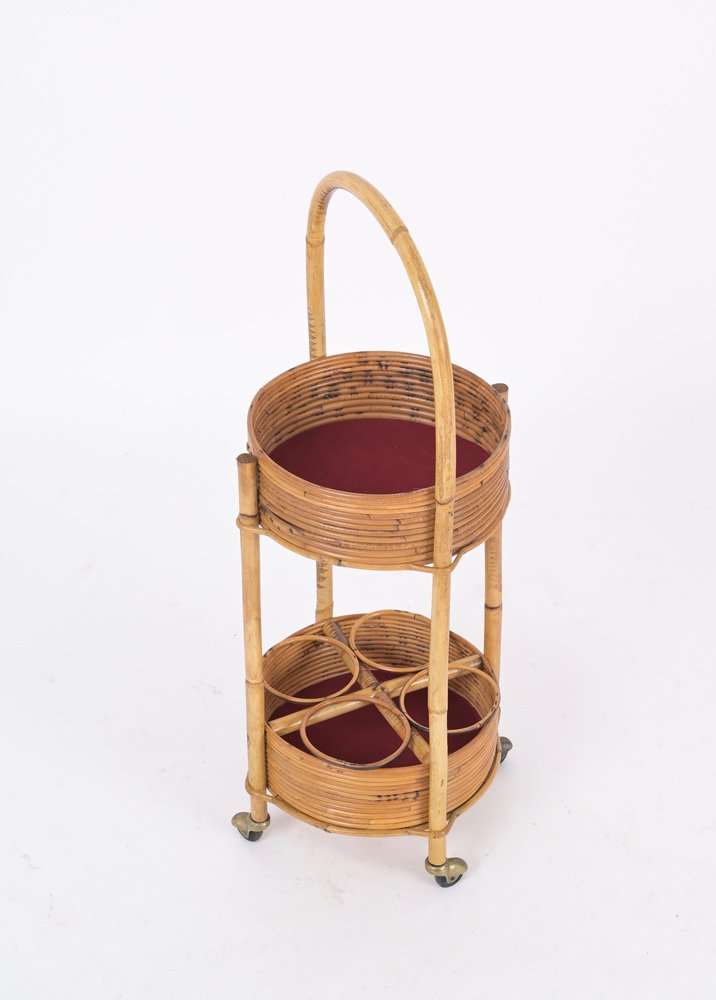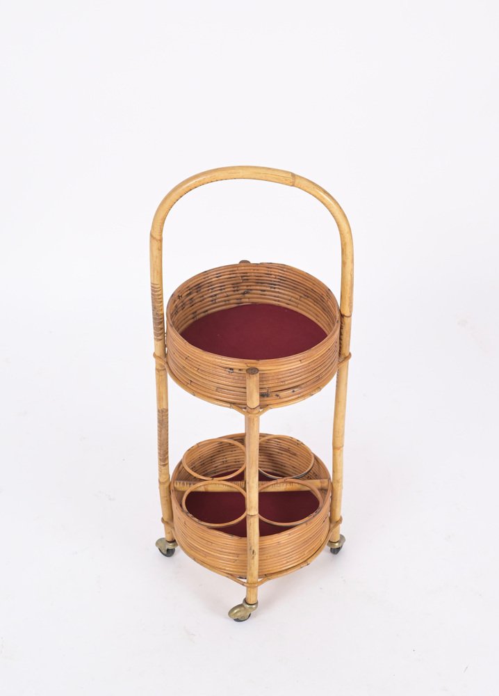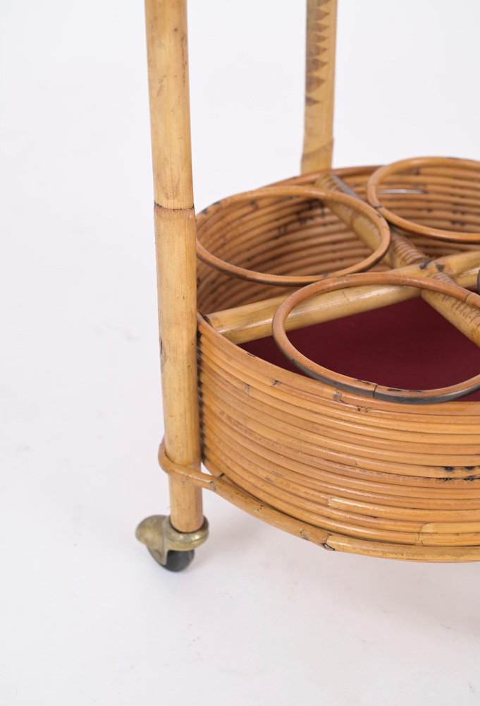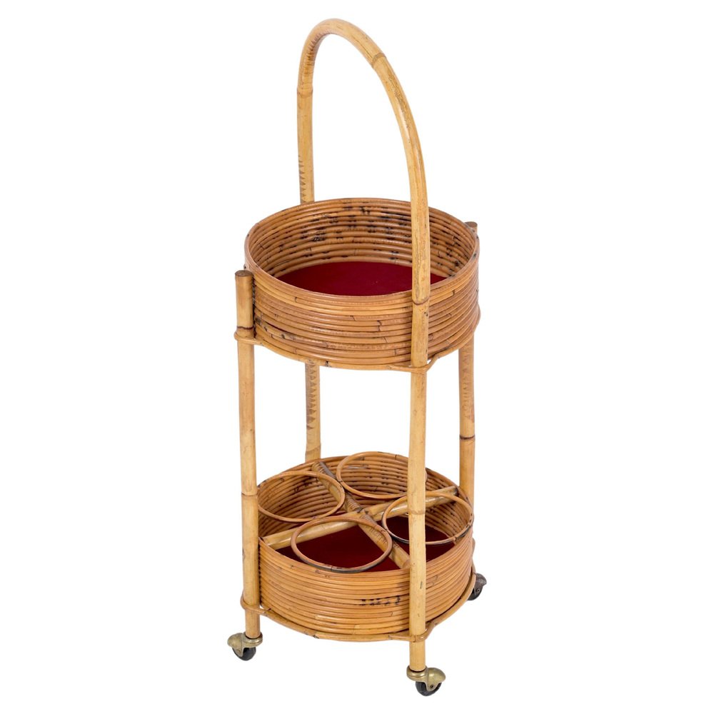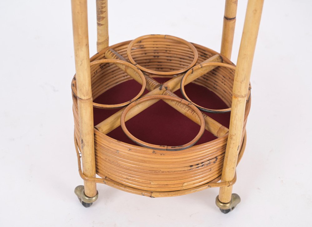 Italian Bar Cart Trolley in Bamboo, Rattan and Red Velvet, 1960s