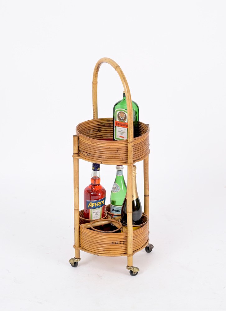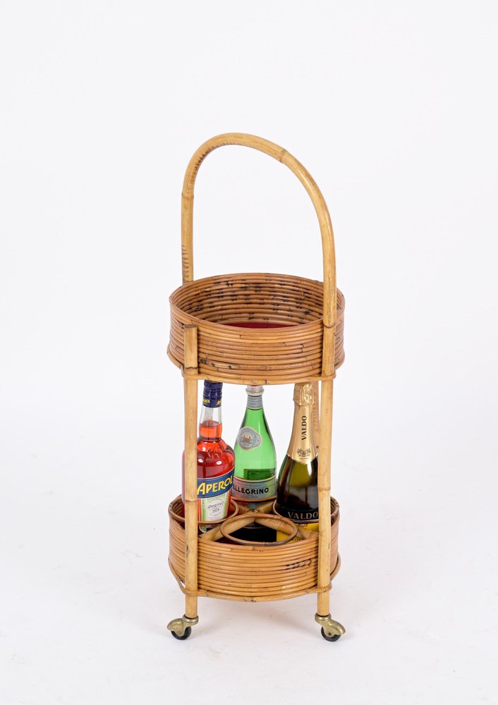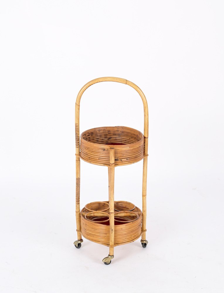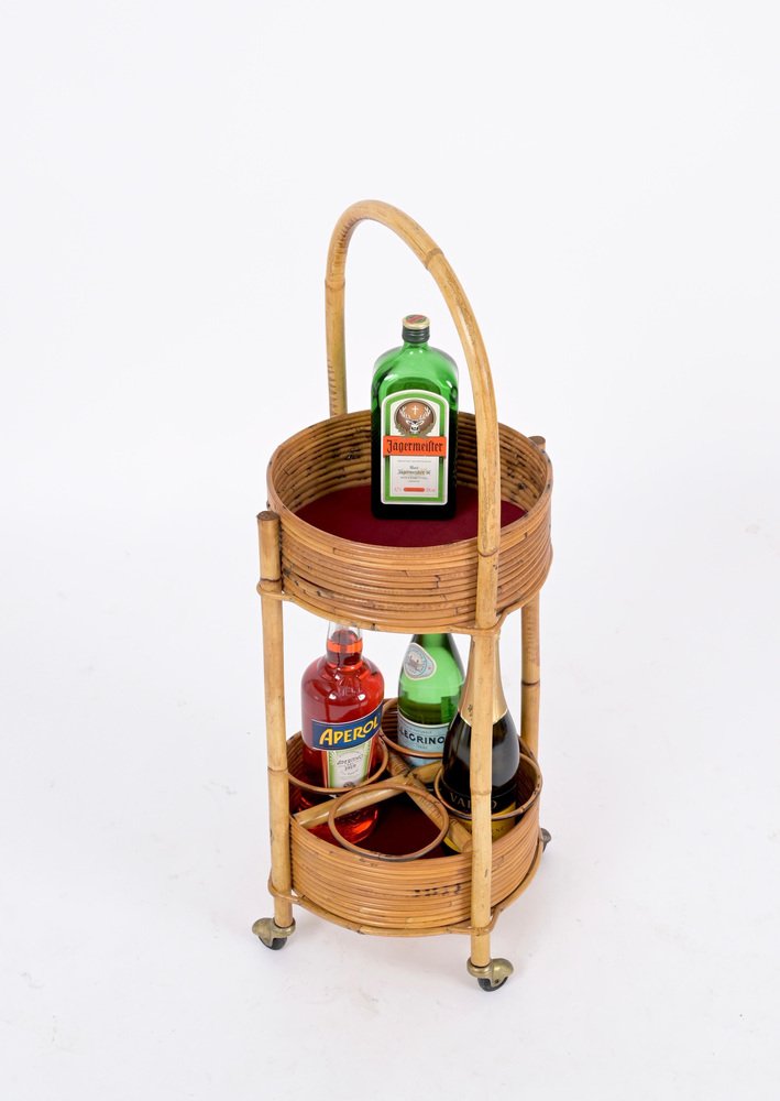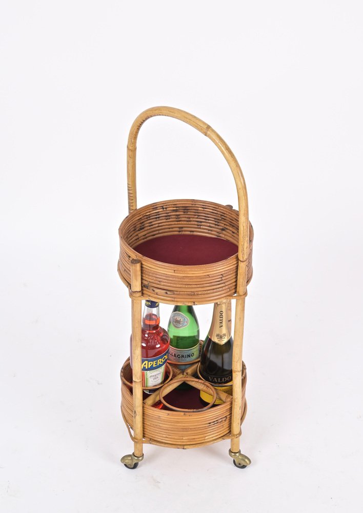 Italian Bar Cart Trolley in Bamboo, Rattan and Red Velvet, 1960s