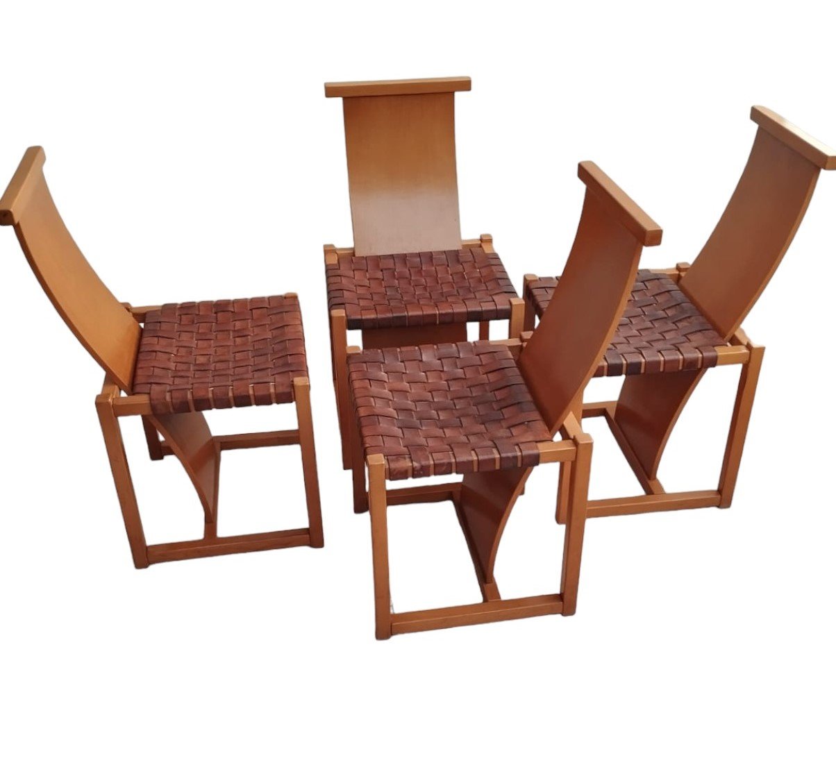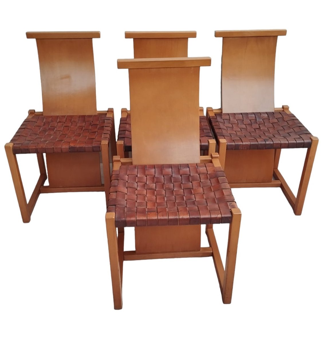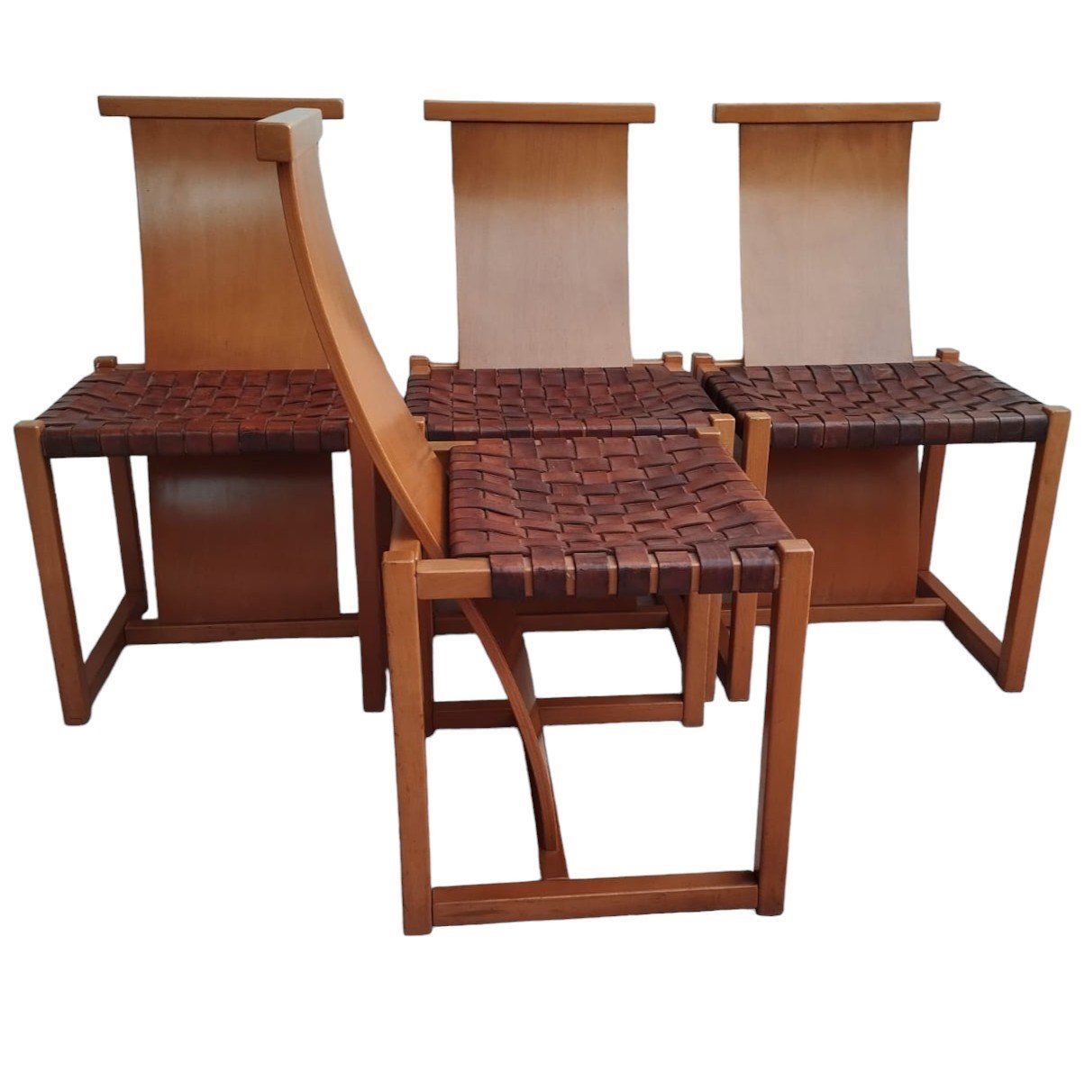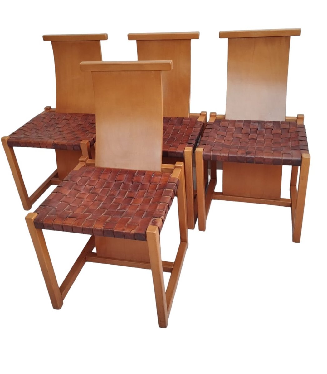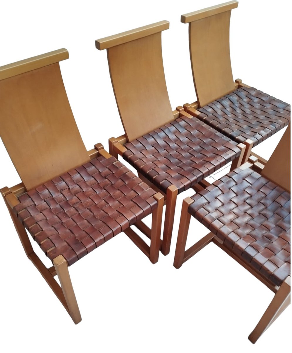Italian Beech and Woven Leather Chairs, 1970s, Set of 4