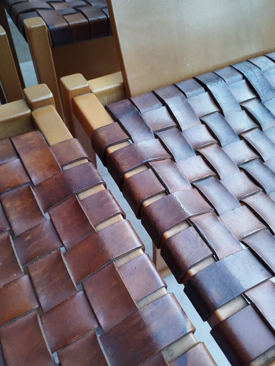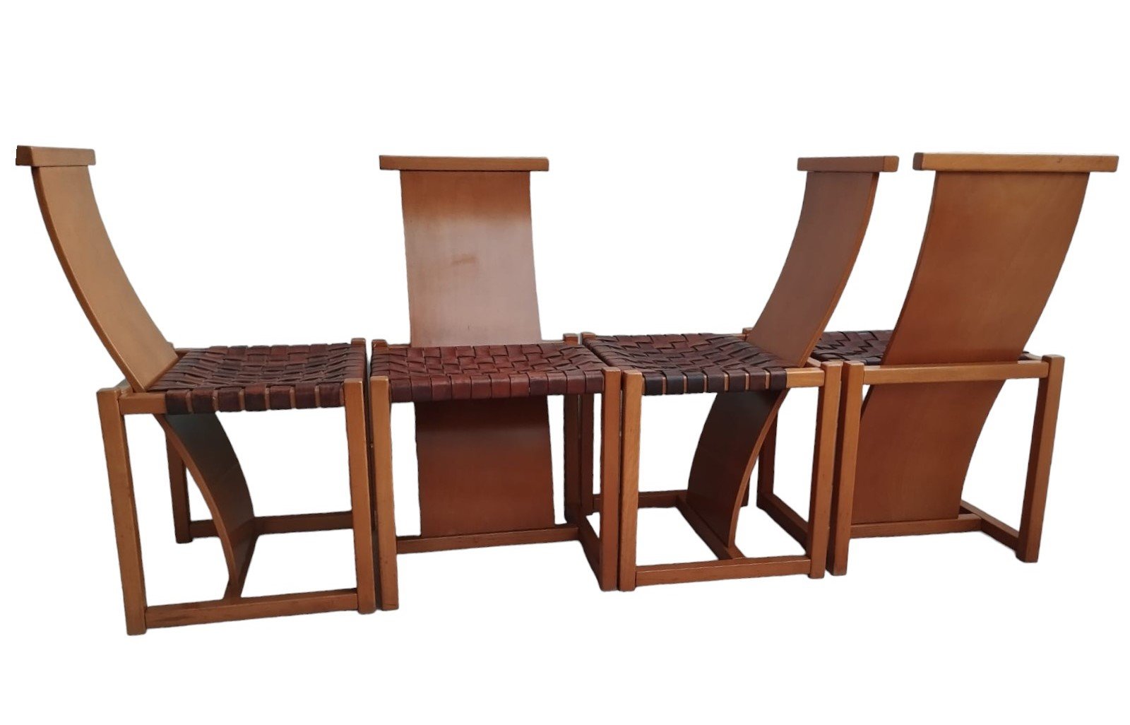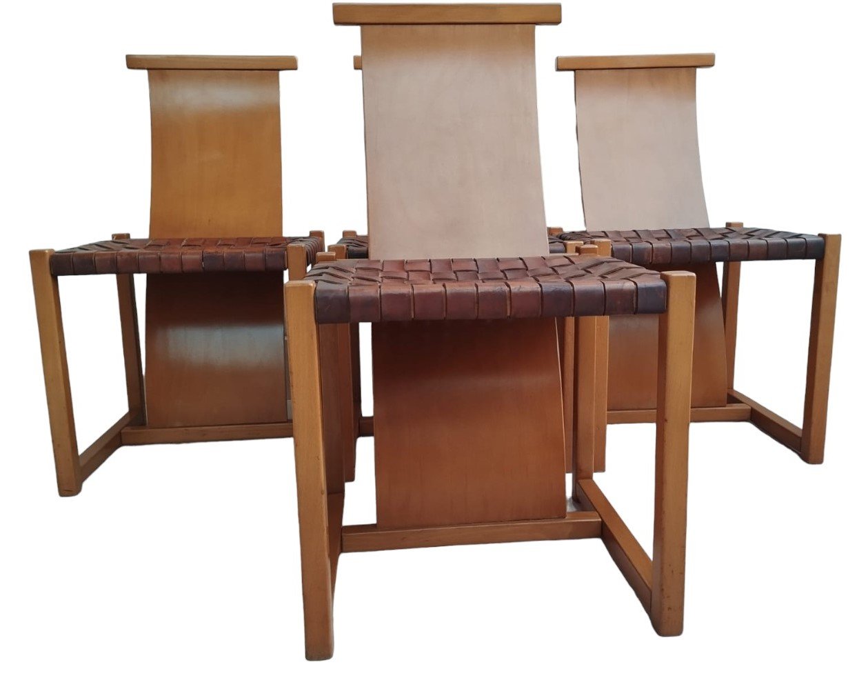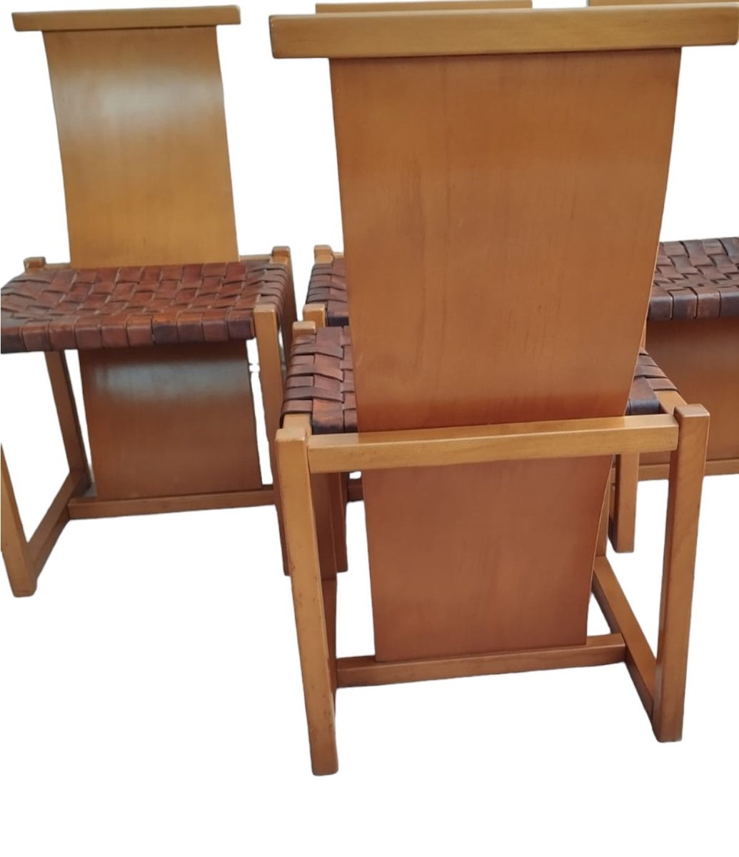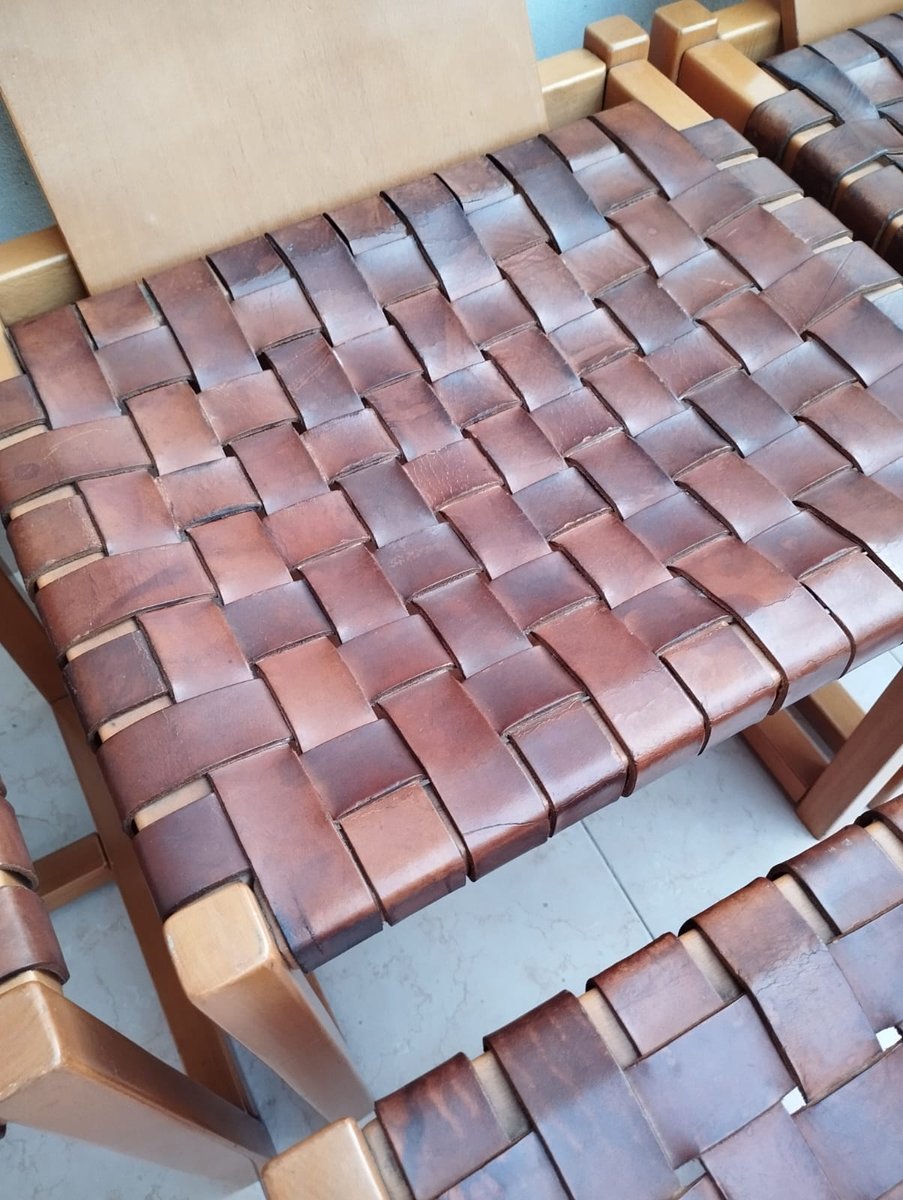 Italian Beech and Woven Leather Chairs, 1970s, Set of 4