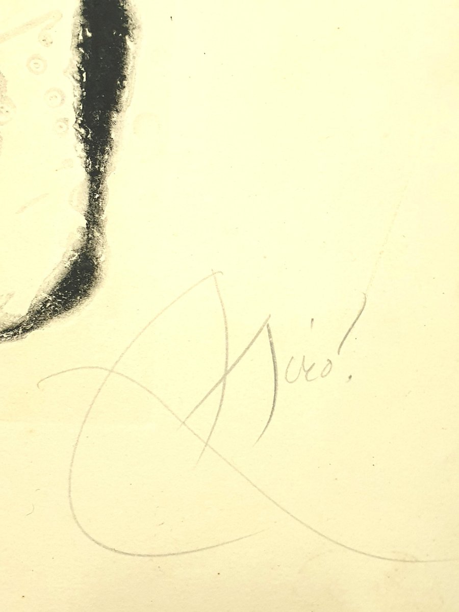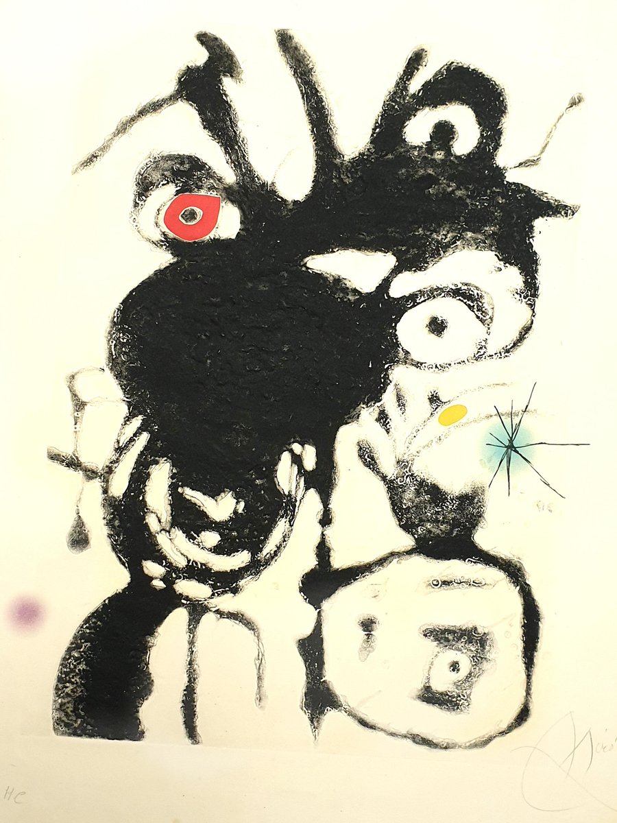 Joan Miro - Espriu - Original Hand Signed Etching Year: 1975 Hand Signed in pencil Edition: HC (Hors Commerce) aside from the edition of 50. On watermarked Sala Gaspar Publisher : Sala Gaspar, Barcelona Dimensions: 86.5 x 70 cm (paper) 68.5 x 49.5 cm (platemark) From: Espriu-Miró Reference: Dupin nº872 p.194 Biography Joan Miró i Ferrà (April 20,1893 – December 25,1983) was a world renowned Spanish Catalan painter, sculptor, and ceramist who was born in the sea port city of Barcelona. Miro was the son of a watchmaking father and a goldsmith mother, he was exposed to the arts from a very young age. There have been some drawings recovered by Miro dating to 1901, when he was only 8 years old. Miro enrolled at the School of Industrial and Fine Arts in Barcelona until 1910; during his attendance he was taught by Modest Urgell and Josep Pascó. After overcoming a serious bout of typhoid fever in 1911, Miro decided to devote his life entirely to painting by attending the school of art taught by Francesc Galí. He studied at La Lonja School of Fine Arts in Barcelona, and in 1918 set up his first individual exhibition in the Dalmau Galleries, in the same city. His works before 1920 (the date of his first trip to Paris) reflect the influence of different trends, like the pure and brilliant colors used in Fauvism, shapes taken from cubism, influences from folkloric Catalan art and Roman frescos from the churches. His trip to Paris introduced him to and developed his trend of surrealist painting. In 1921, he showed his first individual exhibition in Paris, at La Licorne Gallery. In 1928, he exhibited with a group of surrealists in the Pierre Gallery, also in Paris, although Miró was always to maintain his independent qualities with respect to groups and ideologies. From 1929-1930, Miró began to take interest in the object as such, in the form of collages. This was a practice which was to lead to his making of surrealist sculptures. His tormented monsters appeared during this decade, which gave way to the consolidation of his plastic vocabulary. He also experimented with many other artistic forms, such as engraving, lithography, water colors, pastels, and painting over copper. What is particularly highlighted from this period, are the two ceramic murals which he made for the UNESCO building in Paris (The Wall of the Moon and the Wall of the Sun, 1957-59). Joan Miro UNESCO Mural- “The Moon and The Sun” It was at the end of the 60´s when his final period was marked and which lasted until his death. During this time, he concentrated more and more on monumental and public works. He was characterized by the body language and freshness with which he carried out his canvases, as well as the special attention he paid to material and the stamp he received from informalism. He concentrated his interest on the symbol, not giving too much importance to the representing theme, but to the way the symbol emerged as the piece of work. Miro had a very eccentric style that is the embodiment of his unique approach to his artwork. In 1976 the Joan Miró Foundation Centre of Contemporary Art Study was officially opened in the city of Barcelona and in 1979, four years before his death, he was named Doctor Honoris Causa by the University of Barcelona.