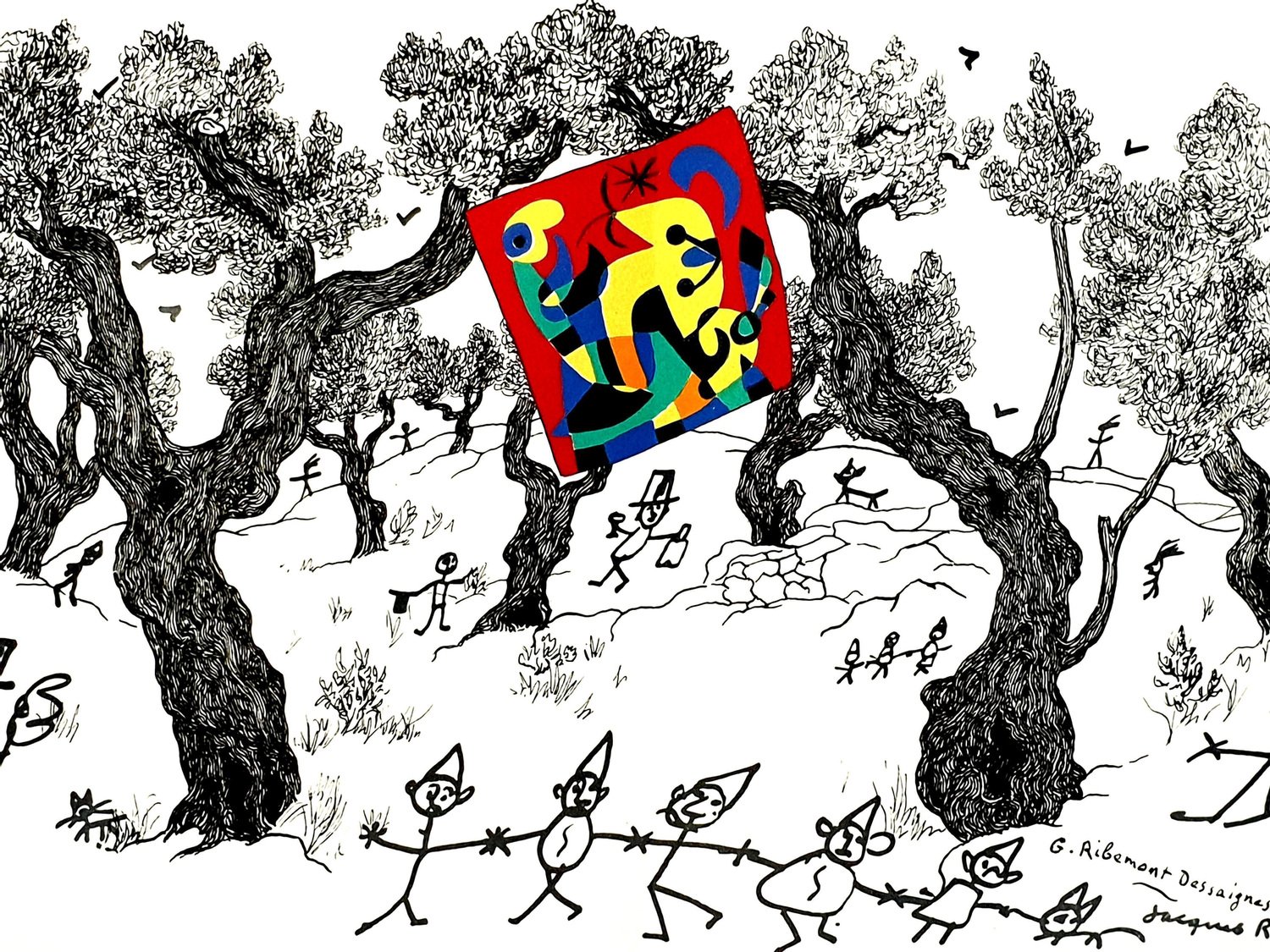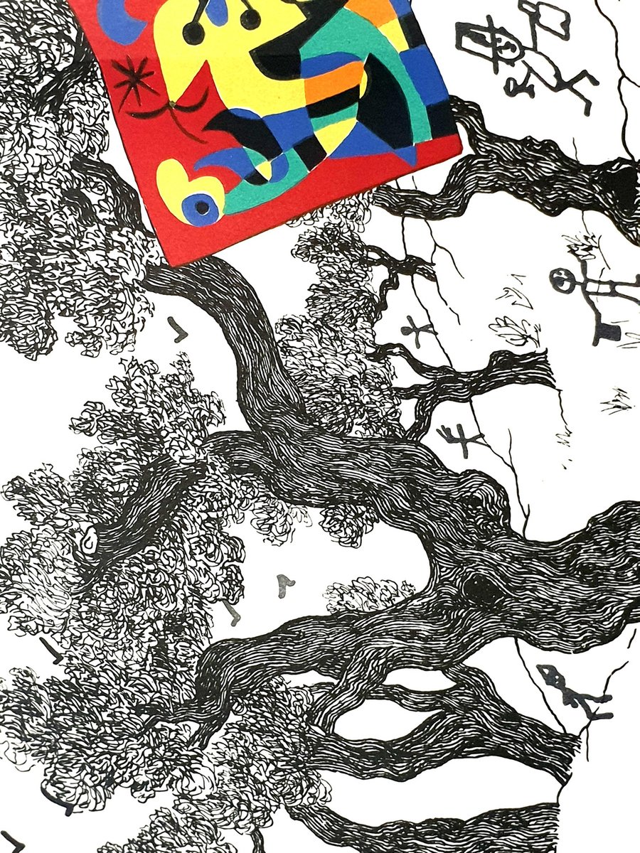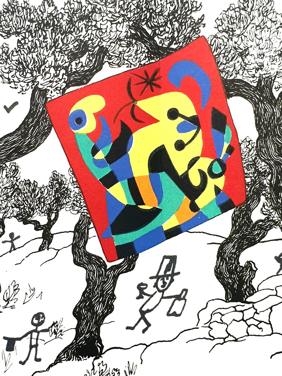 Joan Miro - The Party - Original Lithograph Artist: Joan Miro Editor: Maeght Year: 1956 Dimensions: 23 x 38 cm Reference: Mourlot 236 A unique collaboration between Miró (responsible for the central image), the art critic Georges Ribemont-Dessaignes (responsible for the trees and landscape) and the poet Jacques Prévert (responsible for the impish figures) Biography Joan Miró i Ferrà (April 20,1893 – December 25,1983) was a world renowned Spanish Catalan painter, sculptor, and ceramist who was born in the sea port city of Barcelona. Miro was the son of a watchmaking father and a goldsmith mother, he was exposed to the arts from a very young age. There have been some drwaings recovered by Miro dating to 1901, when he was only 8 years old. Miro enrolled at the School of Industrial and Fine Arts in Barcelona until 1910; during his attendance he was taught by Modest Urgell and Josep Pascó. After overcoming a serious bout of typhoid fever in 1911, Miro decided to devote his life entirely to painting by attending the school of art taught by Francesc Galí. He studied at La Lonja School of Fine Arts in Barcelona, and in 1918 set up his first individual exhibition in the Dalmau Galleries, in the same city. His works before 1920 (the date of his first trip to Paris) reflect the influence of different trends, like the pure and brilliant colors used in Fauvism, shapes taken from cubism, influences from folkloric Catalan art and Roman frescos from the churches. His trip to Paris introduced him to and developed his trend of surrealist painting. In 1921, he showed his first individual exhibition in Paris, at La Licorne Gallery. In 1928, he exhibited with a group of surrealists in the Pierre Gallery, also in Paris, although Miró was always to maintain his independent qualities with respect to groups and ideologies. From 1929-1930, Miró began to take interest in the object as such, in the form of collages. This was a practice which was to lead to his making of surrealist sculptures. His tormented monsters appeared during this decade, which gave way to the consolidation of his plastic vocabulary. He also experimented with many other artistic forms, such as engraving, lithography, water colors, pastels, and painting over copper. What is particularly highlighted from this period, are the two ceramic murals which he made for the UNESCO building in Paris (The Wall of the Moon and the Wall of the Sun, 1957-59). Joan Miro UNESCO Mural- “The Moon and The Sun” It was at the end of the 60´s when his final period was marked and which lasted until his death. During this time, he concentrated more and more on monumental and public works. He was characterized by the body language and freshness with which he carried out his canvasses, as well as the special attention he paid to material and the stamp he received from informalism. He concentrated his interest on the symbol, not giving too much importance to the representing theme, but to the way the symbol emerged as the piece of work. Miro had a very eccentric style that is the embodiment of his unique approach to his artwork. In 1976 the Joan Miró Foundation Centre of Contemporary Art Study was officially opened in the city of Barcelona and in 1979, four years before his death, he was named Doctor Honoris Causa by the University of Barcelona.