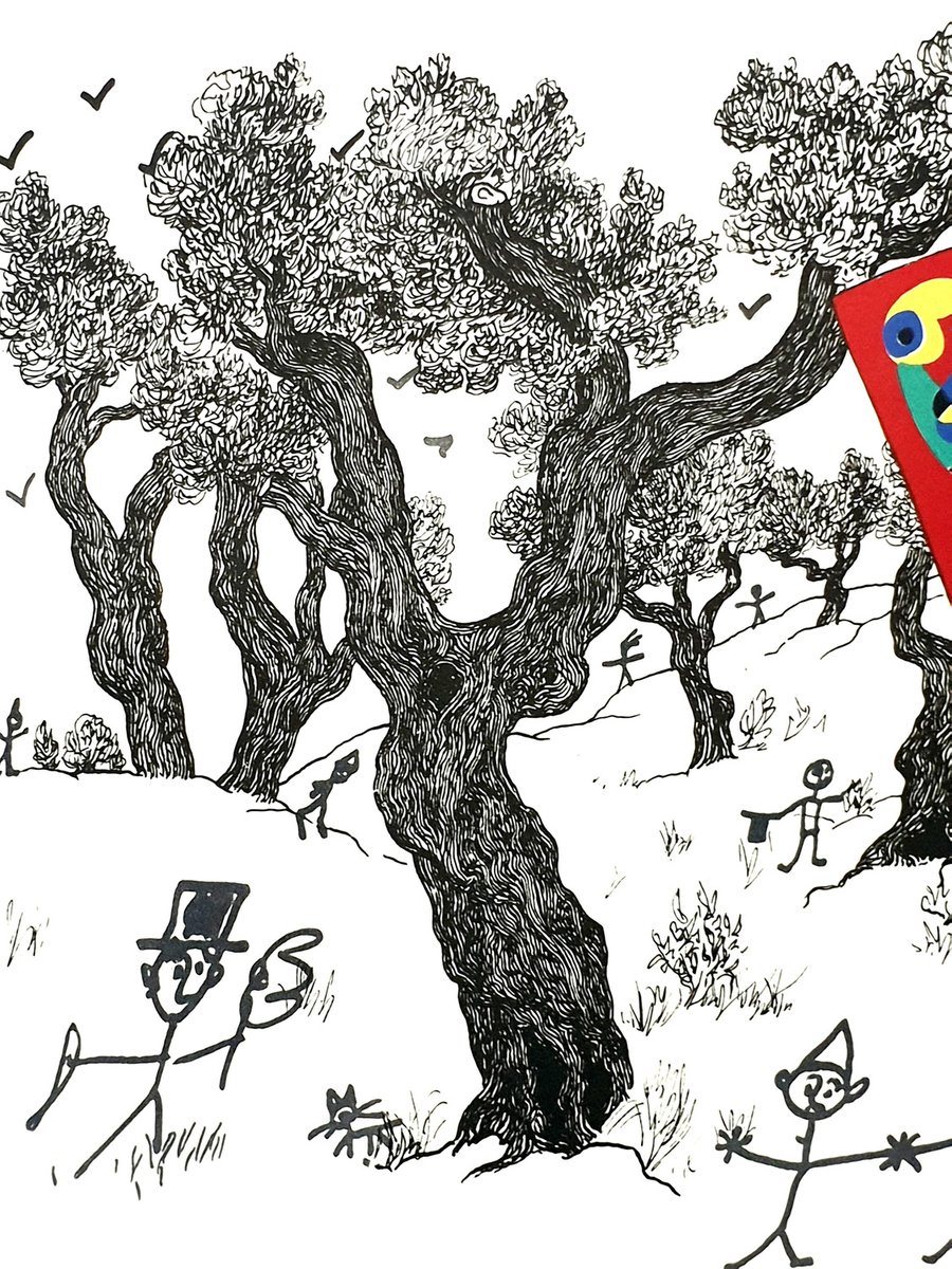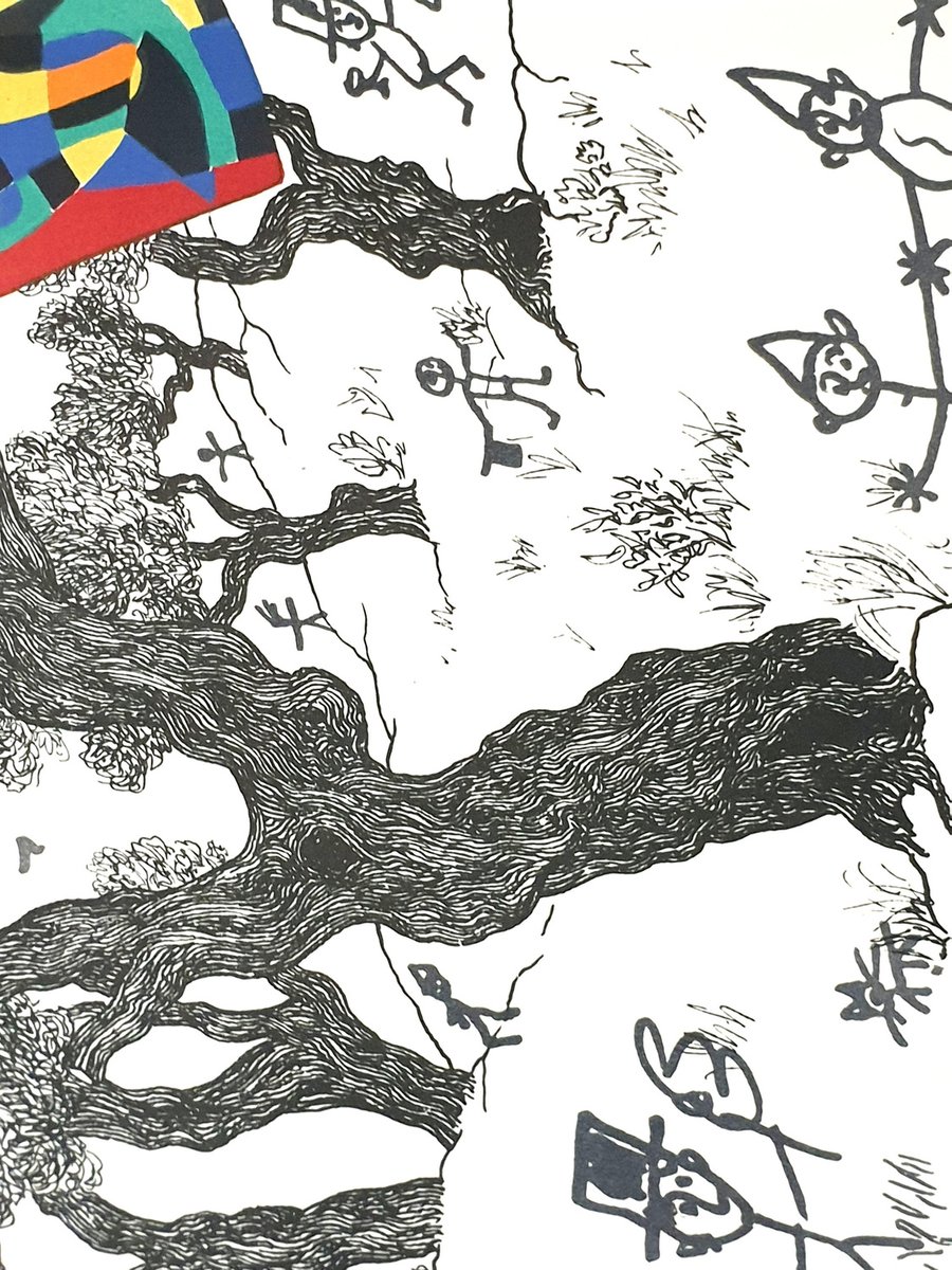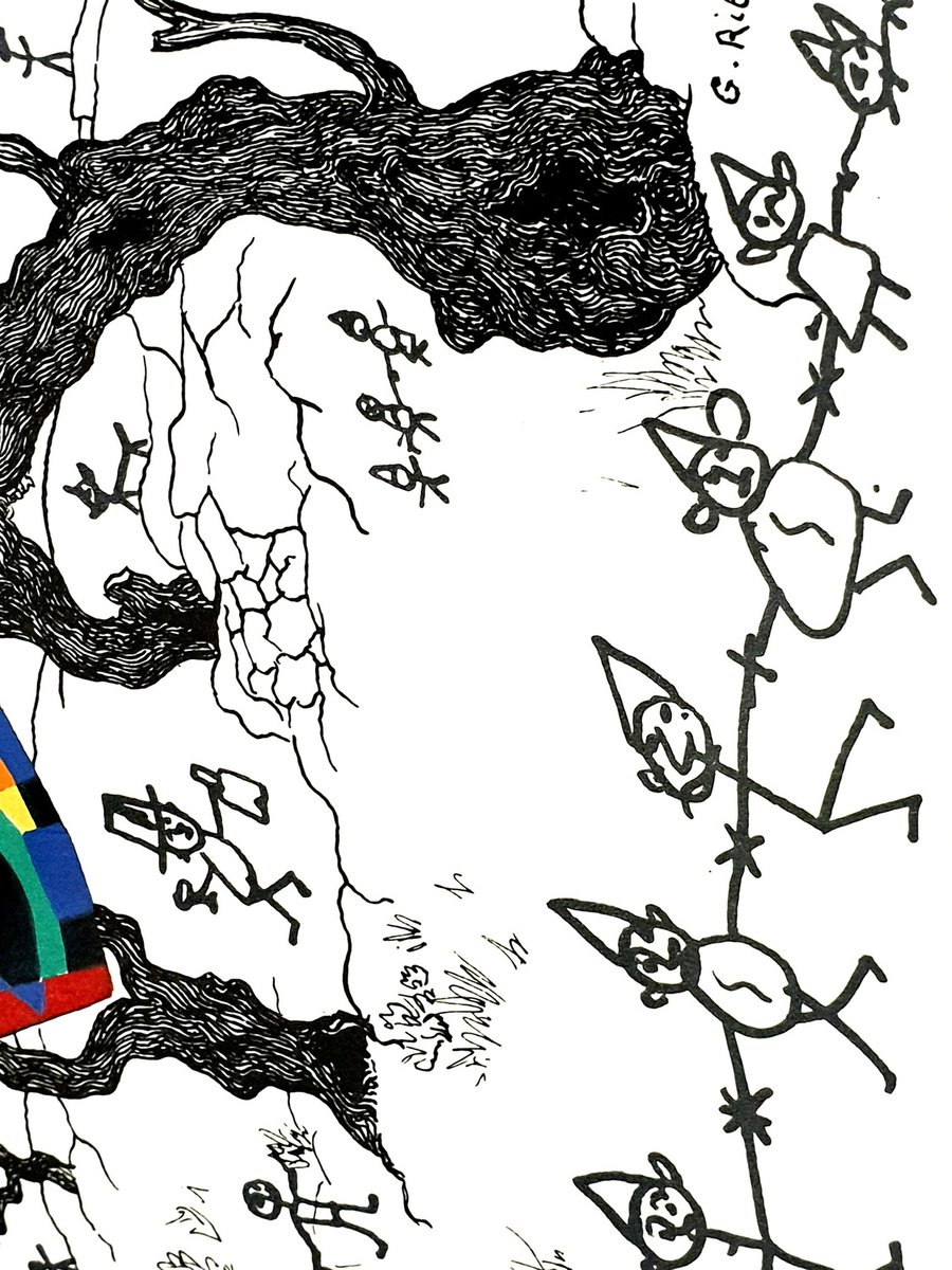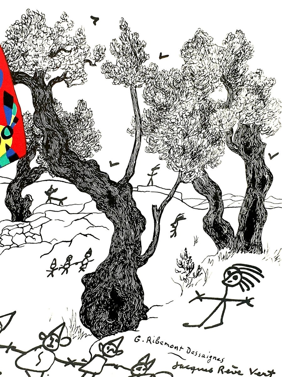 Joan Miro - The Party - Original Lithograph Artist: Joan Miro Editor: Maeght Year: 1956 Dimensions: 23 x 38 cm Reference: Mourlot 236 A unique collaboration between Miró (responsible for the central image), the art critic Georges Ribemont-Dessaignes (responsible for the trees and landscape) and the poet Jacques Prévert (responsible for the impish figures) Biography Joan Miró i Ferrà (April 20,1893 – December 25,1983) was a world renowned Spanish Catalan painter, sculptor, and ceramist who was born in the sea port city of Barcelona. Miro was the son of a watchmaking father and a goldsmith mother, he was exposed to the arts from a very young age. There have been some drwaings recovered by Miro dating to 1901, when he was only 8 years old. Miro enrolled at the School of Industrial and Fine Arts in Barcelona until 1910; during his attendance he was taught by Modest Urgell and Josep Pascó. After overcoming a serious bout of typhoid fever in 1911, Miro decided to devote his life entirely to painting by attending the school of art taught by Francesc Galí. He studied at La Lonja School of Fine Arts in Barcelona, and in 1918 set up his first individual exhibition in the Dalmau Galleries, in the same city. His works before 1920 (the date of his first trip to Paris) reflect the influence of different trends, like the pure and brilliant colors used in Fauvism, shapes taken from cubism, influences from folkloric Catalan art and Roman frescos from the churches. His trip to Paris introduced him to and developed his trend of surrealist painting. In 1921, he showed his first individual exhibition in Paris, at La Licorne Gallery. In 1928, he exhibited with a group of surrealists in the Pierre Gallery, also in Paris, although Miró was always to maintain his independent qualities with respect to groups and ideologies. From 1929-1930, Miró began to take interest in the object as such, in the form of collages. This was a practice which was to lead to his making of surrealist sculptures. His tormented monsters appeared during this decade, which gave way to the consolidation of his plastic vocabulary. He also experimented with many other artistic forms, such as engraving, lithography, water colors, pastels, and painting over copper. What is particularly highlighted from this period, are the two ceramic murals which he made for the UNESCO building in Paris (The Wall of the Moon and the Wall of the Sun, 1957-59). Joan Miro UNESCO Mural- “The Moon and The Sun” It was at the end of the 60´s when his final period was marked and which lasted until his death. During this time, he concentrated more and more on monumental and public works. He was characterized by the body language and freshness with which he carried out his canvasses, as well as the special attention he paid to material and the stamp he received from informalism. He concentrated his interest on the symbol, not giving too much importance to the representing theme, but to the way the symbol emerged as the piece of work. Miro had a very eccentric style that is the embodiment of his unique approach to his artwork. In 1976 the Joan Miró Foundation Centre of Contemporary Art Study was officially opened in the city of Barcelona and in 1979, four years before his death, he was named Doctor Honoris Causa by the University of Barcelona.