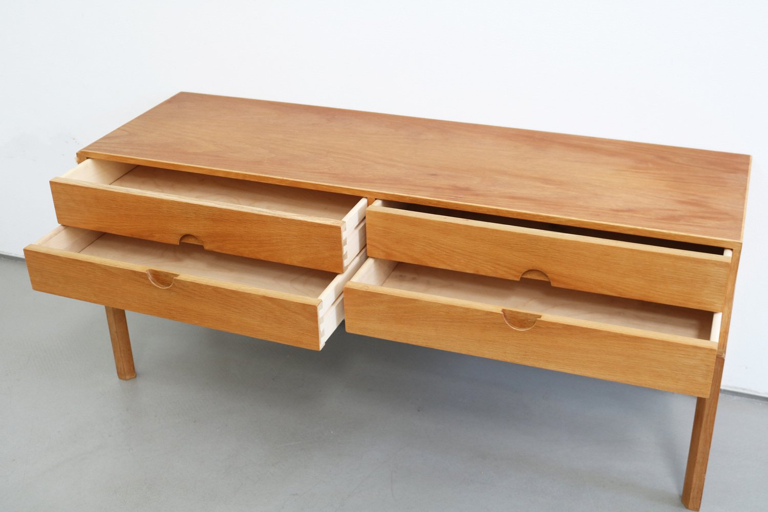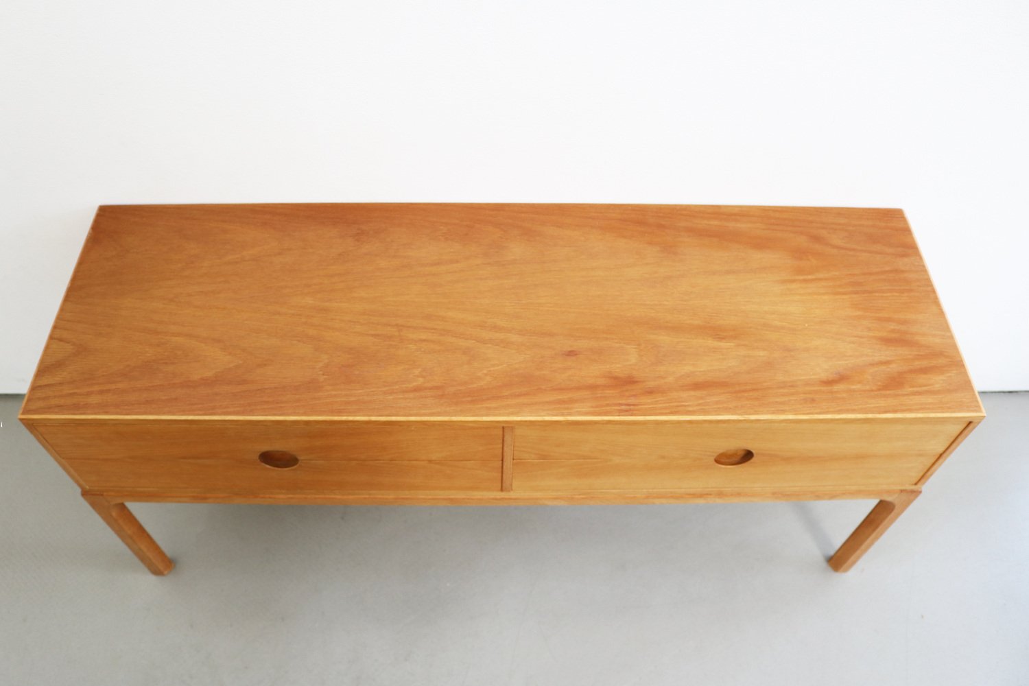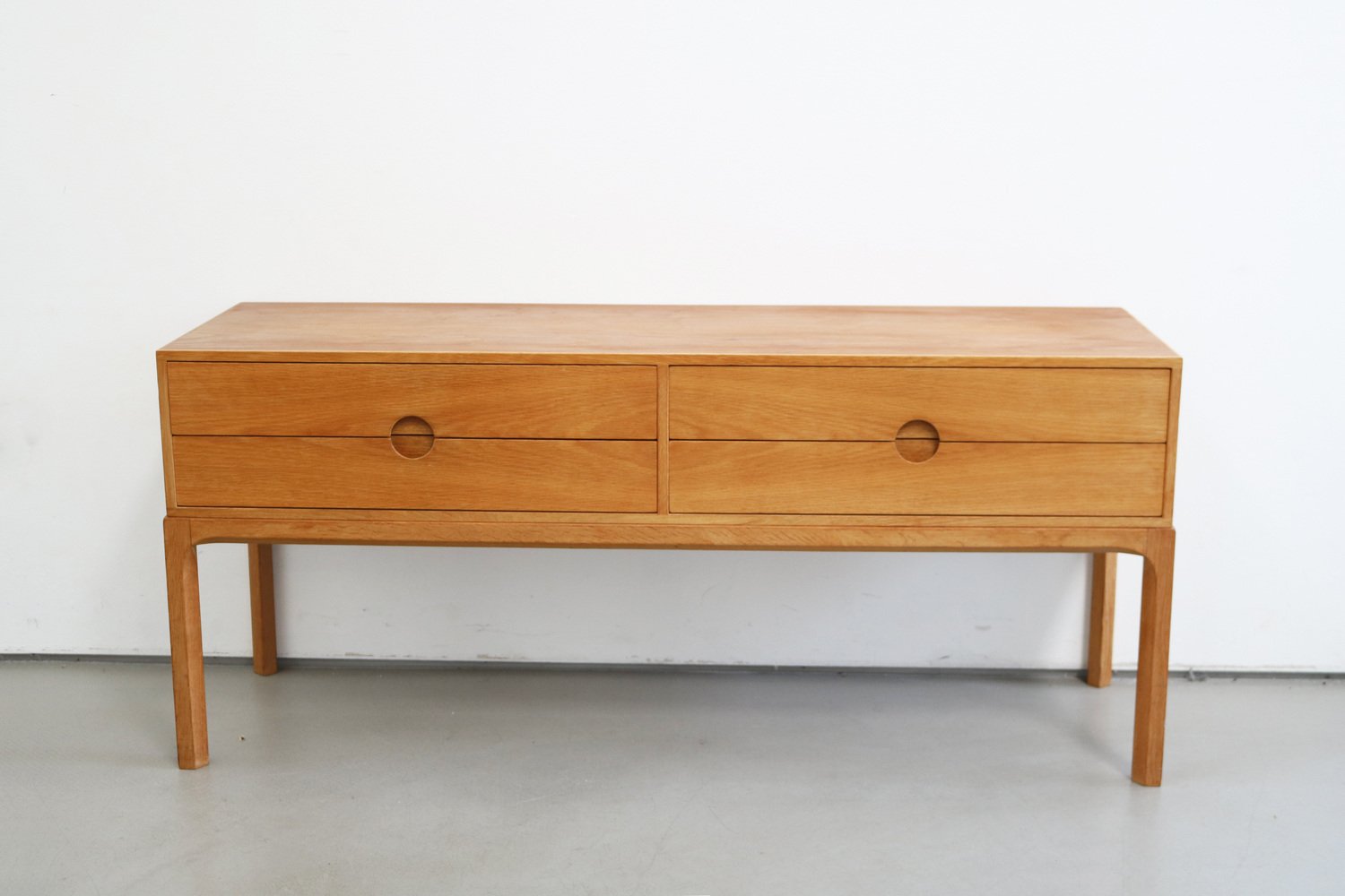In true Danish modern fashion, Kristiansen favored well-joined teak and rosewood, evident equally in his chairs, desks, sideboards, and wall units. In 1956, he designed his most celebrated work, the No. 42 Chair for Schou Andersen. The organically curved back and pivoted armrests form a chair that is as beautiful as it is comfortable. The No. 42 was well-received by critics and enjoyed continued success as one of the most enduring Danish designs of the 20th century.