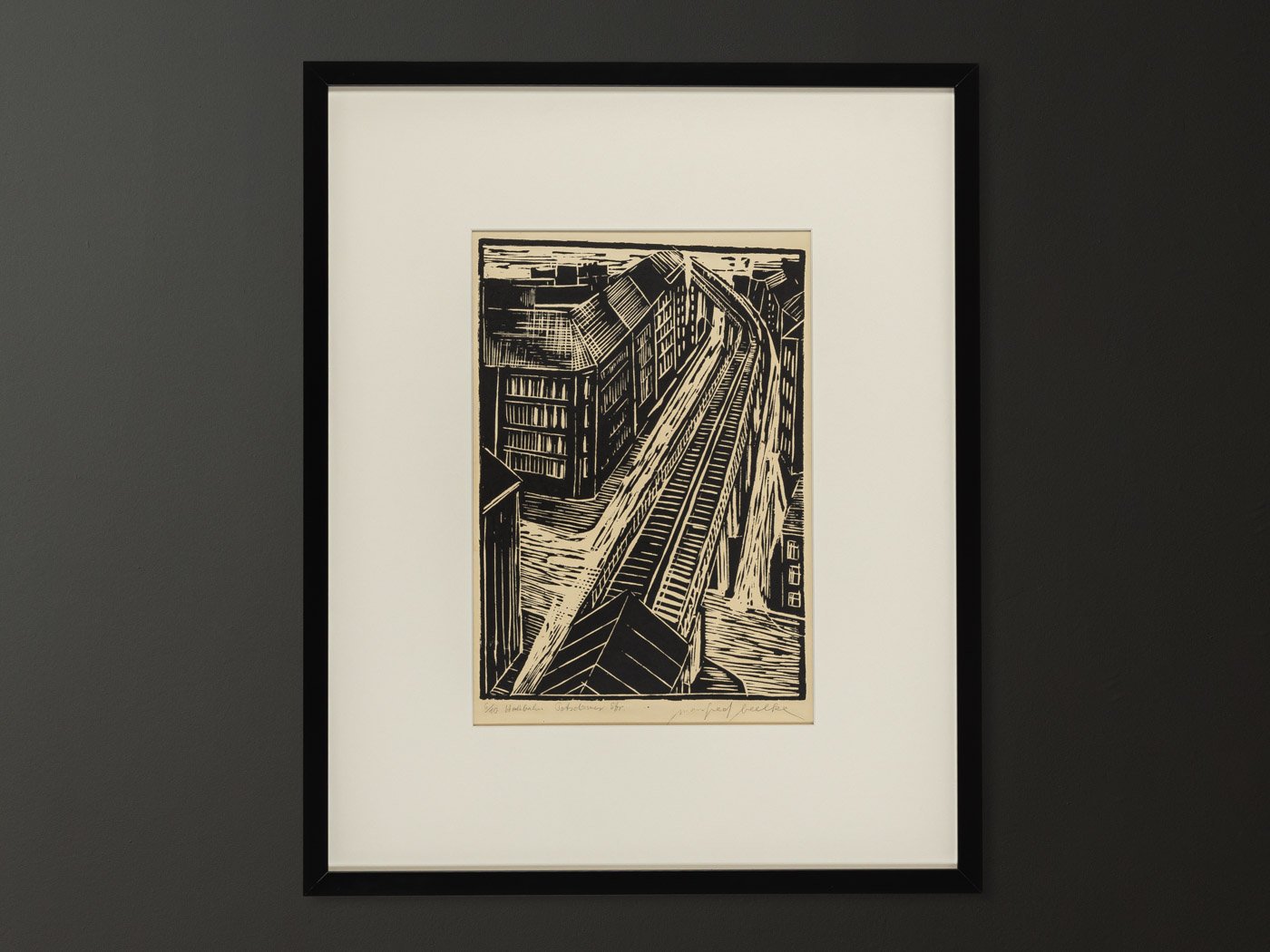 Manfred Beelke, Potsdamer Strasse Elevated Railroad, Black and White Linocut on Paper, Framed