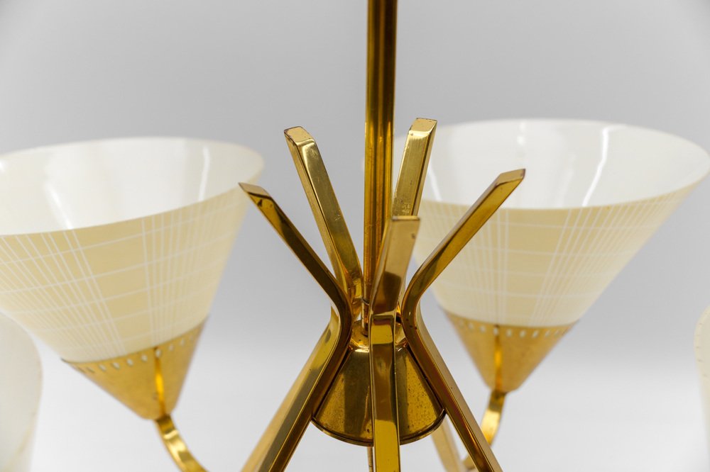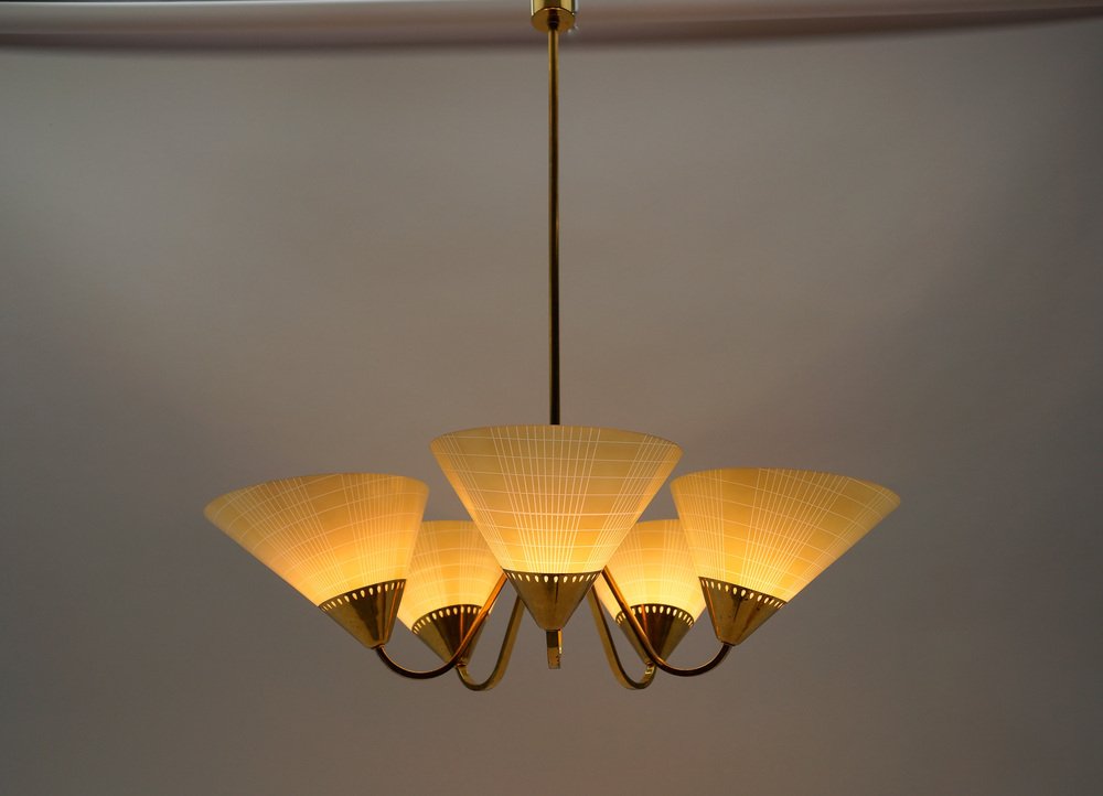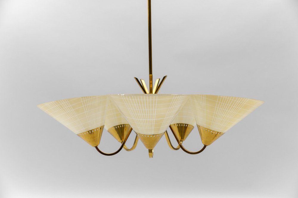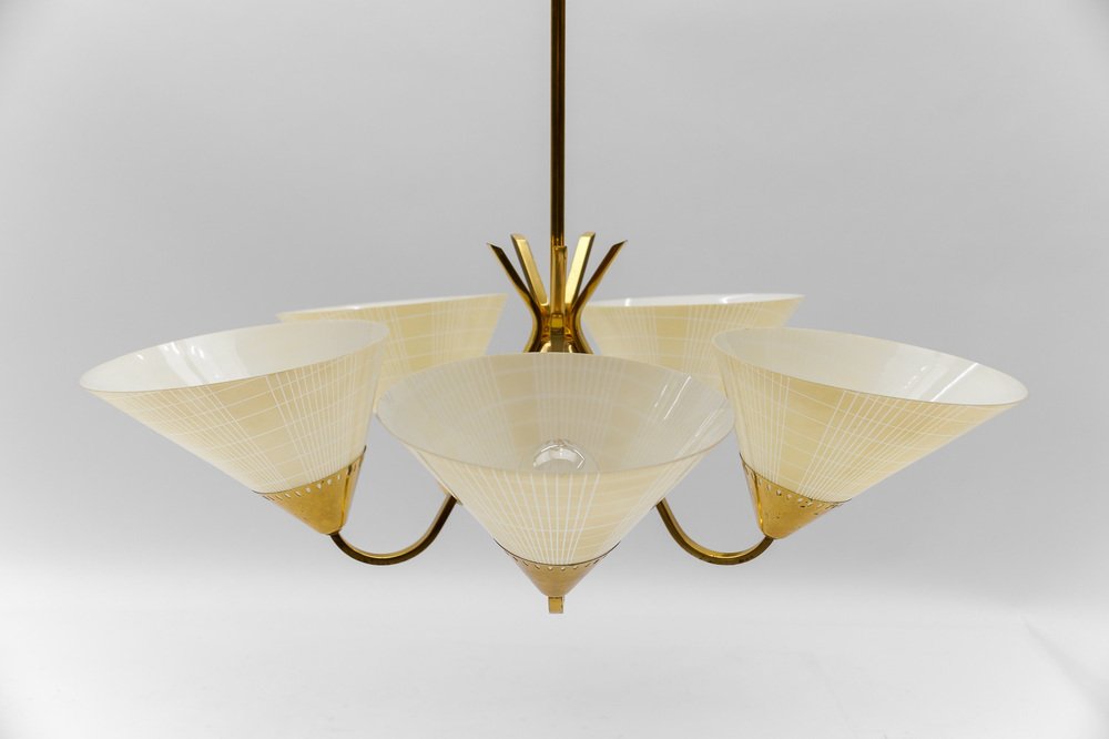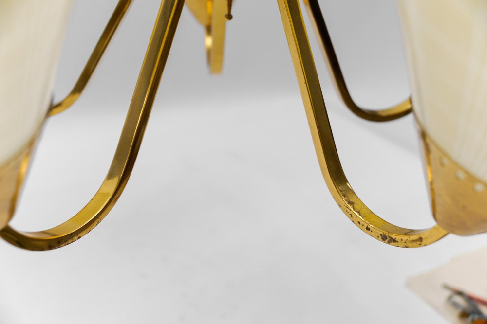Mid-Century 5-Light Glass & Brass Ceiling Lamp, 1950s