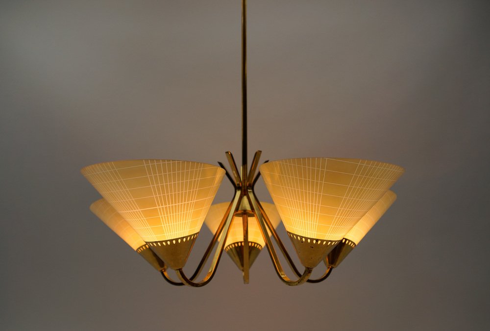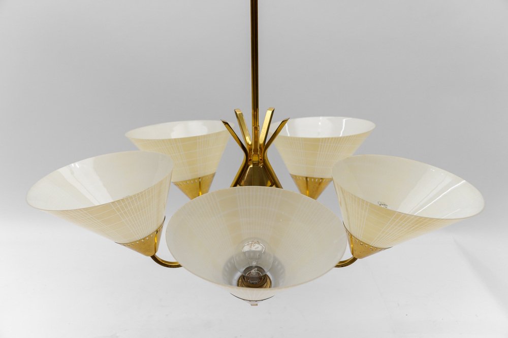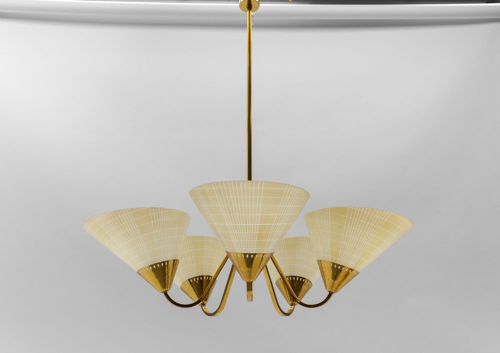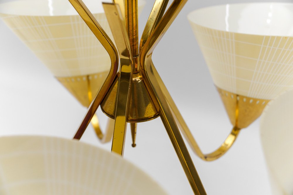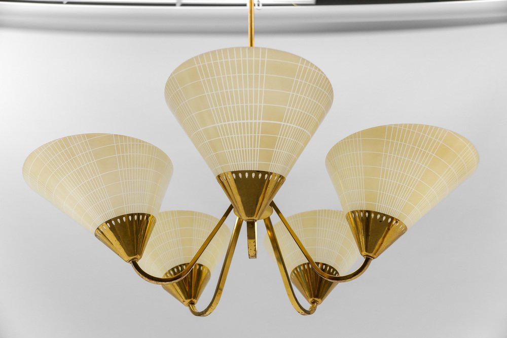 Mid-Century 5-Light Glass & Brass Ceiling Lamp, 1950s